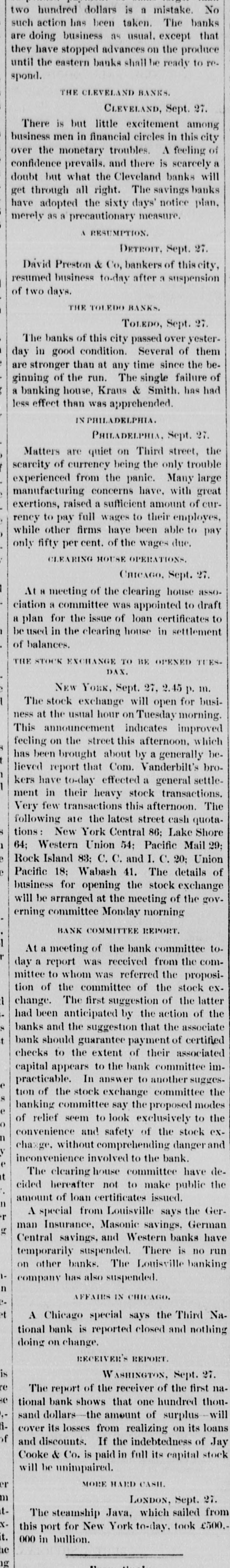 two hundred dollars is a mistake. No such action has been taken. The banks are doing business as usual, except that they have stopped advances on the produce until the eastern banks shall be ready to respond. ### THE CLEVELAND BANKS. CLEVELAND, Sept. 27. There is but little excitement among business men in financial circles in this city over the monetary troubles. A feeling of confidence prevails, and there is scarcely a doubt but what the Cleveland banks will get through all right. The savings banks have adopted the sixty days' notice plan, merely as a precautionary measure. A RESUMPTION. DETROIT, Sept. 27. David Preston & Co, bankers of this city, resumed business to-day after a suspension of two days. ### THE TOLEDO BANKS. TOLEDO, Sept. 27. The banks of this city passed over yesterday in good condition. Several of them are stronger than at any time since the beginning of the run. The single failure of a banking house, Kraus & Smith, has had less effect than was apprehended. IN PHILADELPHIA. PHILADELPHIA, Sept. 27. Matters are quiet on Third street, the scarcity of currency being the only trouble experienced from the panic. Many large manufacturing concerns have, with great exertions, raised a sufficient amount of currency to pay full wages to their employes, while other firms have been able to pay only fifty per cent. of the wages due. CLEARING HOUSE OPERATIONS, CHICAGO, Sept. 27. At a meeting of the clearing house association a committee was appointed to draft a plan for the issue of loan certificates to be used in the clearing house in settlement of balances. ### THE STOCK EXCHANGE TO BE OPENED TUESDAY. NEW YORK, Sept. 27, 2.45 p. m. The stock exchange will open for business at the usual hour on Tuesday morning. This announcement indicates improved feeling on the street this afternoon, which has been brought about by a generally believed report that Com. Vanderbilt's brokers have to-day effected a general settlement in their heavy stock transactions. Very few transactions this afternoon. The following are the latest street cash quotations: New York Central 86; Lake Shore 64; Western Union 54; Pacific Mail 29; Rock Island 83; C. C. and I. C. 20; Union Pacific 18; Wabash 41. The details of business for opening the stock exchange will be arranged at the meeting of the governing committee Monday morning BANK COMMITTEE REPORT. At a meeting of the bank committee to-day a report was received from the committee to whom was referred the proposition of the committee of the stock exchange. The first suggestion of the latter had been anticipated by the action of the banks and the suggestion that the associate bank should guarantee payment of certified checks to the extent of their associated capital appears to the bank committee impracticable. In answer to another suggestion of the stock exchange committee the banking committee say the proposed modes of relief seem to look exclusively to the convenience and safety of the stock exchange, without comprehending danger and inconvenience involved to the bank. The clearing house committee have decided hereafter not to make public the amount of loan certificates issued. A special from Louisville says the German Insurance, Masonic savings, German Central savings, and Western banks have temporarily suspended. There is no run on other banks. The Louisville banking company has also suspended. AFFAIRS IN CHICAGO. A Chicago special says the Third National bank is reported closed and nothing doing on change. RECEIVER'S REPORT. WASHINGTON, Sept. 27. The report of the receiver of the first national bank shows that one hundred thousand dollars—the amount of surplus—will cover its losses from realizing on its loans and discounts. If the indebtedness of Jay Cooke & Co. is paid in full its capital stock will be unimpaired. MORE HARD CASH. LONDON, Sept. 27. The steamship Java, which sailed from this port for New York to-day, took £500,000 in bullion.
