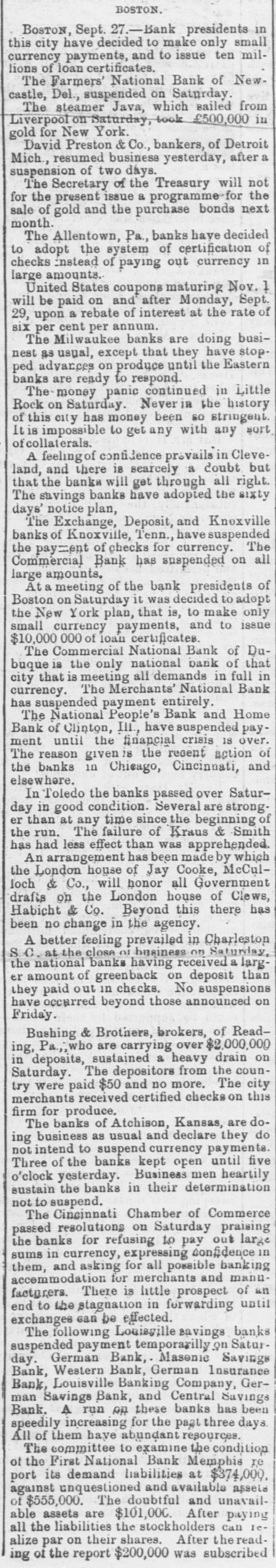 BOSTON. BOSTON, Sept. 27.-Bank presidents this city have decided to make only small currency payments, and to issue ten millions of loan certificates. The Farmers' National Bank of Newcastle, Del., suspended on Saturday. The steamer Java, which sailed from Liverpool on Saturday, took £500,000 in gold for New York. David Preston & Co., bankers, of Detroit Mich., resumed business yesterday, after suspension of two days. The Secretary of the Treasury will not for the present issue a programme for the sale of gold and the purchase bonds next month. The Allentown, Pa., banks have decided to the of checks Enstead of out currency in adopt system paying of certification large amounts. United States coupons maturing Nov. will be paid on and after Monday, Sept. 29, upon a rebate of interest at the rate of six per cent per annum. The Milwaukee banks are doing businest as usual, except that they have stop. ped advances on produce until the Eastern banks are ready to respond. The panic continued in Little Rock on in of this so city money Saturday. has money Never been the stringent. history It is impossible to get any with any sort collaterals. A feeling of confidence provails in Cleveland, and there is searcely a that the banks will get through coubt all right. but The savings banks have adopted the sixty days' notice plan, The Exchange, Deposit, and Knoxville banks of Knoxville, Tenn., have suspended the pay- of checks for currency. The Commercial Bank has suspended on all large amounts. At: meeting of the bank presidents of Boston on Saturday it was decided to adopt the New York plan, that is, to make only small currency payments, and to issue $10,000 000 of loan certificates. The Commercial National Bank of Dubuque is the only national bank of that city that is meeting all demands in full in currency. The Merchants' National Bank has suspended payment entirely. The National People's Bank and Home Bank of Clinton, III., have suspended payment until the financial crisis 18 over. The reason given 18 the regent action of the banks in Chicago, Cincinnati, and elsewhere. In Toledo the banks passed over Saturday in good condition. Several are stronger than at any time since the beginning of the run. The failure of Kraus & Smith has had less effect than was apprehended. An arrangement has been made by which the London house of Jay Cooke, McCulloch & Co., will honor all Government drafts on the London house of Clews, Habicht & Co. Beyond this there has been no change in the agency. A better feeling prevailed in Charleston S.C. at the close of business on Saturday, the national banks having received a larger amount of greenback on deposit than they paid out in checks. No suspensions have occurred beyond those announced on Friday. Bushing & Brothers, brokers, of Reading, Pa., who are carrying over $2,000,000 in a on The counSaturday. deposits, were paid sustained $50 depositors and heavy from the drain The try no more. city merchants received certified checks on this firm for produce. The banks of Atchison, Kansas, are doing business as usual and declare they do ot intend to suspend currency payments. Three of the banks kept open until five o'clock yesterday. Business men heartily sustain the banks in their determination not to suspend. The Cincinnati Chamber of Commerce passed resolutions on Saturday praising the for to sums in banks in currency, refusing expressing for all possible pay confidence out banking large them, and asking accommodation for merchants and manu facturers. There is little prospect of an end to the stagnation in forwarding until exchanges can be effected. The following Louisyille savings banks suspended payment temporarilly on Saturday. German Bank, Masonic Savings Bank, Western Bank, German Insurance Bank, Louisville Banking Company, German Savings Bank, and Central Savings Bank. A run on these banks has been speedily increasing for the pagi three days All of them have abundant resources. The committee to examine the condition ot the First National Bank Memphis re port its demand liabilities at $374,000. against unquestioned and available assets of $555,000. The doubtful and unavailable assets are $101,00C. After paying all the liabilities the stockholders can Iealize par on their shares. After the reading of the report $200,000 was subscribed