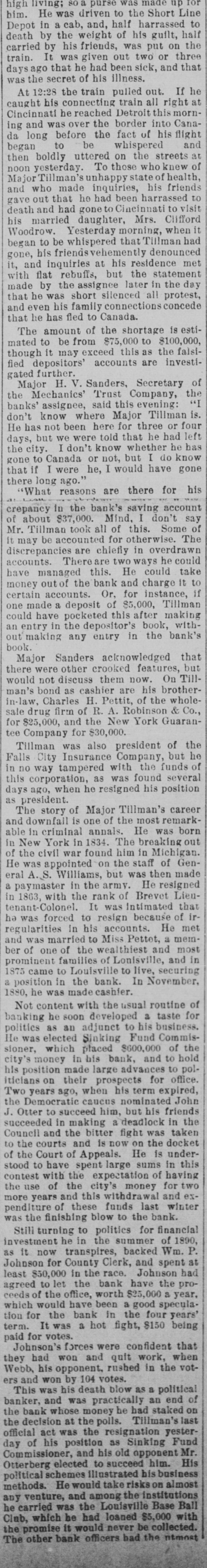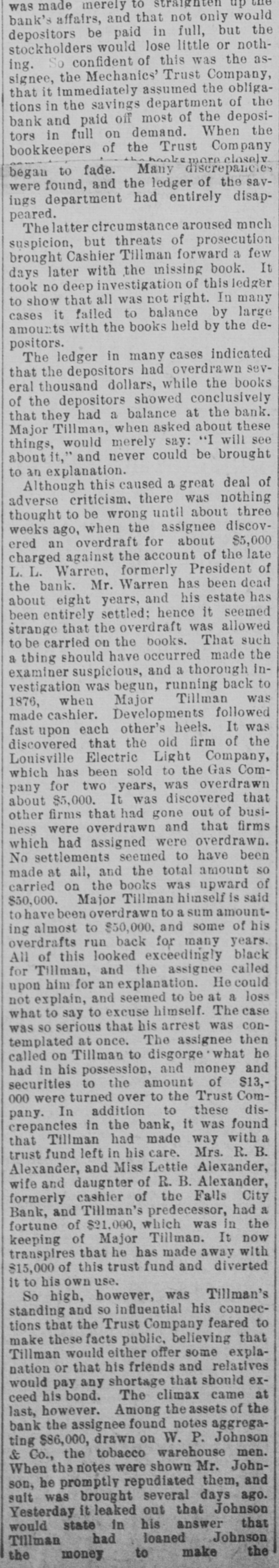 was made merely to would bank's affairs, and that not only the depositors be paid in full, but stockholders would lose little or nothSo confident of this was the asing. the Mechanics' Trust Company, signee, that it immediately assumed the obliga- the tions in the savings department of bank and paid off most of the deposi- the in full on demand. When bookkeepers tors of the Trust Company manke closely began to fade. Many discrepancies found, and the ledger of the savings were department had entirely disappeared. Thelatter circumstance aroused mnch but threats of prosecution few suspicion, brought Cashier Tillman forward a It days later with the missing book. took no deep investigation of thisledger show that all was not right. In many to it failed to balance by large amounts cases with the books held by the depositors. The ledger in many cases indicated that the depositors had overdrawn several thousand dollars, while the books the depositors showed conclusively of that they had a balance at the bank. these Major Tillman, when asked about see things, would merely say: "I will about it," and never could be brought to an explanation. Although this caused a great deal of adverse criticism. there was nothing thought to be wrong until about three weeks ago, when the assignee discovered an overdraft for about $5,000 charged against the account of the late L. Warren, formerly President of the L. bank. Mr. Warren has been dead has about eight years, and his estate been entirely settled: hence it seemed strange that the overdraft was allowed such to be carried on the books. That a tbing should have occurred made the inexaminer suspicious, and a thorough vestigation was begun, running back was to when Major Tillman made 1876, cashier. Developments followed fast upon each other's heels. It was the discovered that the old firm of Louisville Electric Light Company, Comwhich has been sold to the Gas for two years, was overdrawn about pany $5,000. It was discovered that other firms that had gone out of firms busiwere overdrawn and that ness which had assigned were overdrawn. No settlements seemed to have been made at all, and the total amount so carried on the books was upward of $50,000. Major Tillman himself is said to have been overdrawn to a sum amountalmost to $50,000. and some of his ing overdrafts run back for many years. of this looked exceedingly called black All Tillman, and the assignee for him for an explanation. He could loss upon explain, and seemed to be at a not what to say to excuse himself. The case so serious that his arrest was conwas templated at once. The assignee then he called on Tillman to disgorge what and had in his possession, and money securities to the amount of $13,were turned over to the Trust Com- dis000 In addition to these found crepancies pany. in the bank, it was Tillman had made way with a trust that fund left in his care. Mrs. R. B. Alexander, and Miss Lettie Alexander, wife and daughter of R. B. Alexander, City formerly cashier of the Falls had and Tillman's predecessor, the a fortune Bank, of $21,000, which was in keeping of Major Tillman. It with now transpires that he has made away $15,000 of this trust fund and diverted it to his own use. So high, however, was Tillman's standing and so influential his connec- to tions that the Trust Company feared that make these facts public, believing Tillman would either offer some explanation or that his friends and relatives would pay any shortage that should ex- at his bond. The climax came last, ceed however. Among the assets of the bank the assignee found notes aggrega$86,000, drawn on W. P. Johnson ting Co., the tobacco warehouse John- men. & When the notes were shown Mr. and he promptly repudiated them, son, suit was brought several days ago. Yesterday it leaked out that Johnson that state in his answer to Tillman would had loaned Johnson the make the money