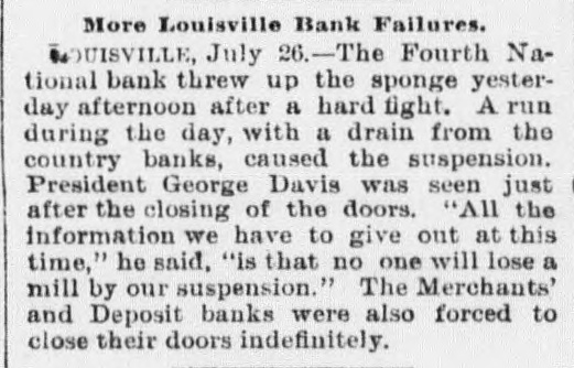 A telegram from Washington says: The following national banks, which recently suspended payment, have been permitted to reopen their doors for business: The State national bank of Denver, Col.; the Louisville city national bank, of Louisville, Ky.; the Merchants' bank of Louisville; Ky.; the First national bank of Ashland, Wis., and the First national bank of Platteville, Wis.; the German national bank of Denver, Col.; the First national bank of Canon City, Col.