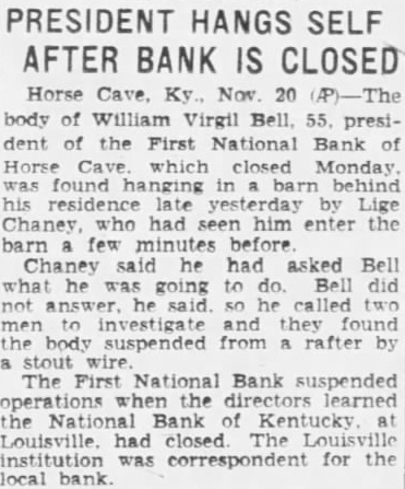Horse Cave. Ky. Nov. 20 (P)-The body of William Virgil Bell, 55, president of the First National Bank of Horse Cave which closed Monday was found hanging in barn behind his residence late yesterday by Lige Chaney, who had seen him enter the barn few minutes before Chaney said he had asked Bell what he was going to do Bell did not he so he called two men to investigate and they found the body suspended from a rafter by a stout wire The First National Bank suspended operations when the directors learned the National Bank of Kentucky at Louisville had closed The Louisville institution was correspondent for the local bank.