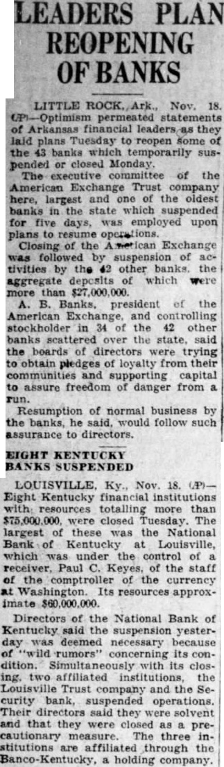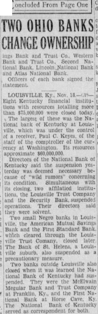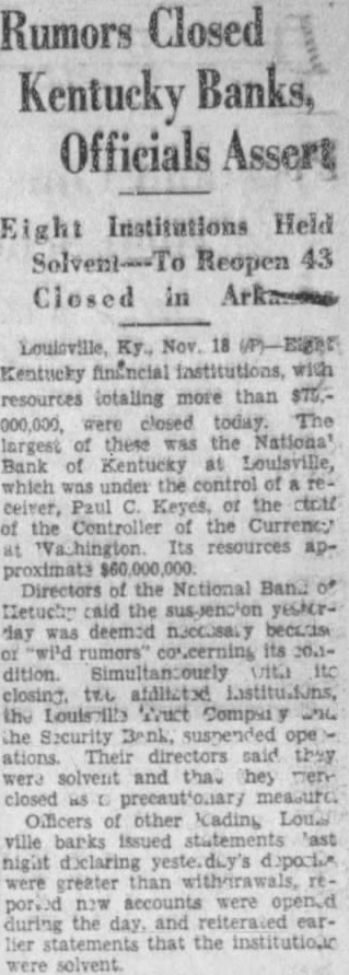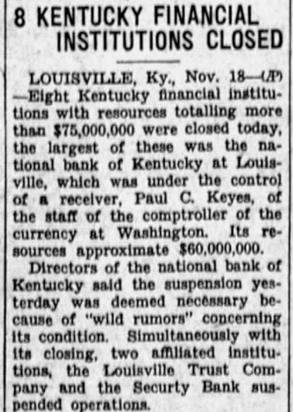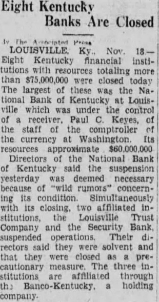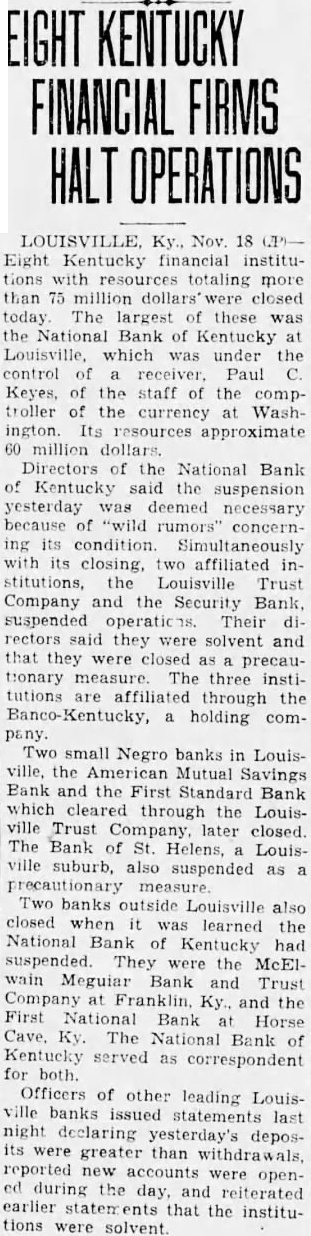 Nov. Eight Kentucky financial instituresources more than million dollars closed largest these the National Bank Kentucky Louisville, which under the control receiver Paul Keyes. the staff of the comptroller currency Washington. resources approximate million dollars. Directors the National Bank Kentucky the suspension yesterday deemed necessary because "wild rumors" concerning its condition its closing, affiliated Trust Company and the Security Bank, suspended Their rectors they were solvent and that they closed precautionary The institutions through the holding comsmall Negro banks in Louisville, Mutual Savings Bank and the First Standard Bank which through the Louisville Trust closed. The Bank of Helens, Louissuburb, suspended banks Louisville also closed when learned the National Bank Kentucky suspended. were the McElwain Bank and Trust Company Franklin. Ky., and the National Bank Horse Cave. National Bank Kentucky served correspondent both. Officers of other leading Louisville banks issued statements last night declaring deposits than greater reported accounts were openduring the day, and reiterated earlier that the institutions were