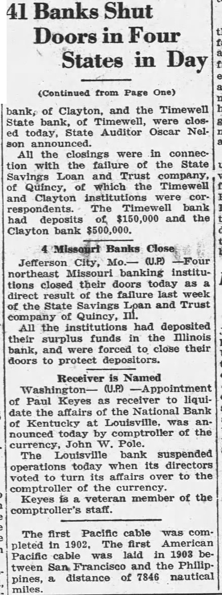 (Continued from Page One) bank, of Clayton, and the Timewell State bank, of Timewell, were closed today, State Auditor Oscar Nelson announced. All the closings were in connection with the failure of the State Savings Loan and Trust company, Quincy, which the Timewell and Clayton institutions were correspondents. The Timewell bank had deposits of $150,000 and the Clayton bank $500,000.