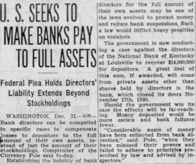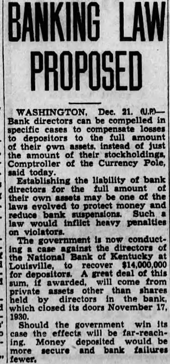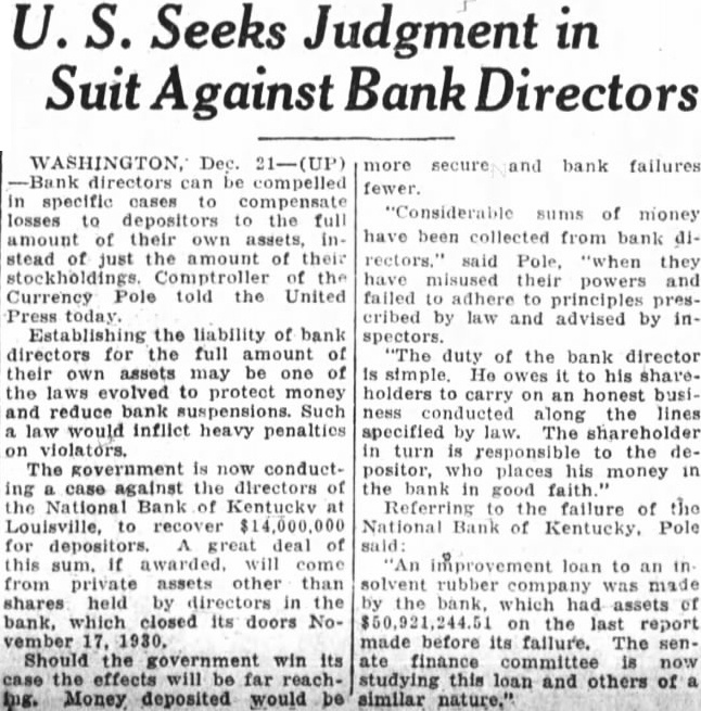 Dec. 21-(UP) compelled specific cases to compensate losses depositors full amount of their instead amount Currency Pole told United Press the liability of bank directors the full assets be the evolved protect money reduce bank Such would inflict heavy penalties violators. The government now conductagainst the directors National Bank Louisville, recover depositors. deal this come from assets other than shares the bank, closed its doors November Should government win its effects will far reachMoney deposited would more secure and bank failures fewer. "Considerable sums of money have collected from bank rectors.' "when they have misused powers failed principles cribed by law and advised by spectors. of the bank director simple. his shareholders busiconducted along the lines specified by shareholder turn responsible the depositor, places his money the bank good Referring failure of the National Bank of Kentucky. Pole improvement to company the bank, which assets the report made before its failure. ate finance now studying this loan and others of similar nature."