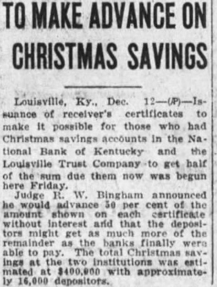 TO MAKE ADVANCE ON CHRISTMAS SAVINGS Louisville, of receiver's possible had tional Trust Company get half of the due them now was begun Judge cent amount without the tors get much of as the banks two was with ly 16,000 depositors.