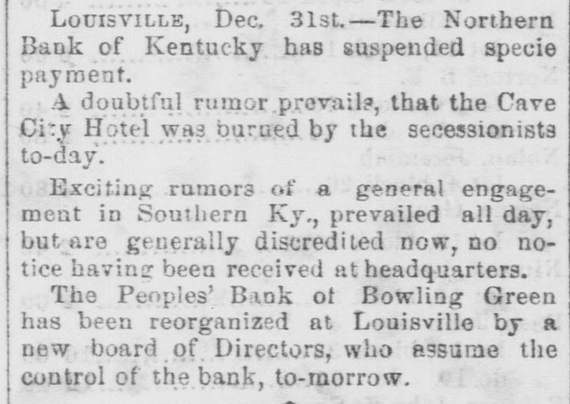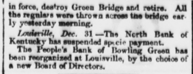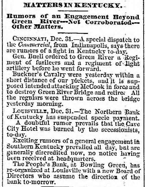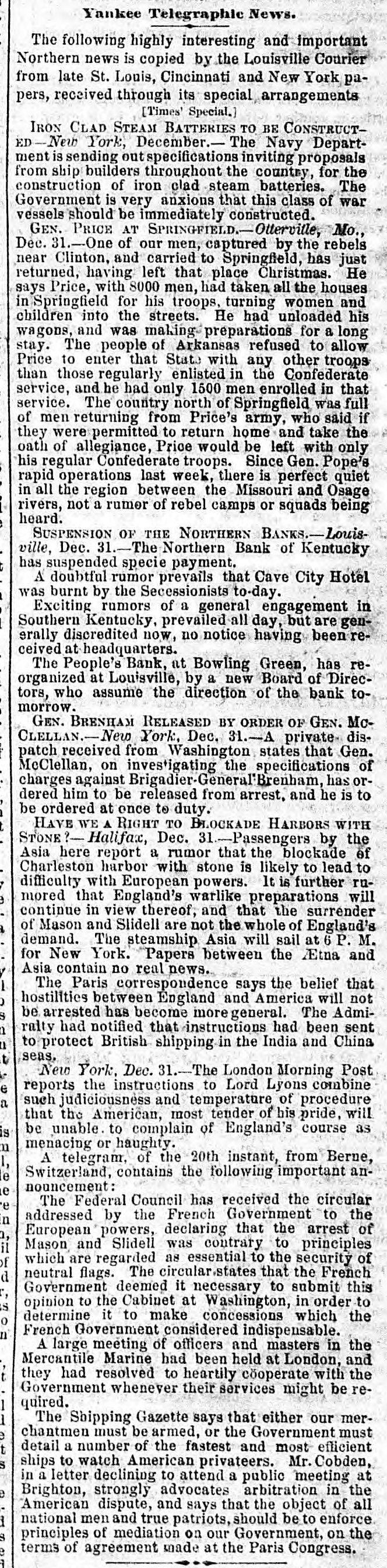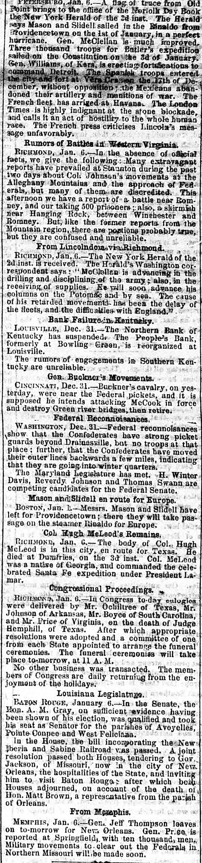 flag of truce from Old Point brings to the office of the Noriolk Day Book the New York Herald of the 3d inst. The Herald says Mason and Slidell sailed in the Rinaldo from frovidencetown on the 1st of January, in a perfect horricane. Gen. MeClellan is much improved. Three thousand troops for Butler's expedition saited of the Constitution on the 3d of January. Gen. Williams, of Kers, is ereeting fortifications to command Detroit. The Spaniell troops entered the city and fort Vera the 17th of December, without opposition the Mexicans abandoned their artillery and monitions of war. The French fleet has arriged at Havana. The London Times is highly indignant at the stone blockade, and calls it an act of hostility to the whole human race. The French press criticises Lincola's message unfavorably. Rumors of Battles in Western Virginia. RICHMOND, Jan. 6.-In the absence of official facts, we give the following Many extravagant reports have prevailed at Staunton during the past two days about Col. Johnson's movements at the Alleghany Mountains and the approach of Fed erals, but many of them are discredited. This afternoon we have a report of a battle near Romney, and our taking 500 prisoners also, a skirmish near Hanging Rock, between Winehester and Romney. But, like the former reports from the Mountain region, there are postions probably true, but they are confused and unreliable. From Lincolndoa.viaaRichmond RICHMOND, Jan. -The New York Herald of the dinst. is received. The Herald's Washington correspondent says: McGlellan is advancing in the drilling and disciplining of the army; also, in the receiving of supplies. He yaill soon advance his columns on the Potomac and by sea. The cause of his retarded movements. has been the delay of the fleets, and the difficialities with England. Bank Failure.in.Kentnaky LOUISVILLE, Dec. 31.-The Northern Bank of Kentucky has suspended. The People's Bank, formerly at Bowling Green, is reorganized at Louisville. The rumors of engagements in Southern Kentucky are unreliable. Gen. Buckner's Movements. CINCINNATI, Dec. 31.-Buckner's cavalry, on yesterday, were near the Federal pickets, and it is supposed he intends attacking McCook in force and destroy Green river bridges, then retire. Federal Reconnoisances WASHINGTON, Dec. 31.-Federal reconnoisances show that the Confederates have strong picket guards beyond Drainesville, but no troops at that place: further, that the Confederates have moved their outer lines backwards a few miles, indicating that they are going into winter quarters. The Maryland Legislature has met. H. Winter Davis, Reverdy Johnson and Thomas Swann are competing candidates for the Federal Senate. Mason andSlidell en route for Europe. BOSTON, Jan. Messrs. Mason and Slidell have left for Providencetown there they will take passage on the steamer Rinaldo for Europe. Col Hugh MeLeod's Remains. RICHMOND, Jan. 6.- The body of Col., Hugh McLeod is in this city, en route for Texas. He died at Dumfries, on the 3d inst. Col. McLeod was a native of Georgia, and commanded the celebrated Santa Fe expedition under President Lamar. Congressional Proceedings. RICHMOND Jan. 6.-In Congress to-day culogies were delivered by Mr. Ochiltree of Texas, Mr. Johnson of Arkansas, Mr. Boyce of South Carolina, and Mr. Price of Virginia, on the death of Judge Hemphill, of Texas. After which appropriate resolutions were adopted and a committee of one from each State appointed to arrange the funeral ceremonies. The funeral ceremoniss will take place to-morrow, at 11 A. M. No other business was transacted. The mem. bers of Congress are daily returning from the enjoymont of the holidays. Louisiana Legislature BATON ROUGE, January 6.-In the Senate, the Hon. A. M. Gray, on sufficient evidence having been shown of his election, was qualified and took his seat as Senator for the parishes of Avoyelles, Pointe Conpee and West Feliciana. In the House, the bill incorporating the New Iberia and Sabine Railroad was passed. A joint resolution passed both Houses, tendering to Gov Jackson, of Missouri, now in the city of New Orleans, the hospitalities of the State, and inviting him to visit Baton Rouge: after which both Houses adjourned, on account of the death of Hon. Matt Brown, a representative from the parish of Orleans. From Menaphis. MEMPHIS, Jan. ---Gen. Jeff Thompson leaves on to-morrow for New Orleans. Gen. Pr.ce is reported at Springfield, with ten thousand, men, Military movements to clear out the Federals in Northern Missouri wil! be made soon.