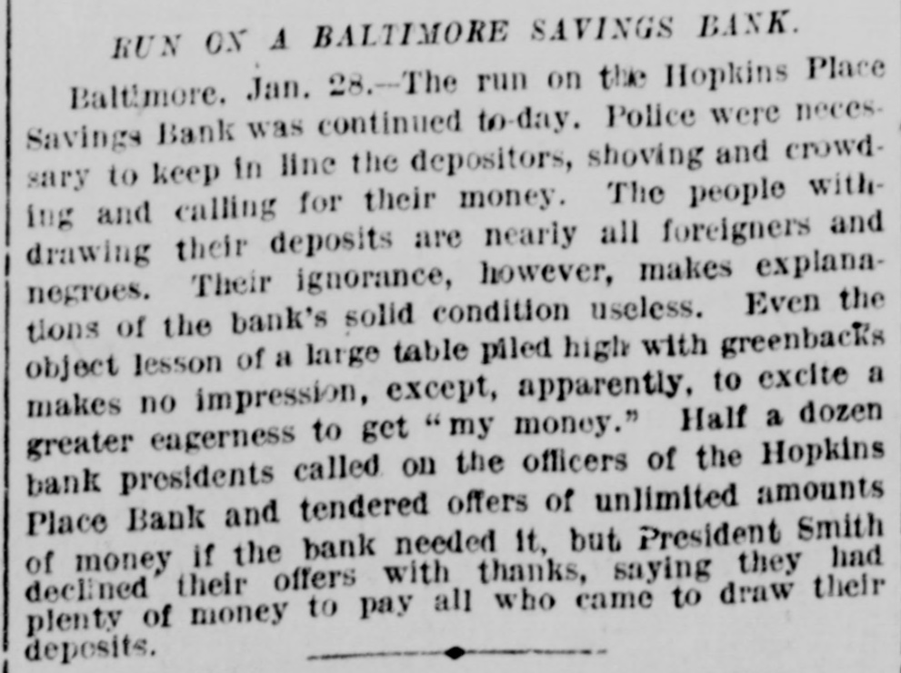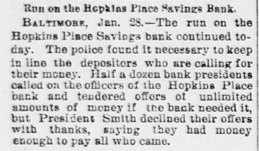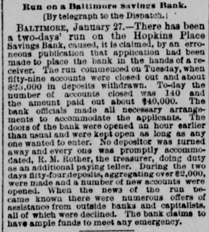 Run on a Baltimore Savings Bank. (By telegraph to the Dispatch. BALTIMORE, January 27.-There has been a two-days' run on the Hopkins Place Savings Bank, caused, it is claimed, by an erroneous publication that application had been made to place the bank in the hands of a receiver. The run commenced on Tuesday, when fifty-nine accounts were closed out and about 825,000 in deposits withdrawn. To-day the number of accounts closed was 140 and the amount paid out about $40,000. The bank officials made all necessary arrangements to accommodate the applicants. The doors of the bank were opened an hour earlier than usual and were kept open as long as any one wanted to enter. No depositor was turned away and every one was promptly accommodated, R. M. Rother, the treasurer, doing duty as an additional paying teller. During the two days filty-four.deposits, aggregating over $2,000, were made and a number of new accounts were opened. When the new3 of the run DOcame known there were numerous offers of assistance from outside banks and capitalists. all of which were declined. The bank claims to have ample funds to meet any emergency.