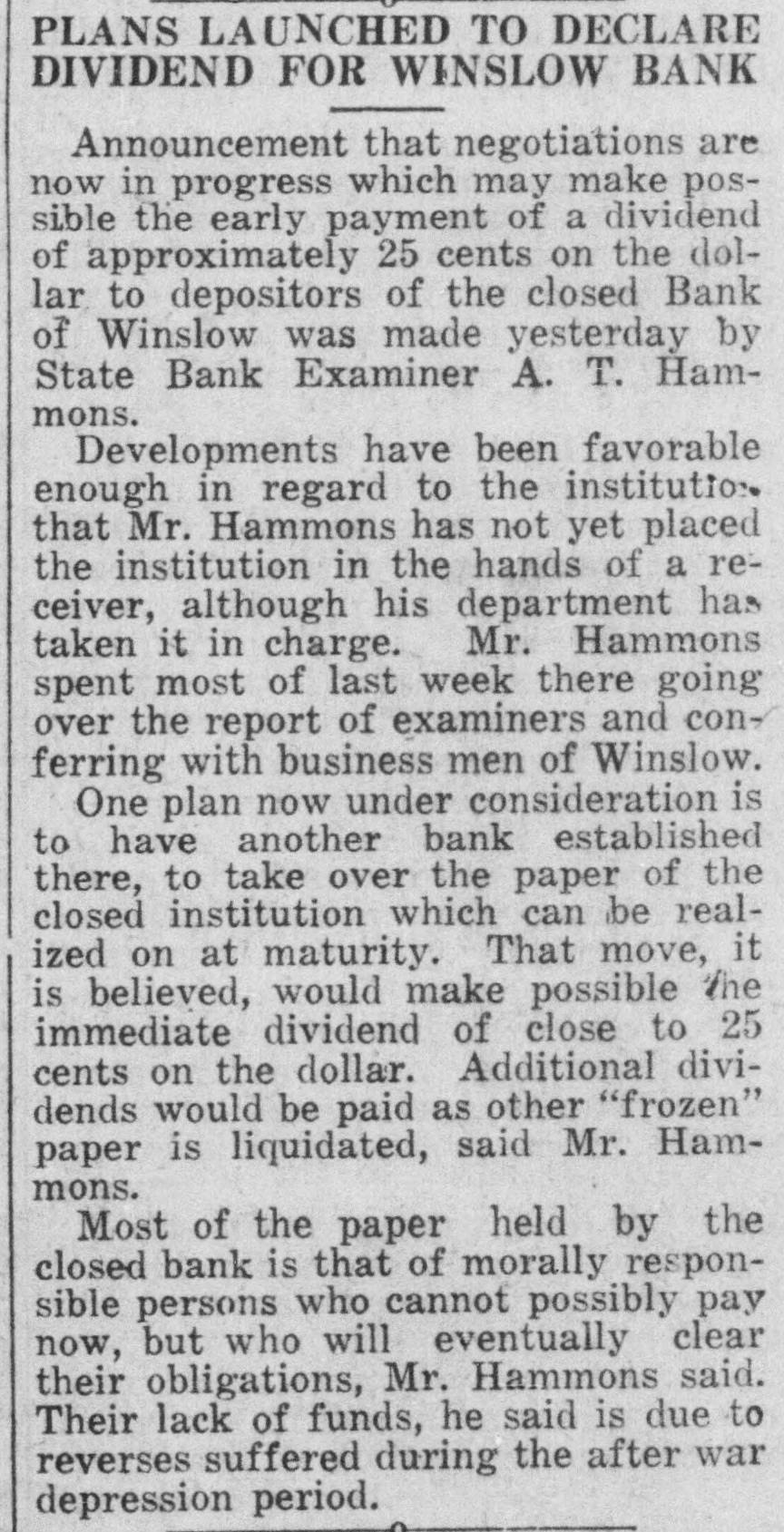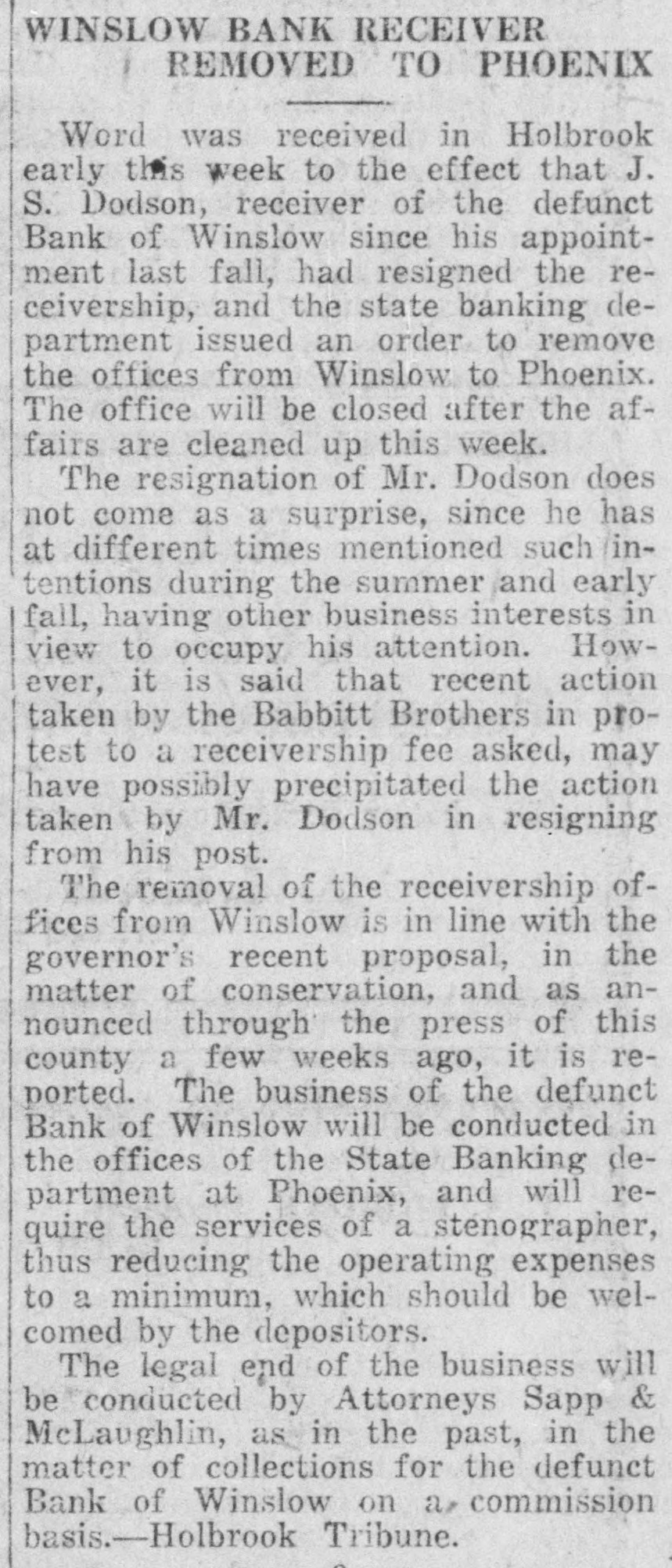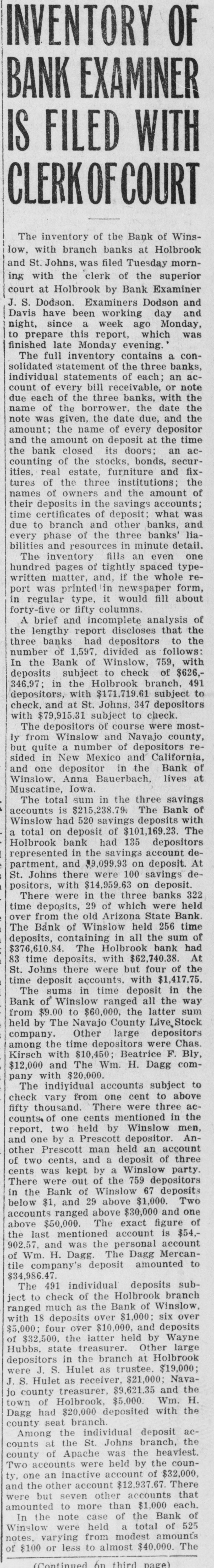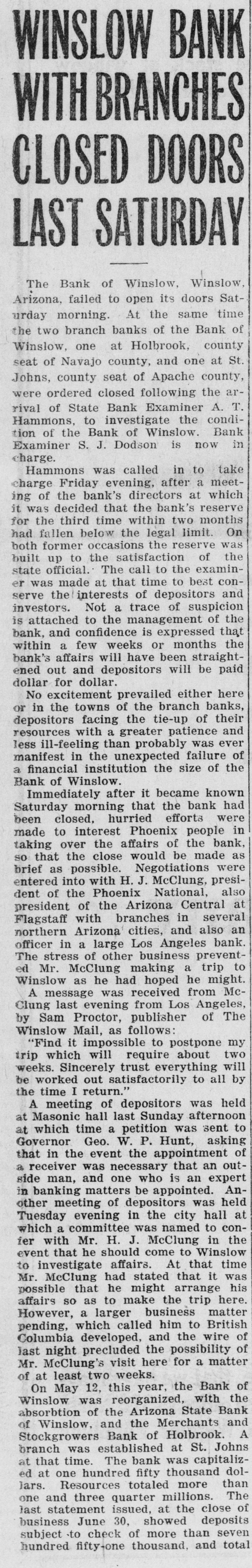 WINSLOW BANK WITH BRANCHES CLOSED DOORS LAST SATURDAY The Bank of Winslow, Winslow. Arizona, failed to open its doors Saturday morning. At the same time the two branch banks of the Bank of Winslow. one at Holbrook, county seat of Navajo county, and one at St. Johns, county seat of Apache county, were ordered closed following the arrival of State Bank Examiner A. T. Hammons, to investigate the condition of the Bank of Winslow. Bank Examiner S. J. Dodson is now in charge. Hammons was called in to take charge Friday evening, after a meeting of the bank's directors at which it was decided that the bank's reserve for the third time within two months had fallen below the legal limit. On both former occasions the reserve was built up to the satisfaction of the state official. The call to the examiner was made at that time to best conserve the interests of depositors and investors. Not a trace of suspicion is attached to the management of the bank, and confidence is expressed that within a few weeks or months the bank's affairs will have been straightened out and depositors will be paid dollar for dollar. No excitement prevailed either here or in the towns of the branch banks, depositors facing the tie-up of their resources with a greater patience and less ill-feeling than probably was ever manifest in the unexpected failure of a financial institution the size of the Bank of Winslow. Immediately after it became known Saturday morning that the bank had been closed. hurried efforts were made to interest Phoenix people in taking over the affairs of the bank. so that the close would be made as brief as possible. Negotiations were entered into with H. J. McClung, president of the Phoenix National, also president of the Arizona Central at Flagstaff with branches in several northern Arizona cities, and also an officer in a large Los Angeles bank. The stress of other business prevented Mr. McClung making a trip to Winslow as he had hoped he might. A message was received from McClung last evening from Los Angeles, by Sam Proctor, publisher of The Winslow Mail, as follows: "Find it impossible to postpone my trip which will require about two weeks. Sincerely trust everything will be worked out satisfactorily to all by the time I return." A meeting of depositors was held at Masonic hall last Sunday afternoon at which time a petition was sent to Governor Geo. W. P. Hunt, asking that in the event the appointment of a receiver was necessary that an outside man, and one who is an expert in banking matters be appointed. Another meeting of depositors was held Tuesday evening in the city hall at which a committee was named to conier with Mr. H. J. McClung in the event that he should come to Winslow to investigate affairs. At that time Mr. McClung had stated that it was possible that he might arrange his affairs so as to make the trip here. However, a larger business matter pending, which called him to British Columbia developed, and the wire of last night precluded the possibility of Mr. McClung's visit here for a matter of at least two weeks. On May 12, this year, the Bank of Winslow was reorganized, with the absorbtion of the Arizona State Bank of Winslow, and the Merchants and A Stockgrowers Bank of Holbrook. branch was established at St. Johns at that time. The bank was capitalized at one hundred fifty thousand dollars. Resources totaled more than one and three quarter millions. The last statement issued, at the close of business June 30, showed deposits subject to check of more than seven hundred fifty-one thousand, and total