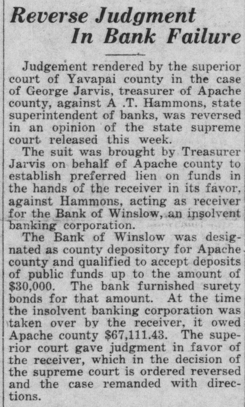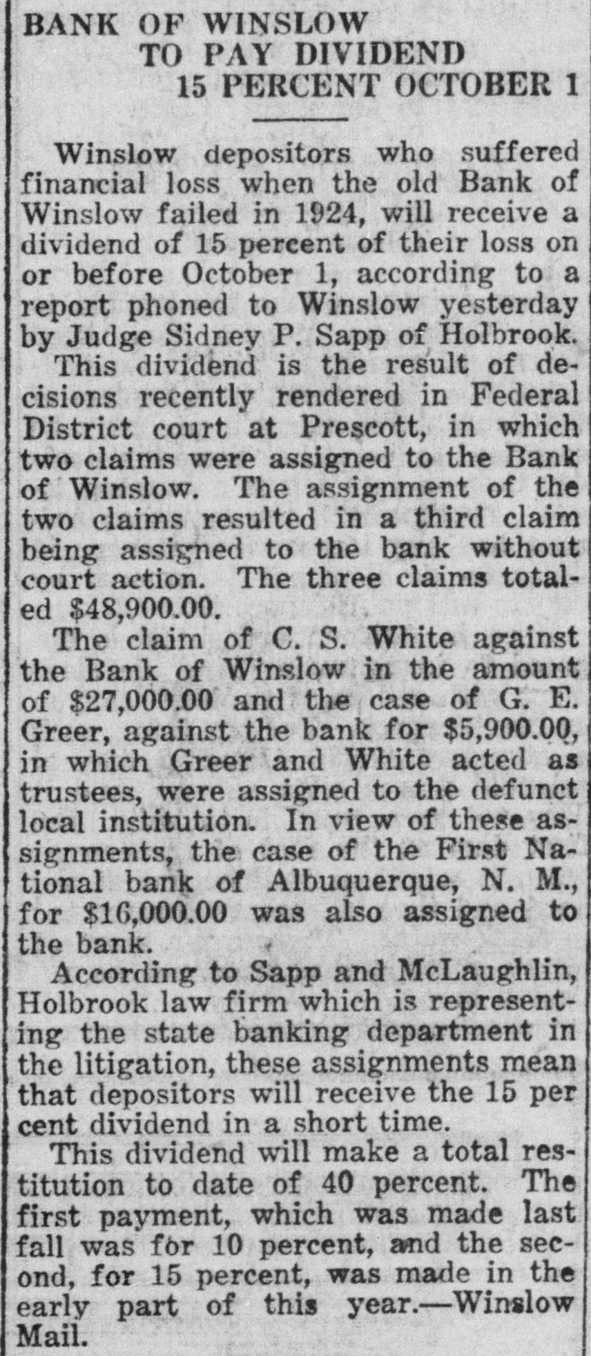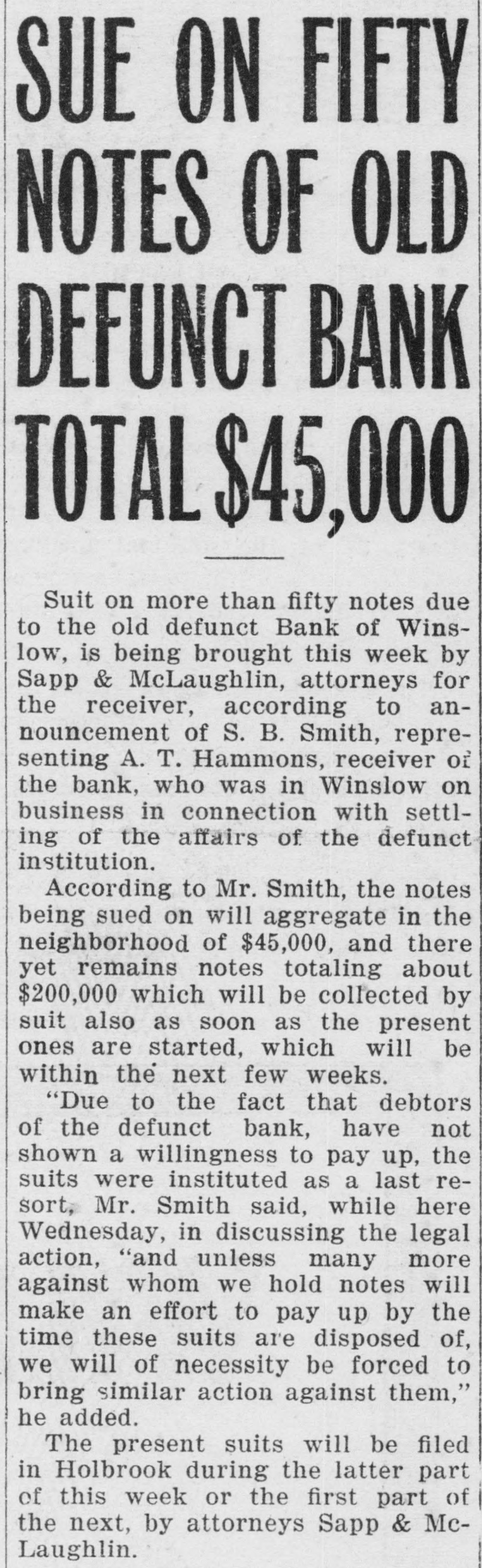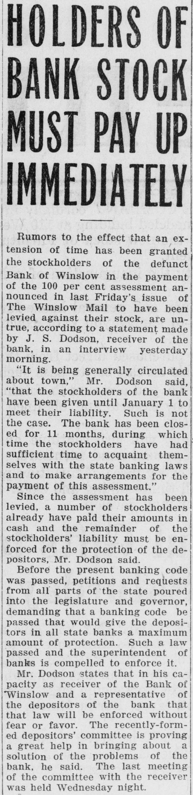 WINSLOW BANK WITH BRANCHES CLOSED DOORS LAST SATURDAY The Bank of Winslow, Winslow. Arizona, failed to open its doors Saturday morning. At the same time the two branch banks of the Bank of Winslow. one at Holbrook, county seat of Navajo county, and one at St. Johns, county seat of Apache county, were ordered closed following the arrival of State Bank Examiner A. T. Hammons, to investigate the condition of the Bank of Winslow. Bank Examiner S. J. Dodson is now in charge. Hammons was called in to take charge Friday evening, after a meeting of the bank's directors at which it was decided that the bank's reserve for the third time within two months had fallen below the legal limit. On both former occasions the reserve was built up to the satisfaction of the state official. The call to the examiner was made at that time to best conserve the interests of depositors and investors. Not a trace of suspicion is attached to the management of the bank, and confidence is expressed that within a few weeks or months the bank's affairs will have been straightened out and depositors will be paid dollar for dollar. No excitement prevailed either here or in the towns of the branch banks, depositors facing the tie-up of their resources with a greater patience and less ill-feeling than probably was ever manifest in the unexpected failure of a financial institution the size of the Bank of Winslow. Immediately after it became known Saturday morning that the bank had been closed. hurried efforts were made to interest Phoenix people in taking over the affairs of the bank. so that the close would be made as brief as possible. Negotiations were entered into with H. J. McClung, president of the Phoenix National, also president of the Arizona Central at Flagstaff with branches in several northern Arizona cities, and also an officer in a large Los Angeles bank. The stress of other business prevented Mr. McClung making a trip to Winslow as he had hoped he might. A message was received from McClung last evening from Los Angeles, by Sam Proctor, publisher of The Winslow Mail, as follows: "Find it impossible to postpone my trip which will require about two weeks. Sincerely trust everything will be worked out satisfactorily to all by the time I return." A meeting of depositors was held at Masonic hall last Sunday afternoon at which time a petition was sent to Governor Geo. W. P. Hunt, asking that in the event the appointment of a receiver was necessary that an outside man, and one who is an expert in banking matters be appointed. Another meeting of depositors was held Tuesday evening in the city hall at which a committee was named to conier with Mr. H. J. McClung in the event that he should come to Winslow to investigate affairs. At that time Mr. McClung had stated that it was possible that he might arrange his affairs so as to make the trip here. However, a larger business matter pending, which called him to British Columbia developed, and the wire of last night precluded the possibility of Mr. McClung's visit here for a matter of at least two weeks. On May 12, this year, the Bank of Winslow was reorganized, with the absorbtion of the Arizona State Bank of Winslow, and the Merchants and A Stockgrowers Bank of Holbrook. branch was established at St. Johns at that time. The bank was capitalized at one hundred fifty thousand dollars. Resources totaled more than one and three quarter millions. The last statement issued, at the close of business June 30, showed deposits subject to check of more than seven hundred fifty-one thousand, and total