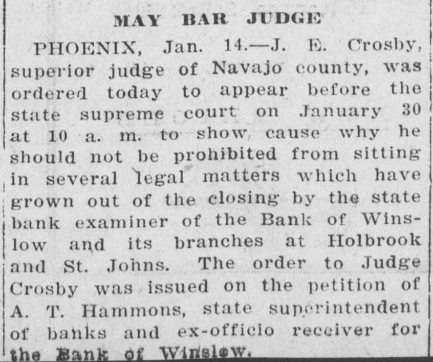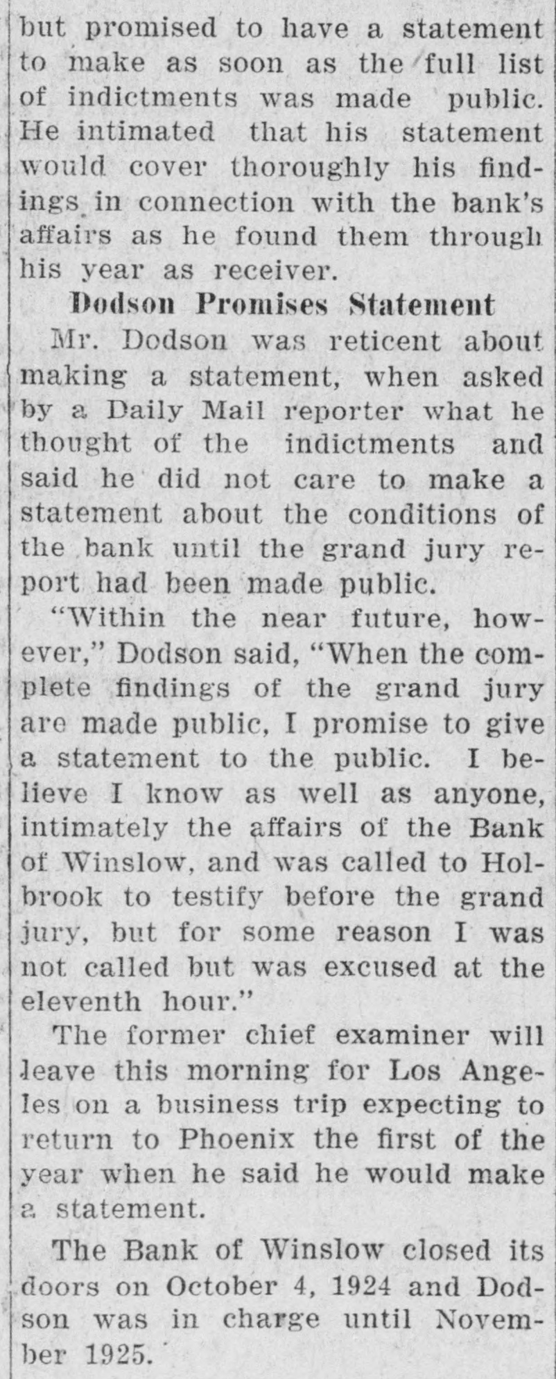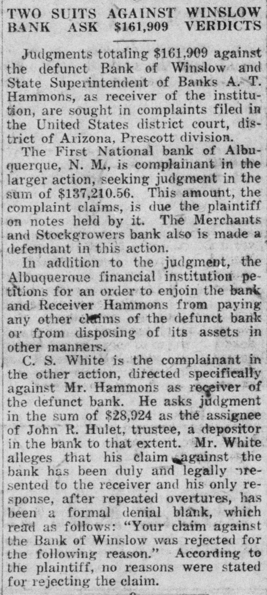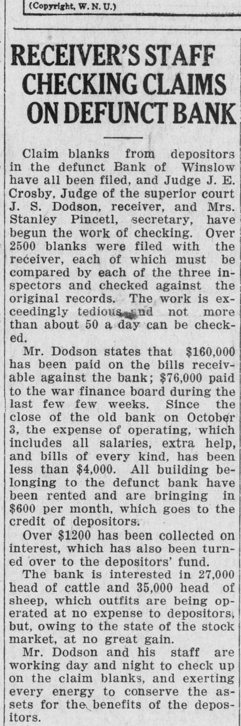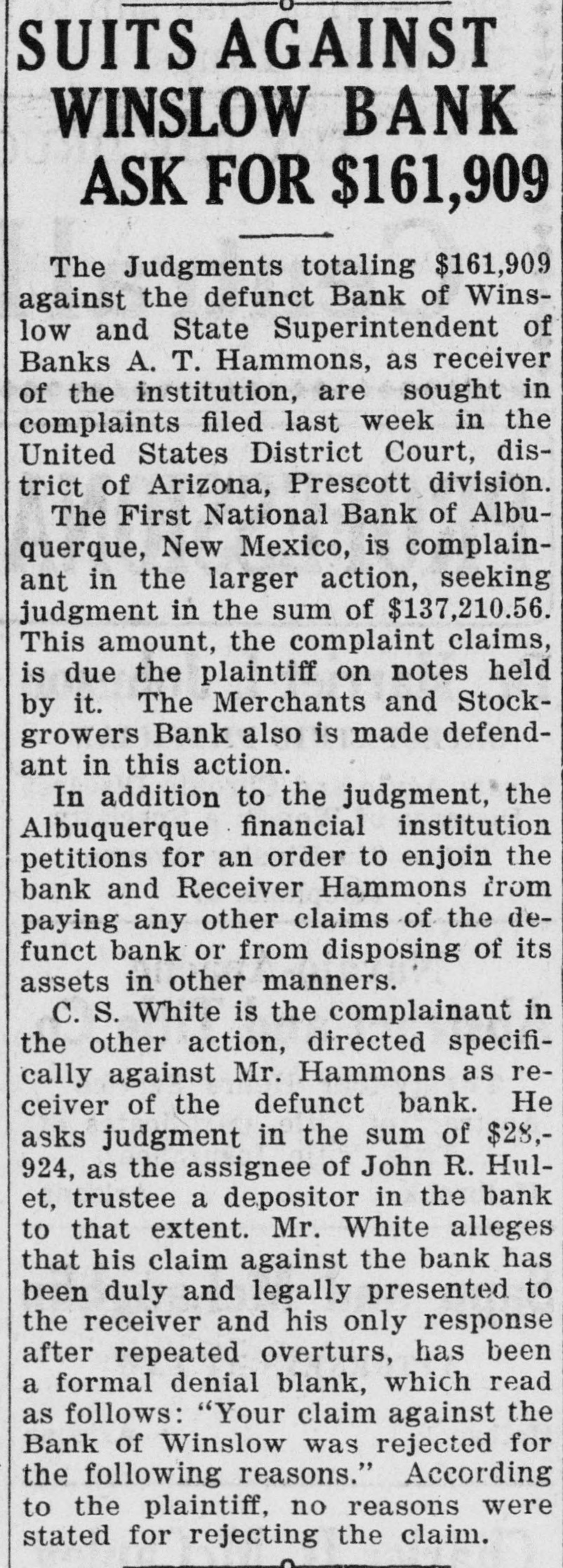 WINSLOW BANK WITH BRANCHES CLOSED DOORS LAST SATURDAY The Bank of Winslow, Winslow. Arizona, failed to open its doors Saturday morning. At the same time the two branch banks of the Bank of Winslow. one at Holbrook, county seat of Navajo county, and one at St. Johns, county seat of Apache county, were ordered closed following the arrival of State Bank Examiner A. T. Hammons, to investigate the condition of the Bank of Winslow. Bank Examiner S. J. Dodson is now in charge. Hammons was called in to take charge Friday evening, after a meeting of the bank's directors at which it was decided that the bank's reserve for the third time within two months had fallen below the legal limit. On both former occasions the reserve was built up to the satisfaction of the state official. The call to the examiner was made at that time to best conserve the interests of depositors and investors. Not a trace of suspicion is attached to the management of the bank, and confidence is expressed that within a few weeks or months the bank's affairs will have been straightened out and depositors will be paid dollar for dollar. No excitement prevailed either here or in the towns of the branch banks, depositors facing the tie-up of their resources with a greater patience and less ill-feeling than probably was ever manifest in the unexpected failure of a financial institution the size of the Bank of Winslow. Immediately after it became known Saturday morning that the bank had been closed. hurried efforts were made to interest Phoenix people in taking over the affairs of the bank. so that the close would be made as brief as possible. Negotiations were entered into with H. J. McClung, president of the Phoenix National, also president of the Arizona Central at Flagstaff with branches in several northern Arizona cities, and also an officer in a large Los Angeles bank. The stress of other business prevented Mr. McClung making a trip to Winslow as he had hoped he might. A message was received from McClung last evening from Los Angeles, by Sam Proctor, publisher of The Winslow Mail, as follows: "Find it impossible to postpone my trip which will require about two weeks. Sincerely trust everything will be worked out satisfactorily to all by the time I return." A meeting of depositors was held at Masonic hall last Sunday afternoon at which time a petition was sent to Governor Geo. W. P. Hunt, asking that in the event the appointment of a receiver was necessary that an outside man, and one who is an expert in banking matters be appointed. Another meeting of depositors was held Tuesday evening in the city hall at which a committee was named to conier with Mr. H. J. McClung in the event that he should come to Winslow to investigate affairs. At that time Mr. McClung had stated that it was possible that he might arrange his affairs so as to make the trip here. However, a larger business matter pending, which called him to British Columbia developed, and the wire of last night precluded the possibility of Mr. McClung's visit here for a matter of at least two weeks. On May 12, this year, the Bank of Winslow was reorganized, with the absorbtion of the Arizona State Bank of Winslow, and the Merchants and A Stockgrowers Bank of Holbrook. branch was established at St. Johns at that time. The bank was capitalized at one hundred fifty thousand dollars. Resources totaled more than one and three quarter millions. The last statement issued, at the close of business June 30, showed deposits subject to check of more than seven hundred fifty-one thousand, and total