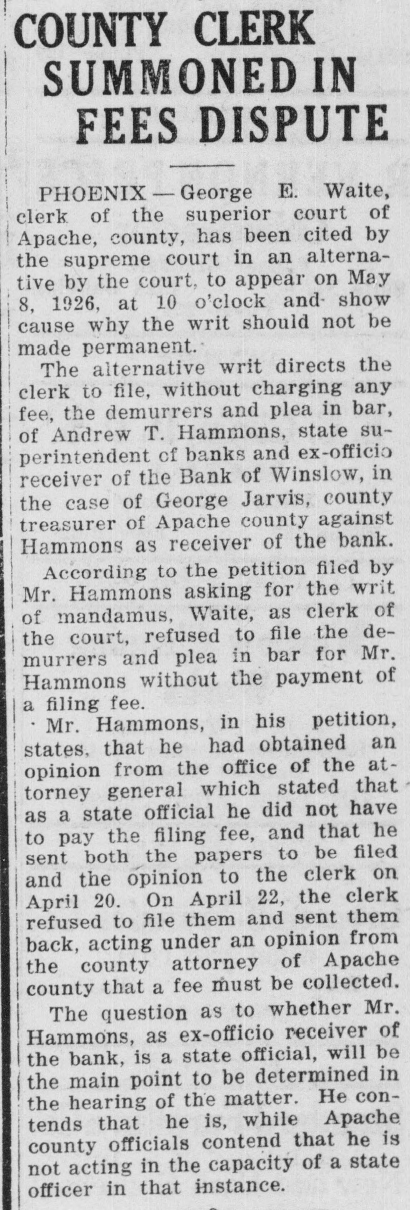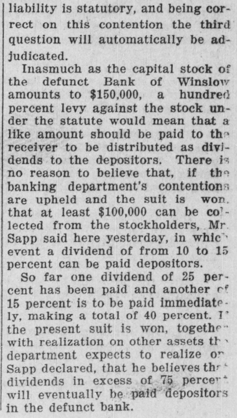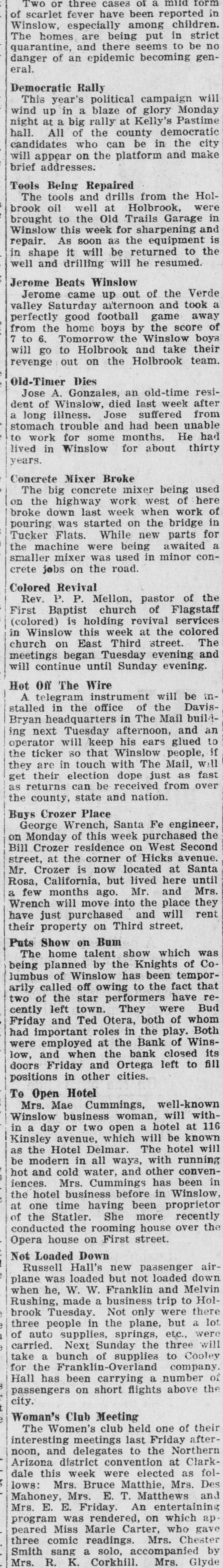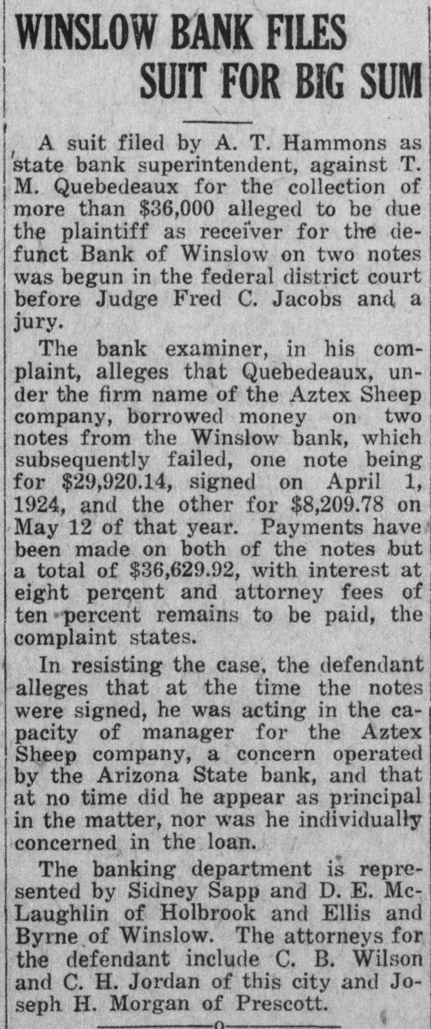 WINSLOW BANK WITH BRANCHES CLOSED DOORS LAST SATURDAY The Bank of Winslow, Winslow. Arizona, failed to open its doors Saturday morning. At the same time the two branch banks of the Bank of Winslow. one at Holbrook, county seat of Navajo county, and one at St. Johns, county seat of Apache county, were ordered closed following the arrival of State Bank Examiner A. T. Hammons, to investigate the condition of the Bank of Winslow. Bank Examiner S. J. Dodson is now in charge. Hammons was called in to take charge Friday evening, after a meeting of the bank's directors at which it was decided that the bank's reserve for the third time within two months had fallen below the legal limit. On both former occasions the reserve was built up to the satisfaction of the state official. The call to the examiner was made at that time to best conserve the interests of depositors and investors. Not a trace of suspicion is attached to the management of the bank, and confidence is expressed that within a few weeks or months the bank's affairs will have been straightened out and depositors will be paid dollar for dollar. No excitement prevailed either here or in the towns of the branch banks, depositors facing the tie-up of their resources with a greater patience and less ill-feeling than probably was ever manifest in the unexpected failure of a financial institution the size of the Bank of Winslow. Immediately after it became known Saturday morning that the bank had been closed. hurried efforts were made to interest Phoenix people in taking over the affairs of the bank. so that the close would be made as brief as possible. Negotiations were entered into with H. J. McClung, president of the Phoenix National, also president of the Arizona Central at Flagstaff with branches in several northern Arizona cities, and also an officer in a large Los Angeles bank. The stress of other business prevented Mr. McClung making a trip to Winslow as he had hoped he might. A message was received from McClung last evening from Los Angeles, by Sam Proctor, publisher of The Winslow Mail, as follows: "Find it impossible to postpone my trip which will require about two weeks. Sincerely trust everything will be worked out satisfactorily to all by the time I return." A meeting of depositors was held at Masonic hall last Sunday afternoon at which time a petition was sent to Governor Geo. W. P. Hunt, asking that in the event the appointment of a receiver was necessary that an outside man, and one who is an expert in banking matters be appointed. Another meeting of depositors was held Tuesday evening in the city hall at which a committee was named to conier with Mr. H. J. McClung in the event that he should come to Winslow to investigate affairs. At that time Mr. McClung had stated that it was possible that he might arrange his affairs so as to make the trip here. However, a larger business matter pending, which called him to British Columbia developed, and the wire of last night precluded the possibility of Mr. McClung's visit here for a matter of at least two weeks. On May 12, this year, the Bank of Winslow was reorganized, with the absorbtion of the Arizona State Bank of Winslow, and the Merchants and A Stockgrowers Bank of Holbrook. branch was established at St. Johns at that time. The bank was capitalized at one hundred fifty thousand dollars. Resources totaled more than one and three quarter millions. The last statement issued, at the close of business June 30, showed deposits subject to check of more than seven hundred fifty-one thousand, and total
