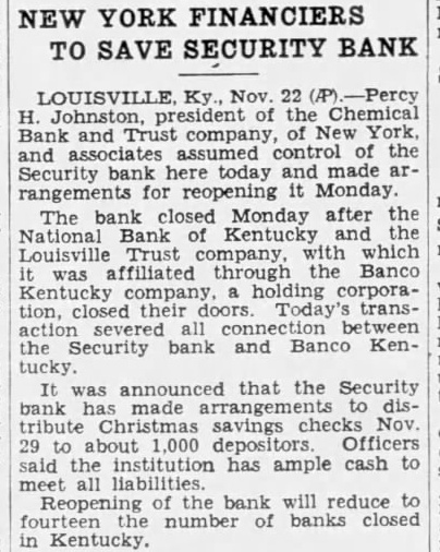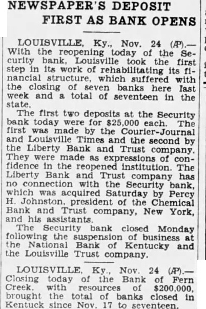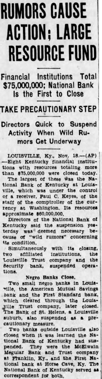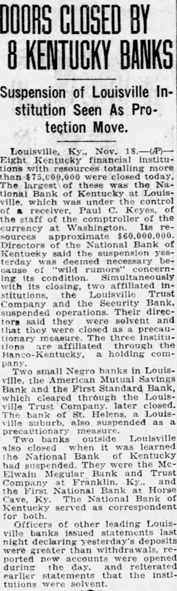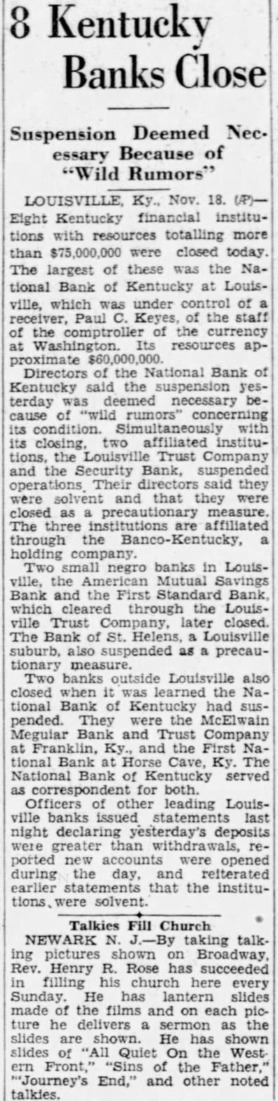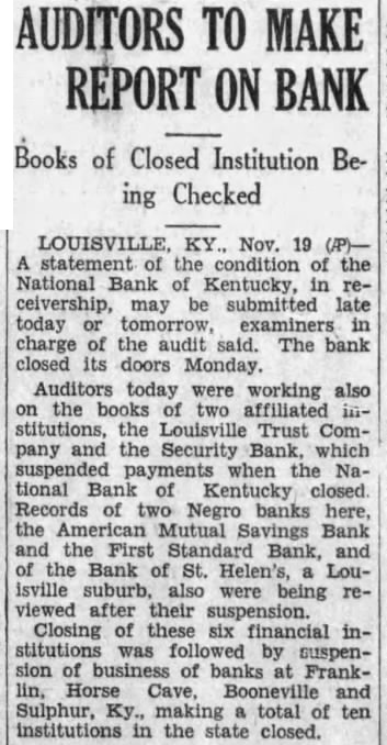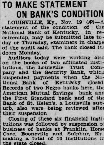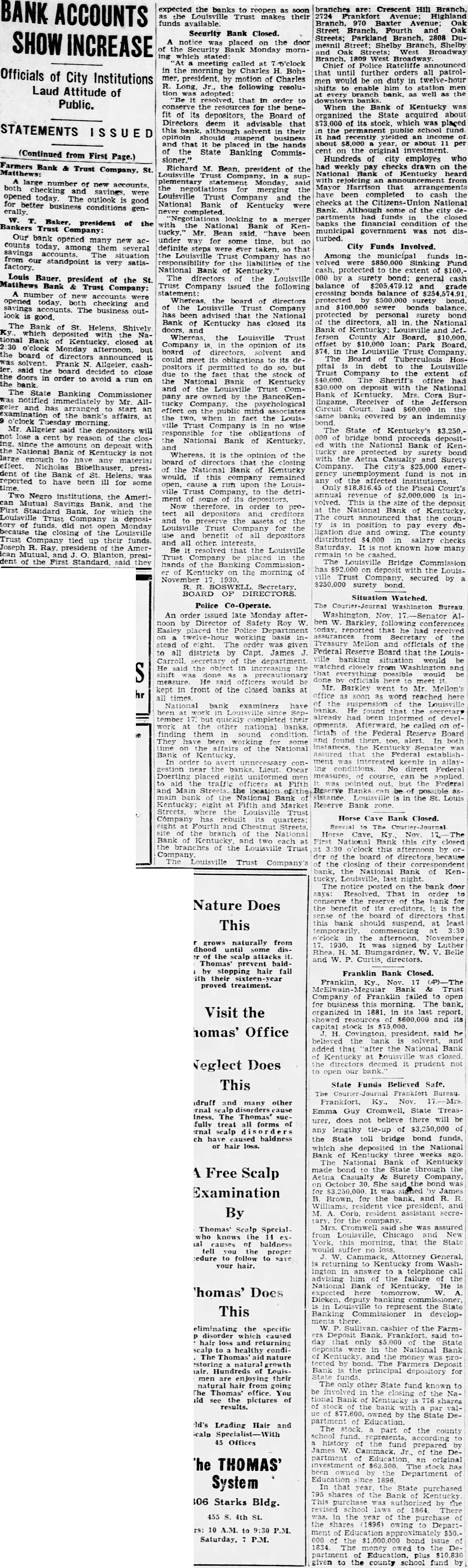 BANK ACCOUNTS SHOW INCREASE Officials of City Institutions Laud Attitude of Public. STATEMENTS (Continued from First Page.) Farmers Bank & Trust St. both large number new checking and opened today. The outlook savings, is good erally. for better business conditions W. T. of the Trust Company: president Our bank opened many new acsavings counts today. among them several The situation from factory. standpoint is very satisLouis Bauer, president of the St. Trust Company: of opened today, checking savings look accounts. The business outgood. The which Bank of St. Helens. Shively deposited National Bank of Kentucky. closed at Monday afternoon. but board of announced Frank cashsaid the board close the doors in order to avoid a run on The State Banking Commissioner was notified immediately by Mr. Allhas arranged an examination at o'clock Mr. Allgeier said the depositors will not cent reason of the closing. since the amount deposit with National Bank of Kentucky not large enough to material president the Bank to have been ill for some Two Negro institutions the AmeriMutual Bank. First Standard Bank, for which the deposidid not Monday of Louisville Trust Company tied their funds. up Joseph R. of the Amerpresident of the Standard said they expected the banks to reopen as Louisville Trust makes their funds available. Security Bank Closed. notice was placed door the Bank Monday mornin the morning by Bohmer. president, by motion of Charles R. the following resolution adopted: that in order to the for the benefit of depositors, the Board of Directors deem advisable this solvent in their opinoin should business and that be placed the hands of the State Banking CommisRichard M. Bean president of the Louisville plementary Monday. said negotiations merging the Louisville Trust Company and the National Bank of Kentucky were never completed merger National tucky,' Mr. Bean said, been under way for some time. but definite steps were taken. that Louisville Trust Company has responsibility liabilities of the National of Kentucky The directors Louisville Trust Company issued the following Whereas. the board of directors of the Louisville Trust Company has advised the National of Kentucky has closed its Whereas, the Louisville Trust Company opinion its board and could its obligations to its positors permitted but due the the stock and Company by the BancoKentucky Company psychological effect on the public two. the LouisTrust Company in wise National Bank of Kentucky. Whereas. the opinion of the board of directors that closing the National Bank of Kentucky would. company remained cause the LouisTrust the detriment of its Now therefore order to proall depositors creditors and the assets of the Louisville Trust and benefit depositors and all other. resolved that the Louisville Trust hands of the Kentucky on the morning of November BOSWELL OF Police Co-Operate. An order issued late Monday afterDirector Safety Roy W. the stead eight. The all districts by Capt. James object in the done measure He would kept in front of the closed banks at all bank examiners have September quickly completed their other national finding sound the of the National Bank of In congestion the banks. Lieut Oscar Doerting uniformed and the main the Bank Kentucky eight Fifth and Market Trust Company quarters eight Streets the Bank the branches of the Louisville Trust Company Louisville Trust Company's branches are: Crescent Hill 2724 Highland Branch, 970 Street Branch, Fourth and Oak Streets; Parkland Branch, 2808 Dumesnil Street: Shelby Branch, Shelby West Broadway Branch, West Broadway. Ratcliffe until further all patrolwould on duty in shifts enable him every branch bank, well When the Bank of Kentucky organized the State acquired about its placed permanent school recently yielded an 11 per on the original Hundreds of city employes who had drawn on the National Kentucky heard with from Mayor Harrison arrangements have completed cash the checks National Bank. of the partments banks the financial condition of the municipal government was not disturbed. City Funds Involved. Among the municipal funds inFund the extent by general cash balance grade crossing balance protected surety and sewer bonds personal surety bond the directors, all the National Kentucky offset by Board, $74 the Louisville Trust The Board Tuberculosis pital Louisville Trust extent office had the National Bank Mrs. Cora BurReceiver the Jefferson the same covered by an indemnity The State of Kentucky's $3,250.000 bridge bond depositwith the National Bank of Kentucky protected surety bond with the Aetna Casualty and Surety The city's emergency fund not in the institutions. the Fiscal Court's annual revenue of volved. This the of the deposit the National Bank Kentucky. that the position pay ligation due The county distributed salary checks Saturday. not known how many remain be Bridge Commission has the LouisTrust secured by $250,000 bond. Situation Watched. The Courier-Journal Washington Bureau ben W. Barkley. following conferences Treasury officials of the Federal Reserve Board that the Louisbanking would from Washington that would Mr. Mellon's office the suspension the Louisville found that the already had developments. called ficials the Federal Reserve Board and In assured establishwas keenly allaying conditions No direct Federal can applied was Federal sistance Louisville in the St. Louis Reserve Bank Horse Bank Closed. First this city this afternoon by the board directors because the closing their bank, Bank of Kentucky, Louisville, last night. the bank door says: That conserve the bank for the benefit the sense the directors this bank should suspend, at commencing 3:30 o'clock the signed Luther Belle and W. Franklin Bank Closed. Franklin, Nov. 17 Trust Company failed open for business this The bank, organized last report, showed and its capital stock Covington, president. said he added the National Bank Kentucky closed deemed it prudent not to State Funds Believed Safe. T