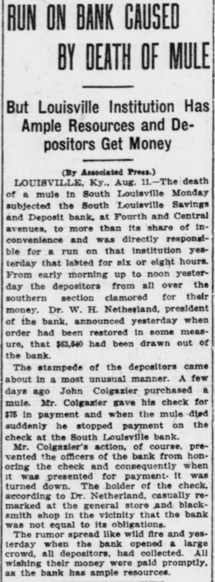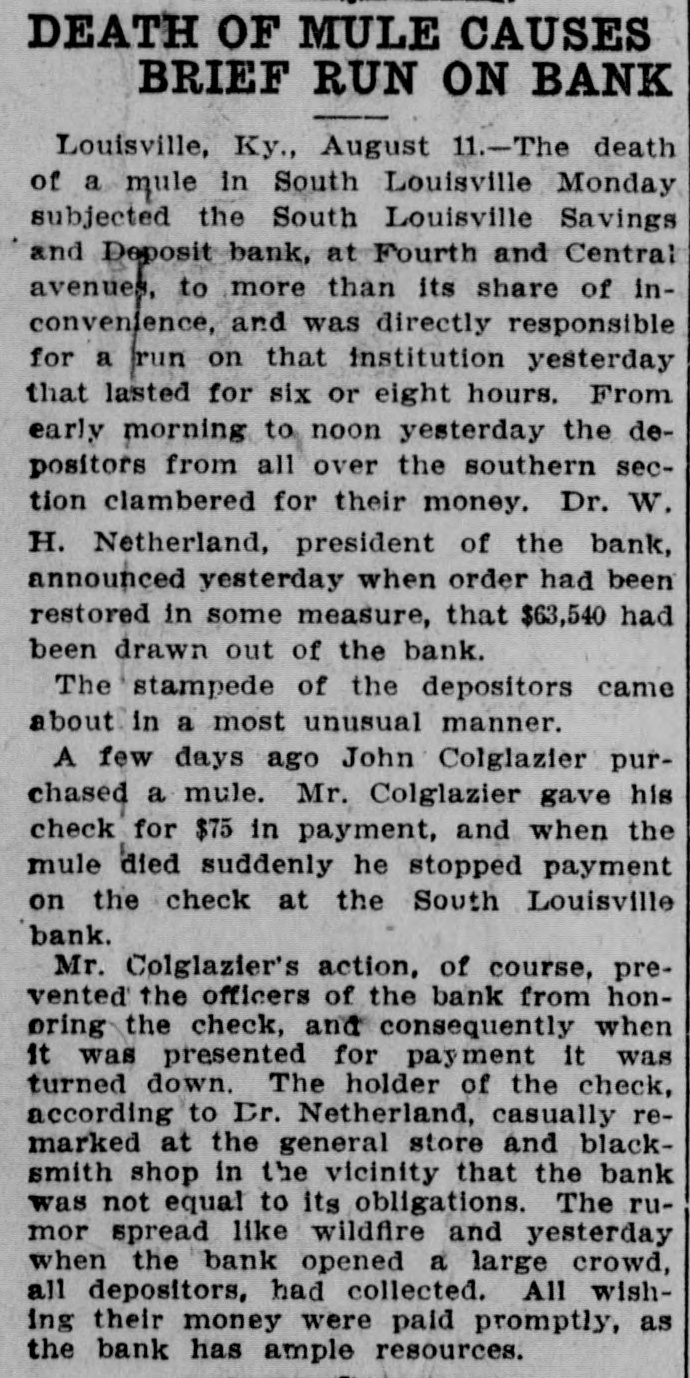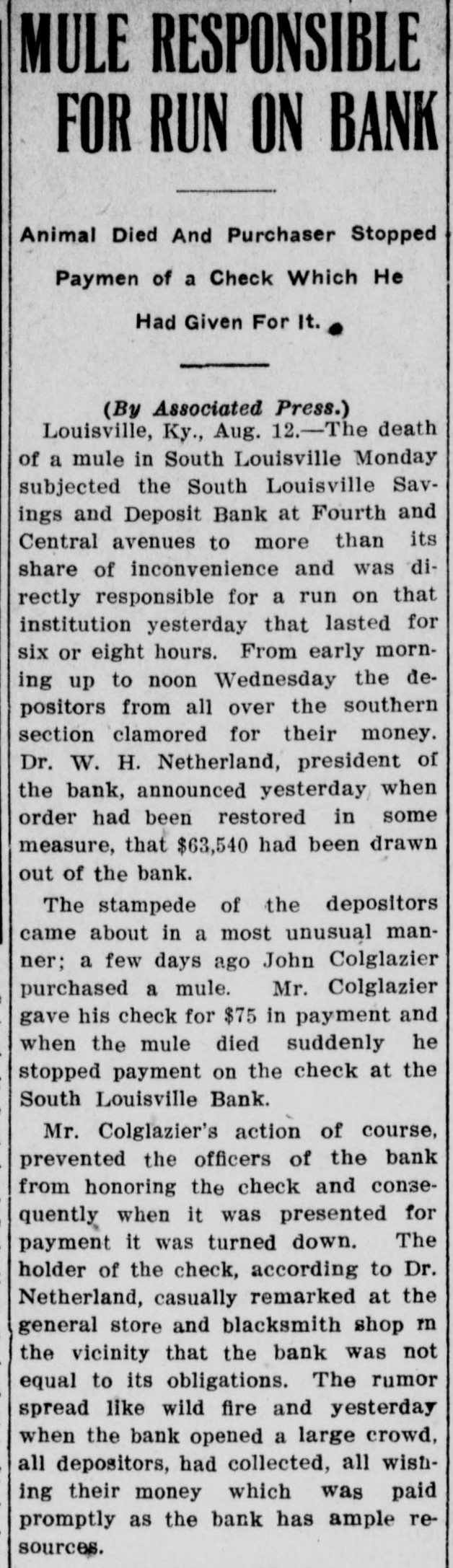 RUN ON BANK CAUSED BY DEATH OF MULE But Louisville Institution Has Ample Resources and Depositors Get Money (By Associated Press.) LOUISVILLE, Ky., Aug. 11.-The death of a mule in South Louisville Monday subjected the South Louisville Savings and Deposit bank, at Fourth and Central avenues, to more than its share of inconvenience and was directly responsible for a run on that institution yesterday that lasted for six or eight hours. From early morning up to noon yesterday the depositors from all over the southern section clamored for their money. Dr. W. H. Netherland, president of the bank, announced yesterday when order had been restored in some measure, that $63,540 had been drawn out of the bank. The stampede of the depositors came about in a most unusual manner. A few days ago John Colgazier purchased a mule. Mr. Colgazier gave his check for $75 in payment and when the mule died suddenly he stopped payment on the check at the South Louisville bank. Mr. Colgazier's action, of course, prevented the officers of the bank from honoring the check and consequently when It was presented for payment. it was turned down. The holder of the check, according to Dr. Netherland, casually remarked at the general store and blacksmith shop in the vicinity that the bank was not equal to its obligations. The rumor spread like wild fire and yesterday when the bank opened a large crowd, all depositors, had collected. All wishing their money were paid promptly, as the bank has ample resources.