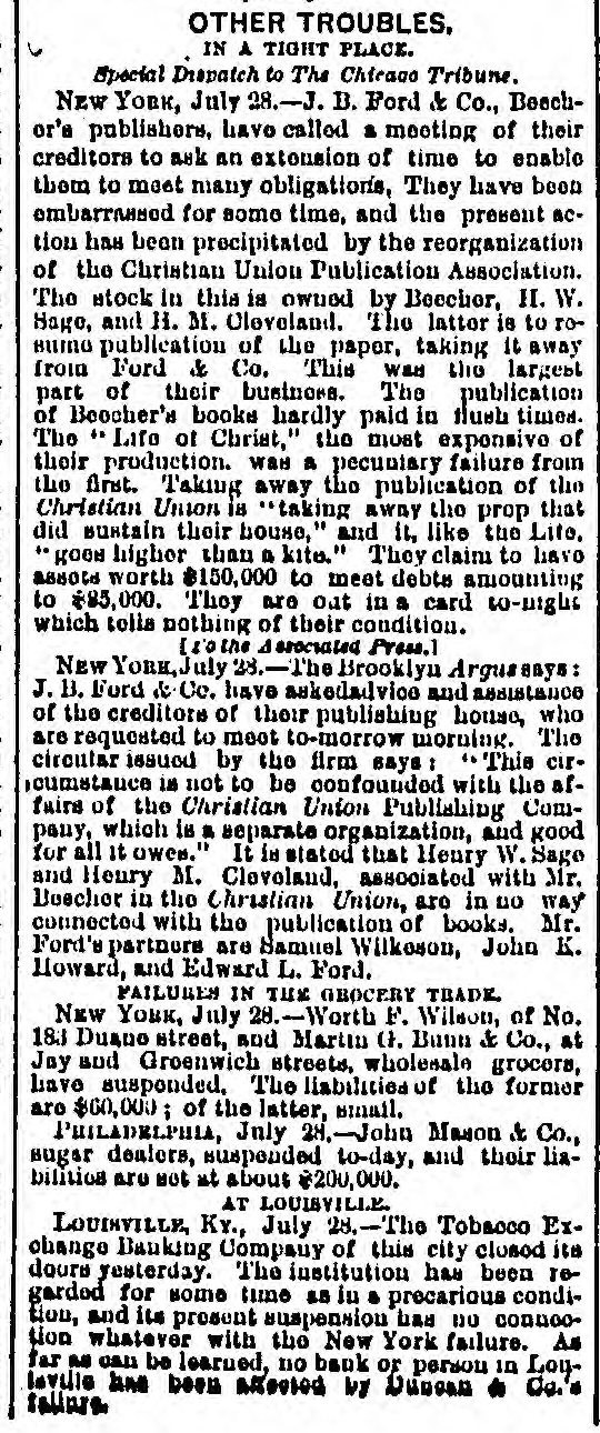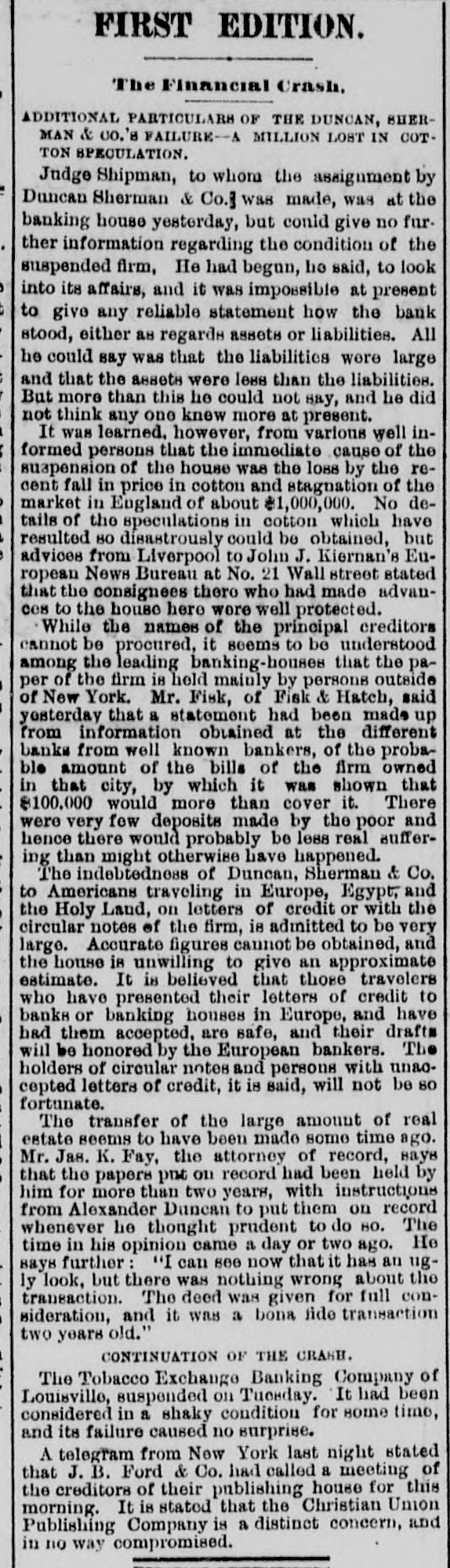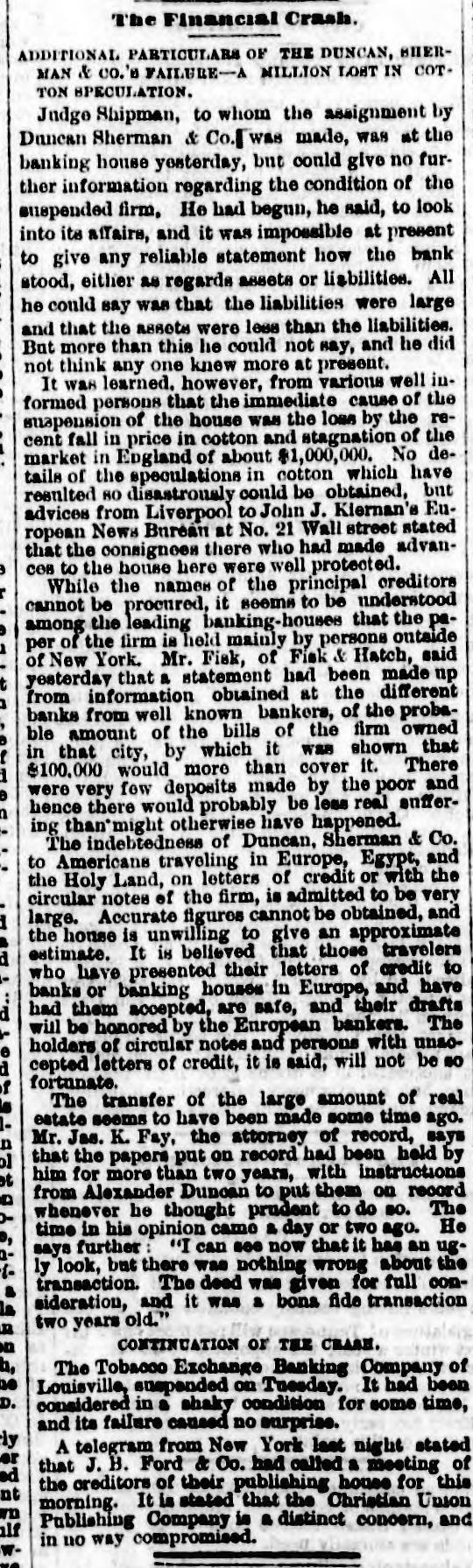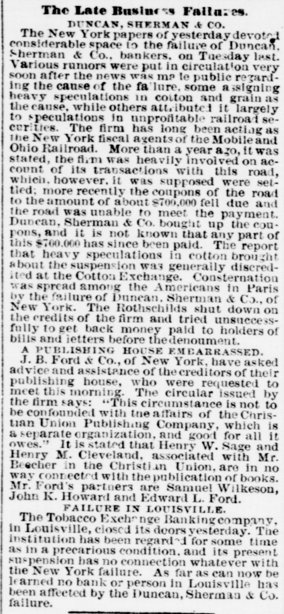 The Late Business Fallares. DUNCAN, SHERMAN & CO. The New York papers of yesterday devoted considerable space to the failure of Duncan, Sherman & Co., bankers, on Tuesday last. Various rumors were put in circulation very soon after the news was ma le public regarding the cause of the failure, some a ssigning heavy speculations in coiton and grain as the cause, while others attributed it largely to speculations in unprofitable railroad securities. The firm has long been acting as the New York fiscal agents of the Mobile and Ohio Railroad. More than a year ago, it was stated, the firm was heavily involved on account of its transactions with this road, which. however. it was supposed were settied: more recently the coupons of the road to the amount of about $700,000 fell due and the road was unable to meet the payment. Duncan, Sherman & Co. bought up the coupons, and it is not known that any part of this $700,000 has since been paid. The report that heavy speculations in cotton brought about the suspension was generally discredited at the Cotton Exchange. Consternation was spread among the Americans in Paris by the failure of Duncan, Sherman & Co., of New York. The Rothschilds shut down on the credits of the firm and tried unsuccessfully to get back money paid to holders of bills and letters before thedenoument. A PUBLISHING HOUSE EMEARRASSED. J. B. Ford & Co., of New York, have asked advice and assistance of the creditors of their publishing house, who were requested to meet this morning. The circular issued by the firm says: "This circumstance is not to be confounded with the affairs of the Christian Union Publishing Company, which is a separate organization, and good for all it owes." It is stated that Henry W. Sage and Henry M. Cleveland, associated with Mr. Beecher in the Christian Union, are in no way connected with the publication of books. Mr. Ford's partners are Samuel Wilkeson, John K. Howard and Edward L. Ford. FAILURE IN LOUISVILLE. The Tobacco Excha nge Banking company, in Louisville, closed its doors yesterday. The institution has been regarded for some time as in a precarious condition. and its present suspension has no connection whatever with the New York failure. As far as can now be learned no bank or person in Louisville has been affected by the Duncan, Sherman & Co. failure.