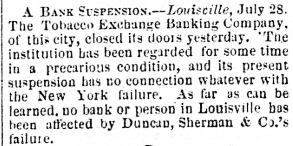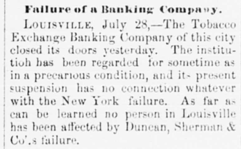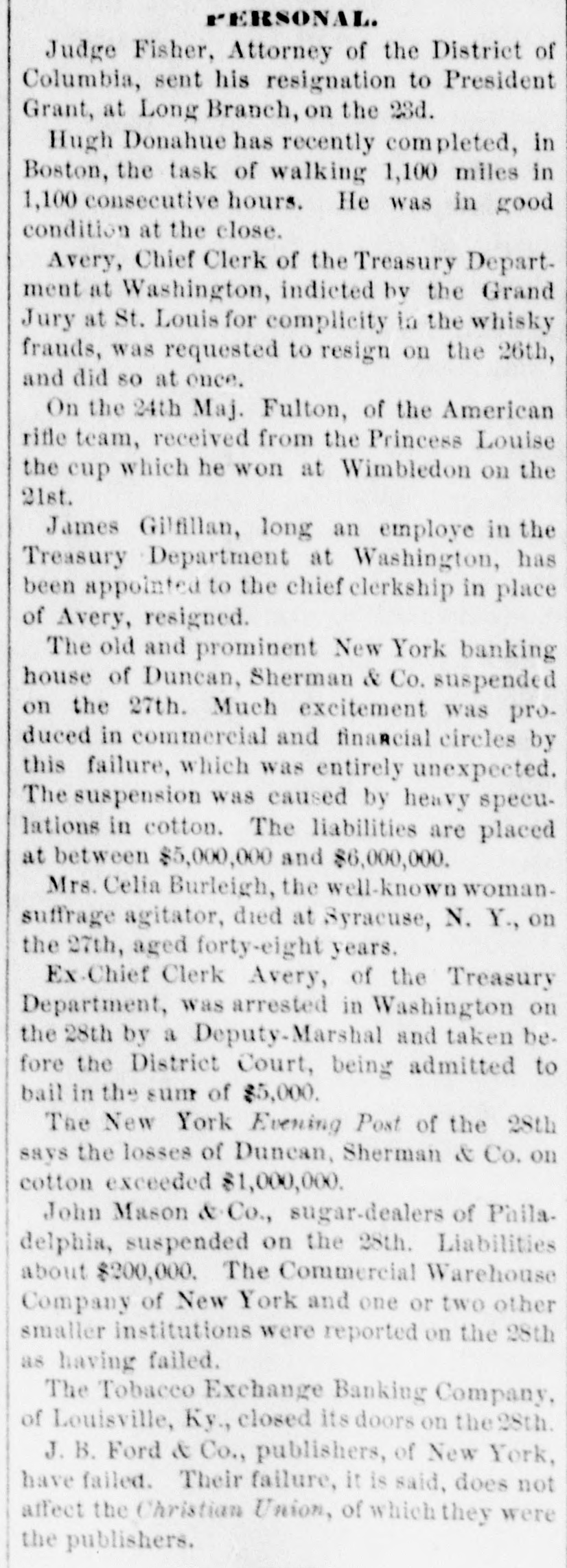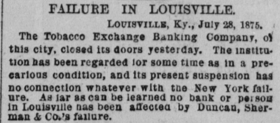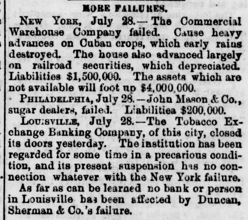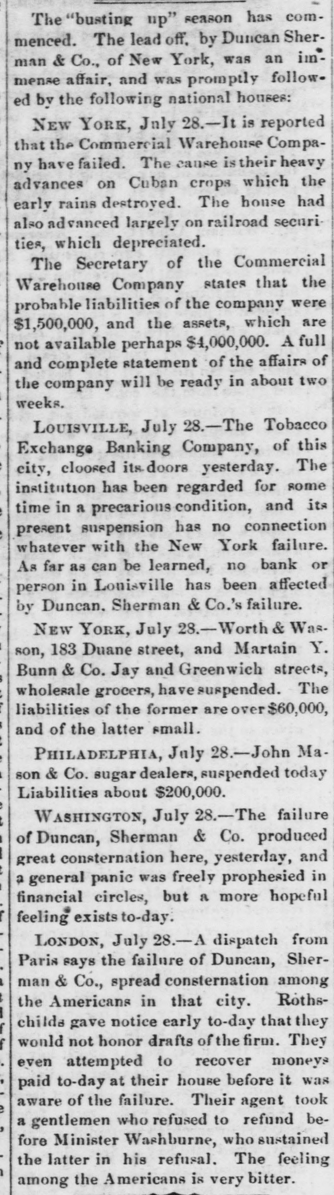 The Late Business Fallares. DUNCAN, SHERMAN & CO. The New York papers of yesterday devoted considerable space to the failure of Duncan, Sherman & Co., bankers, on Tuesday last. Various rumors were put in circulation very soon after the news was ma le public regarding the cause of the failure, some a ssigning heavy speculations in coiton and grain as the cause, while others attributed it largely to speculations in unprofitable railroad securities. The firm has long been acting as the New York fiscal agents of the Mobile and Ohio Railroad. More than a year ago, it was stated, the firm was heavily involved on account of its transactions with this road, which. however. it was supposed were settied: more recently the coupons of the road to the amount of about $700,000 fell due and the road was unable to meet the payment. Duncan, Sherman & Co. bought up the coupons, and it is not known that any part of this $700,000 has since been paid. The report that heavy speculations in cotton brought about the suspension was generally discredited at the Cotton Exchange. Consternation was spread among the Americans in Paris by the failure of Duncan, Sherman & Co., of New York. The Rothschilds shut down on the credits of the firm and tried unsuccessfully to get back money paid to holders of bills and letters before thedenoument. A PUBLISHING HOUSE EMEARRASSED. J. B. Ford & Co., of New York, have asked advice and assistance of the creditors of their publishing house, who were requested to meet this morning. The circular issued by the firm says: "This circumstance is not to be confounded with the affairs of the Christian Union Publishing Company, which is a separate organization, and good for all it owes." It is stated that Henry W. Sage and Henry M. Cleveland, associated with Mr. Beecher in the Christian Union, are in no way connected with the publication of books. Mr. Ford's partners are Samuel Wilkeson, John K. Howard and Edward L. Ford. FAILURE IN LOUISVILLE. The Tobacco Excha nge Banking company, in Louisville, closed its doors yesterday. The institution has been regarded for some time as in a precarious condition. and its present suspension has no connection whatever with the New York failure. As far as can now be learned no bank or person in Louisville has been affected by the Duncan, Sherman & Co. failure.