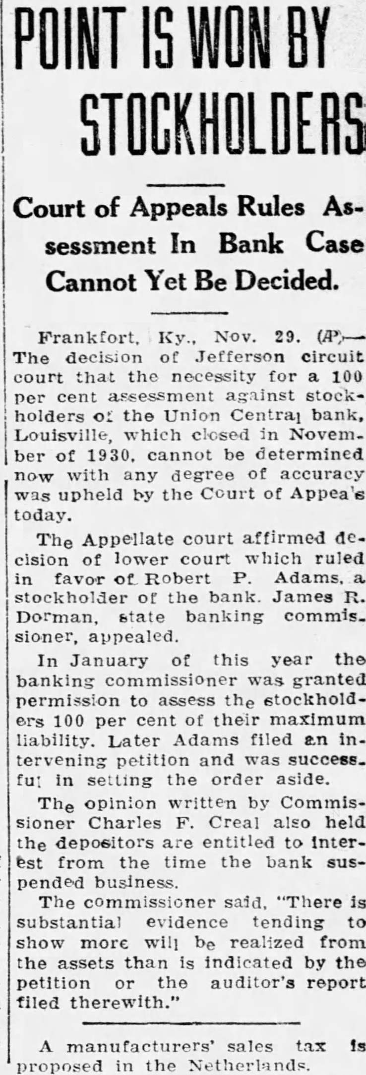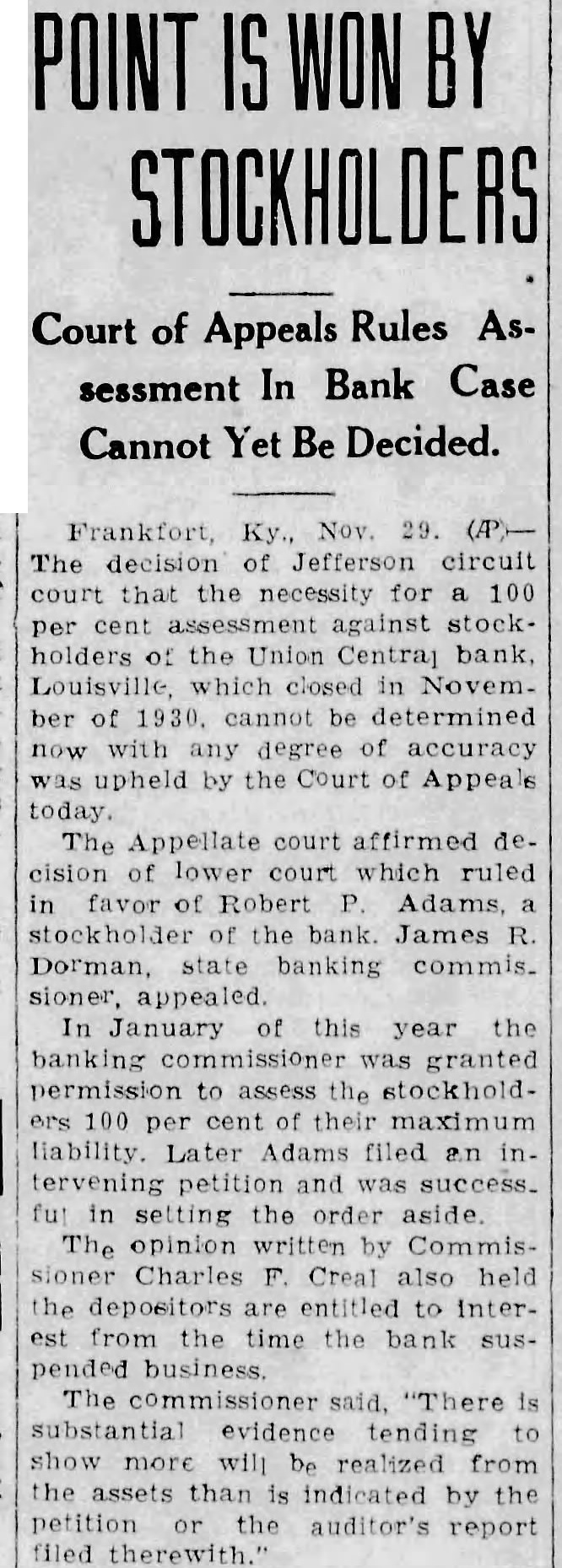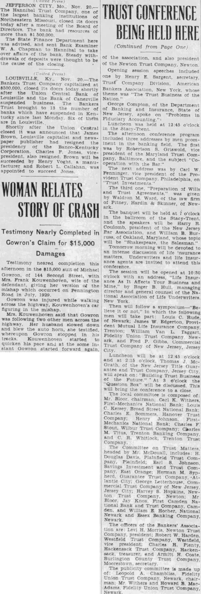 TRUST CONFERENCE BEING HELD HERE (Continued from Page One) nited JEFFERSON Mo. Nov The Hannibal Trust Company one the largest banking institutions Northeastern Missouri, closed its today after meeting of the Board of Directors The bank had resources of than 500,000 The State Finance Department here was advised sent Bank Examiner W. Chapman to take over affairs of the bank Steady withdrawals of of the association, and also president were thought to be the cause of the closing of the Newton Trust Company, Newton Opening session speeches included one by Henry E. Sargent, secretary LOUISVILLE Ky. Nov The Bankers Trust Trust Company Division. American at $500,000. closed its doors today Bankers New whose after the Union Central Bank of theme was "The Trust Business of the Louisville and the Bank of Canezville Nation suspended business The Bankers George Compton, of the Department Trust brought to 13 the number of of nking State of banks which in KenNew Jersey spoke on "Problems in tucky since last Monday. Six of them Fiduciary Accounting are in was at o'clock Shortly after Union Central in the closed it was that James The program Brown, Louisville capitalist and newsincluded three by paper publisher had resigned the inent in the banking field The first presidency the was by Robertson Griswold. Corporation Charles Jones vicepresident of the Maryland Trust Compresident, also resigned. Brown will be pany, and the "Cosubject succeeded by Henry Voght the facturer and Robert Callahan, was The Carl was W appointed to succeed Jones. Fenninger vice the Pro. vident Trust Philadelphia on "Trust WOMAN RELATES The third one "Preparation of Wills and Trust Agreements by Waldron Ward, of the law given firm of Pitney Hardin & Skinner, of Newark STORY OF CRASH The banquet will be held at o'clock in the ballroom of the -Trent and the speakers will be Harry R. president of the New Jersey Testimony Nearly Completed in Par Association and William B. Bur russ Oakland, Maryland whose topic Gowron's Claim for $15,000 will be the Salesman morning will be devoted to an intense discussion of life Insurance Damages matters Underwriters and life InsurTestimony neared completion this ance agents are invited to attend this conference afternoon in the $15,000 suit of Michael The session will be opened at 10:30 Gowron, of 144 Second Street, with "Life InsurMrs. Frank wife of the ance As It Affects Your Business and defendant, giving her version of the Mine, by Roger Hull mishap which occurred on Pennington director and of the Na. Road in tional of Life Underwriters injured while walking New York across the Kouwenhoven's car Then will follow "Befiguring in the lieve which the following Mrs. hoven said that Gowron men will take Louis C. Rude, was following two other the of Newark; W. Edgerton, Provihighway. Her husband slowed down dent Life Company and blew the auto horn, she testified, Trenton: William Van L. Taggart whereupon Gowron stopped in his Fidelity Union Trust Newtracks started ark Fred P. Gibbs, quicken his pace and at the inCity Trust Company of New Jersey, Jersey stant started again, will be at 12:45 o'clock and at Thomas Grath of the Title Guar- Mc antee and Trust Jersey City will speak on Building Trust Business of the Future At o'clock the Box will be discussed. This will the to close The committee composed of: First National Bank: Louis Kersey Broad Street National Bank: Charles Hanover Trust Company: Henry Mechanics National Bank: Charles First- F. Stout, Trust Company Charles and R. Whitlock, Trenton Trust Company The on Trust Matters headed by Mr. McDouall, includes H. Douglas Plainfield Trust Company, Plainfield; Earl Johnson Savings Investment and Trust Company East Orange: Herman M. Syp. lantic George Letterhouse Commercial Company of New Jersey Jersey Harvey S. Hopkins, Newton Trust Company Newton: Mr Bloor, Jay Knox. First Camden National Bank and Trust Company, Camden. and William E. Hocher National Newark Newark and Essex Banking Company The fficers of the Bankers' Association are Levi H. Trust Company Robert W Harden Westfield Trust Company Westfield, vice president: Charles H. Plenty Hackensack Trust Company, HackenCounty Trust Company Moorestown The publicity committee is made up of: Leopold Chambliss Fidelity Union Trust Company Newark, chairman; Mr. Withers and Howard B. MacAdams Fidelity Union Trust Company, Newark