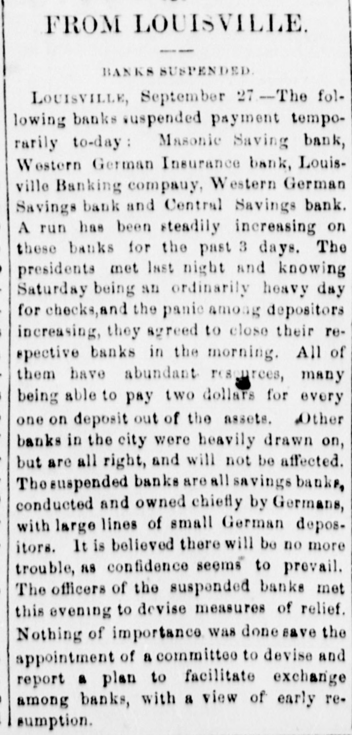FROM LOUISVILLE, BANKS SUSPENDED LOUISVILLE, September 7-The following banks suspended payment temporarily to-day Masonic Saving bank, Western German Insurance bank, Louisville Banking company, Western German Savings bank and Central Savings bank. A run has been steadily increasing on these banks for the past 3 days. The presidents met last night and knowing Saturday being an ordinarily heavy day for checks,and the panic among depositors increasing, they agreed to close their respective banks in the morning. All of them have abundant resources, many being able to pay two dollars for every one on deposit out of the assets. Other banks in the city were heavily drawn on, but are all right, and will not be affected. Tho suspended banks are all savings banks, conducted and owned chiefly by Germans, with large lines of small German depositors. It is believed there will be no more trouble, as confidence seems to prevail. The officers of the suspended banks met this evening to devise measures of relief. Nothing of importance was done save the appointment of a committee to devise and report a plan to facilitate exchange among banks, with a view of early resumption.