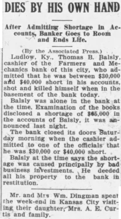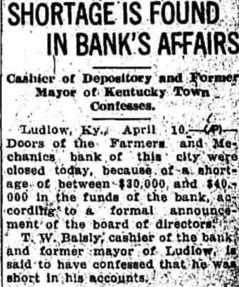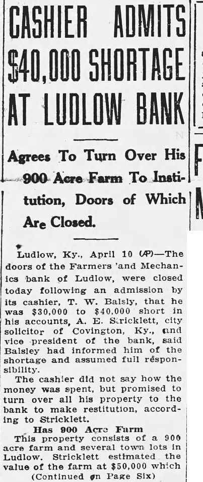 Ludlow, Ky., April 10 (AP)-The doors of the Farmers and Mechanics bank of Ludlow, were closed today following an admission by its cashier, W. Balsly, that he $30,000 to short in his accounts, Stricklett, city solicitor of Covington, Ky., and vice president of the bank, said Balsley had informed him of the shortage and assumed full responsibility. The cashier did not say how the money was spent, but promised to turn over all his property to the bank to make restitution, according to Stricklett. Has 900 Acre Farm This consists of 900 acre and town lots Ludlow. Stricklett estimated the value of the farm at $50,000 which (Continued on Page Six)