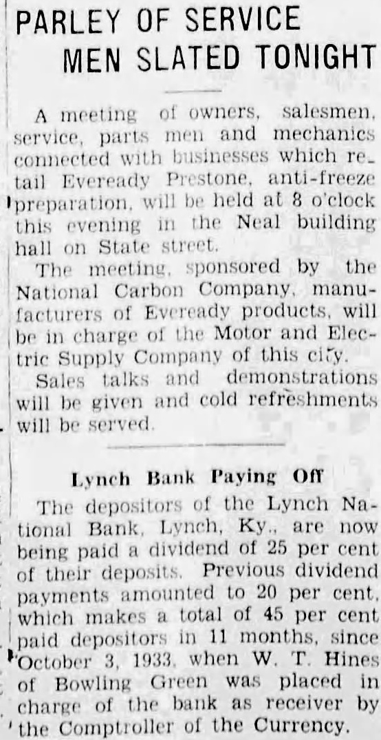 A meeting of owners. salesmen. service, parts men and mechanics connected with businesses which re_ Eveready anti-freeze will be held at o'clock in the Neal building evening on State street The meeting. sponsored by the National Carbon Company manufacturers of Eveready products will be in charge the Motor and Electric Supply Company of this city Sales talks and demonstrations will be given and cold refreshments served
