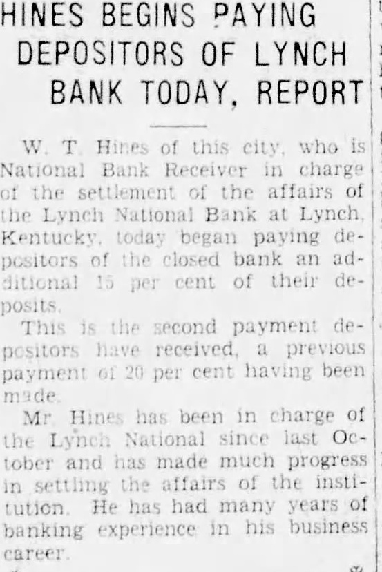 W T Hines of this city who is National Bank in charge of the settlement of the affairs of the Lynch National Bank at Lynch Kentucky today began paying depositors of the closed bank an additional 15 per cent of their deThis is the second payment depositors received payment 01 20 per cent having been Mr Hines has been in charge of the Lynch National since last October and has made much progress in settling the affairs of the institution He has had many years of banking experience in his business career