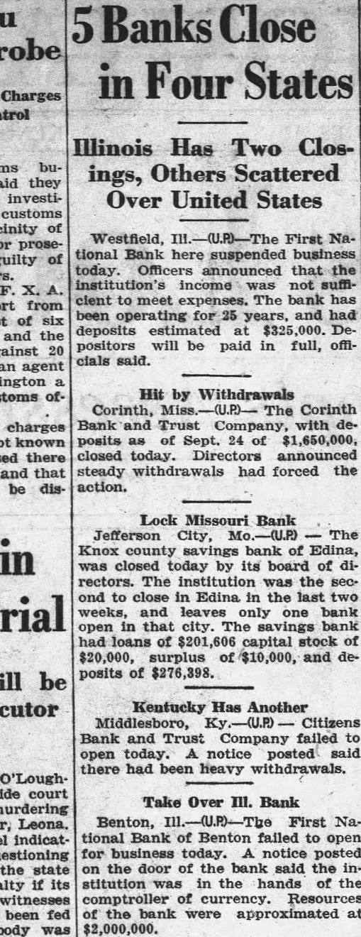 Banks Close in Four States Illinois Has Two Closings, Others Scattered Over United States Westfield, III.-(U.P)-The First National Bank here suspended business today. Officers announced that the institution's income was not sufficient to meet expenses. The bank has been operating for 25 years, and had deposits estimated at $325,000. Depositors will be paid in full, officials said. Hit by Withdrawals Corinth, Miss. The Corinth Bank and Trust Company, with deposits as of Sept. 24 of $1,650,000, closed today. Directors announced steady withdrawals had forced the action. Lock Missouri Bank Jefferson City, -(U.P.) The Knox county savings bank of Edina, was closed today by its board of directors. The institution was the second to close in Edina in the last two weeks, and leaves only one bank open in that city. The savings bank had loans of $201,606 capital stock of $20,000, surplus of $10,000, and deposits of $276,398. Kentucky Has Another Middlesboro, Ky.-(U.P.) Citizens Bank and Trust Company failed to open today. A notice posted said there had been heavy withdrawals. Take Over III. Bank Benton, Ill.-(U.P)-The First Na. tional Bank of Benton failed to open for business today. A notice posted on the door of the bank said the institution was in the hands of the comptroller of currency. Resources of the bank were approximated at $2,000,000.