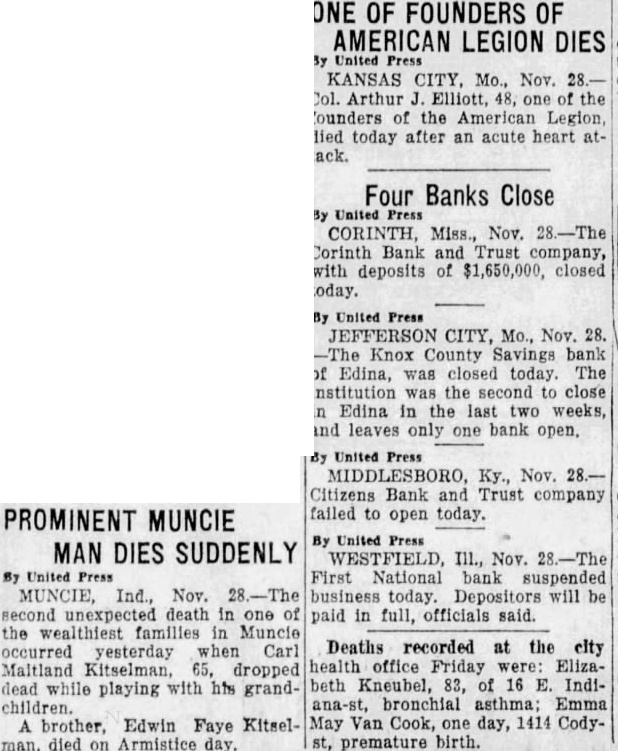 PROMINENT MUNCIE MAN DIES SUDDENLY ONE OF FOUNDERS OF AMERICAN LEGION DIES By United Press KANSAS CITY, Mo., Nov. 28 Col. Arthur J. Elliott, 48, one of the founders of the American Legion, died today after an acute heart attack. Four Banks Close By United Press CORINTH, Miss., Nov. 28.-The Corinth Bank and Trust company, with deposits of $1,650,000, closed today. By United Press JEFFERSON CITY, Mo., Nov. 28. -The Knox County Savings bank of Edina, was closed today. The institution was the second to close in Edina in the last two weeks, and leaves only one bank open. By United Press MIDDLESBORO. Ky., Nov. 28.Citizens Bank and Trust company failed to open today. By United Press WESTFIELD, Ill., Nov. 28.-The By United Press First National bank suspended MUNCIE, Ind., Nov. 28.-The business today. Depositors will be second unexpected death in one of paid in full, officials said. the wealthiest families in Muncie Deaths recorded at the city occurred yesterday when Carl Maltland Kitselman, 65, dropped health office Friday were: Elizabeth Kneubel, 83, of 16 E. Indidead while playing with his grandchildren. ana-st, bronchial asthma; Emma brother, Edwin Faye Kitsel- May Van Cook, one day, 1414 Codyman. died on Armistice day. st, premature birth.