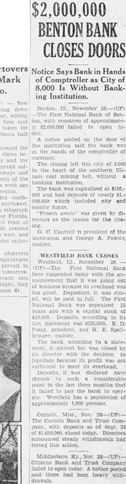 $2,000,000 BENTON CLOSES DOORS Notice Says Bank in Hands of Comptroller as City of 8,000 Is Without Banking Institution. The First National Bank of Benton, with resources of approximately $2,000,000 failed to open today. A notice posted on the door of the institution said the bank was in the hands of the comptroller of currency. The closing left this city of 8,000 in the heart of the southern Illinois coal mining belt, without banking institution The bank was capitalized at $100,000 and had deposits of nearly 000,000 which included city and county funds. "Frozen assets" was given by directors as the reason for the closing. G. C Cantrell is president of the institution and George A. Powers, cashier. WESTFIELD BANK CLOSES Westfield, November 28. (UP)-The First National Bank here suspended today with the announcement that it was going out of business because its overhead was too great. Depositors, It was stated, will be paid in full The First National Bank was organized 25 years ago with a capital stock of $50,000. Deposits. according to its last statement was $325,000. E. D. Flagg. president, and H. E. SpellThe bank. according to a statement, is solvent but was closed by its director with the decision to liquidate because its profit was not sufficient to meet its overhead. Deposits. it was declared have shrunk to such considerable point in the last three months that it failed to pay the bank to operate Westfield has population of approximately 1,000 persons, The Corinth Bank and Trust Company, with deposits as of Sept. 24 of $1,650,000, closed today. Directors announced steady withdrawals had forced this action. Middlesboro, Ky. Nov Citizens Bank and Trust Company failed to open today notice posted said there had been heavy withdrawals.