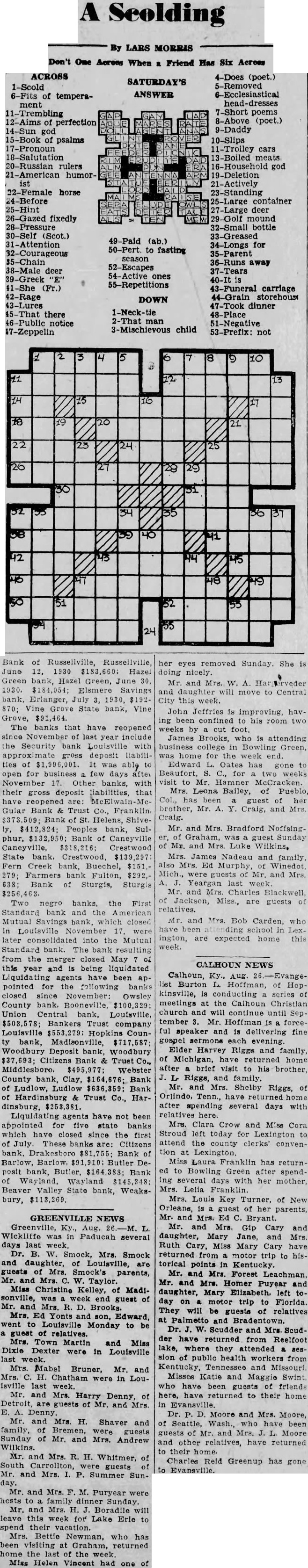 A Scolding By LARS MORRIS Don't One Across When a Friend Has Six Across ACROSS 1-Scold 6-Fits of temperament 11-Trembling 12-Aims of perfection 14-Sun god 15-Book of psalms 17-Pronoun 18-Salutation 20-Russian rulers 21-American humor- 22-Female horse 24-Before 25-Hint 26-Gazed fixedly 28-Pressure 30-Self (Scot.) 31-Attention 32-Courageous 38-Male deer 39-Greek "E" 41-She (Fr.) 42-Rage 43-Lures 45-That there 46-Public notice 17-Zeppelin SATURDAY'S ANSWER 49-Paid (ab.) 50-Pert. to fasting season 52-Escapes 54-Active ones 55-Repetitions DOWN 2-That man 3-Mischievous child 4-Does (poet.) 5-Removed 6-Ecclesiastical head-dresses 7-Short poems 8-Above (poet.) 9-Daddy 10-Slips 11-Trolley cars 13-Boiled meats 16-Household god 19-Deletion 21-Actively 23-Standing 25-Large container 27-Large deer 29-Golf mound 32-Small bottle 33-Greased 34-Longs for 35-Parent 36-Runs away 37-Tears 40-It is 43-Funeral carriage 44-Grain storehous 47-Took dinner 48-Place 51-Negative 53-Prefix: not Bank of Russellville, Russellville, June 12, 1930 $183,660: Hazel Green bank, Hazel Green, June 30. 1930, $184,054; Elsmere Savings bank, Erlanger, July 3, 1930, $192870; Vine Grove State bank, Vine Grove, $91,464. The banks that have reopened since November of last year include the Security bank Louisville with approximate gross deposit liabilities of $1,996,001. It was able to open for business few days after November 17. Other banks, with their gross deposit liabilities, that have reopened are: McElwain-McGular Bank & Trust Co., Franklin. $373,509; Bank of St. Helens, Shively, $412,824; Peoples bank, Sulphur, $132,950; Bank of Caneyville Caneyville, $318,216; Crestwood State bank, Crestwood, $139,297 Fern Creek bank, Buechel, $151.279; Farmers bank Fulton, $292,638; Bank of Sturgis, Sturgis Two negro banks, the First Standard bank and the American Mutual Savings bank, which closed In Louisville November 17. were later consolidated into the Mutual Standard bank. The bank resulting from the merger closed May 04 this year and is being liquidated Liquidating agents have been appointed for the following banks closed since November: Owsley County bank. Booneville, $100,329: Union Central bank, Louisville, $503,578; Bankers Trust company Louisville $553,279: Hopkins County bank, Madisonville, $717,587 Woodbury Deposit bank, Woodbury $37,693; Citizens Bank & Trust Co., Middlesboro. $495,977; Webster County bank, Clay, $164,676; Bank of Ludlow, Ludlow $636,359; Bank of Hardinsburg & Trust Co., Hardinsburg, $253,381. Liquidating agents have not been appointed for five state banks which have closed since the first of July These banks are: Citizens bank, Drakesboro $81,755: Bank of Barlow, Barlow. $91,910: Butler Deposit bank, Butler, $164,388; Bank of Wayland, Wayland $145,348; Beaver Valley State bank, Weaksbury, $113,269. GREENVILLE NEWS Greenville, Ky., Aug. 26.-M. L. Wickliffe was in Paducah several days last week. Dr. B. W. Smock, Mrs. Smock and daughter, of Louisville, are guests of Mrs. Smock's parents, Mr. and Mrs. C. W. Taylor. Miss Christine Kelley, of Madisonville, was week end guest of Mr. and Mrs. R. D. Brooks. Mrs. Ed Yonts and son, Edward, went to Louisville Monday to be a guest of relatives. Mrs. Town Martin and Miss Dixie Dexter were in Louisville last week. Mrs. Mabel Bruner, Mr. and Mrs. C. H. Chatham were in Louisville last week. Mr. and Mrs. Harry Denny, of Detroit, are guests of Mr. and Mrs. E. A. Denny. Mr. and Mrs. H. Shaver and family, of Bremen, were guests Sunday of Mr. and Mrs. Andrew Wilkins. Mr. and Mrs. R. H. Whitmer, of South Carrollton, were guests of Mr. and Mrs. I. P. Summer Sunday. Mr. and Mrs. F. M. Puryear were hcsts to family dinner Sunday Mr. and Mrs. H. J. Boradile will leave this week for Lake Erie to spend their vacation. Mrs. Bettle Newman, who has been visiting at Graham, returned home the last of the week. Miss Helen Vincent had one of her eyes removed Sunday. She is doing nicely. Mr. and Mrs. W. A. Har erveder and daughter will move to Central City this week. John Jeffries is improving, having been confined to his room two weeks by cut foot. James Brooks, who is attending business college in Bowling Green, was home for the week end. Edward L. Oates has gone to Beaufort, S. C., for two weeks visit to Mr. Hamner McCracken. Mrs. Leona Bailey, of Pueblo, Col., has been a guest of her brother, Mr. A. Y. Craig, and Mrs. Craig. Mr. and Mrs. Bradford Noffsinger, of Graham, was guest Sunday of Mr. and Mrs Luke Wilkins, Mrs. James Nadeau and family. also Mrs. Ed Murphy, of Winedot, Mich., were guests of Mr. and Mrs. A. Yeargan last week. Mr. and Mrs. Charles Blackwell, of Jackson, Miss., are guests of relatives. Mr. and Mrs. Bob Carden, who have been inding school in Lexington, are expected home this week. CALHOUN NEWS Calhoun, Ky., Aug. 26.-Evangelist Burton L. Hoffman, of Hopkinsville, is conducting series of meetings at the Calhoun Christian church and will continue until September 3. Mr. Hoffman is forceful speaker and is delivering fine gospel sermons each evening. Elder Harvey Riggs and family, of Michigan, have returned home after brief visit to his brother, J. L Riggs, and family. Mr. and Mrs. Shelby Riggs, of Orlindo, Tenn., have returned home after spending several days with relatives here. Mrs. Clara Crow and Mise Cora Stroud left today for Lexington to attend the county clerks' convention at Lexington. Miss Laura Franklin has returned to Bowling Green after spendIng several days with her mother, Mrs. Lelia Franklin. Mrs. Louis Key Turner, of New Orleans, is a guest of her parents, Mr. and Mrs. Ed C. Bryant. Mr. and Mrs. Gip Cary and daughter, Mary Jane, and Mrs. Ruth Cary, Miss Mary Cary have returned from a motor trip to historical points in Kentucky. Mr. and Mrs. Forest Leachman, Mr. and Mrs. Homer Puyear and daughter, Mary Elizabeth. left today on motor trip to Florida. They will be guests of relatives at Palmetto and Bradentown. Dr. J. W. Scudder and Mrs. Scudder have returned from