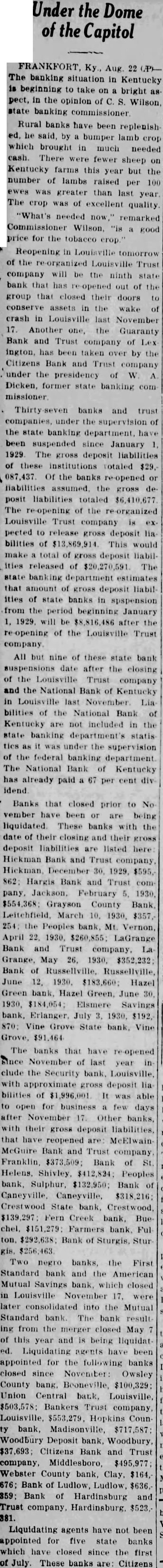 Under the Dome of the Capitol The banking situation in Kentucky is beginning to take on a bright as pect, in the opinion of C.S. Wilson, state banking commissioner Rural banks have been replenish ed, he said, by a bumper lamb crop which brought in much needed cash. There were fewer sheep on Kentucky farms this year but the number of lambs raised per 100 ewes was greater than last year. The crop was of excellent quality. "What's needed now," remarked Commissioner Wilson, "is a good price for the tobacco erop." Reopening in Louisville tomorrow of the re-organized Louisville Trust company will be the ninth state bank that has re-opened out of the group that closed their doors to conserve assets in the wake of crash in Louisville last November 17. Another one, the Guaranty Bank and Trust company of Lex ington, has been taken over by the Citizens Bank and Trust company under the presidency of W A Dicken, former state banking com missioner Thirty banks and trust companies, under the supervision of the state banking department. have been suspended since January 1. 1929. The gross deposit liabilities of these institutions totaled $29, 087,437 Of the banks re-opened or liabilities assumed, the gross deposit liabilities totaled $6,410,677 The re-opening of the re-organized Louisville Trust company is pected to release gross deposit lia bilities of $13,869,914. This would make a total of gross deposit liabilIties released of $20,270,591 The state banking department estimates that amount of gross deposit liabilities of state banks in spspension from the period beginning January 1, 1929. will be $8,816,486 after the re-opening of the Louisville Trust All but nine of these state bank suspensions date after the closing of the Louisville Trust company and the National Bank of Kentucky in Louisville last November Lia bilities of the National Bank of Kentucky are not included in the state banking department's statis ties as it was under the supervision of the federal banking department. The National Bank of Kentucky has already paid a 67 per cent dividend Banks that closed prior to No vember have been or are being liquidated. These banks with the date of their closing and their gross deposit liabilities are listed here: Hickman Bank and Trust company 862: Hargis Bank and Trust company, Jackson, February 5. 1930. $554,368: Grayson County Bank Leitchfield. March 10. 1930. $357, 254: the Peoples bank. Mt. Vernon, April 22. 1930. $260,855: LaGrange Bank and Trust company. La Grange, May 26. 1930. $352,232: Bank of Russellville, Russellville, June 12, 1930. $183,660; Hazel Green bank. Hazel Green, June 30. 1930. $184,054; Elsmere Savings bank, Erlanger, July 3. 1930. $192. 870: Vine Grove State bank, Vine Grove, $91,464 The banks that have re-opened since November of last year in clude the Security bank, Louisville, with approximate gross deposit lia bilities of $1,996,001 It was able to open for business a few days after November 17. Other banks, with their gross deposit liabilities, that have reopened are: McElwainMcGuire Bank and Trust company, Franklin, $373,509; Bank of St. Helens, Shivley, $412,834: Peoples bank, Sulphur, $132,950; Bank of Crestwood State bank, Crestwood, $139,297 Fern Creek bank, Bue ton. $292,638: Bank of Sturgis, Sturgis, $256,463 Two negro banks, the First Standard bank and the American Mutual Savings bank, which closed in Louisville November 17. were later consolidated into the Mutual Standard bank. The bank result ing from the merger closed May 7 of this year and is being liquidated. Liquidating agents have been appointed for the following banks closed since November: Owsley County bang, Beoneville, $100,329: Union Central bank, Louisville, $503,578: Bankers Trust company, Louisville, $553,279. Hopkins County bank, Madisonville, $717,587: Woodbury Deposit bank, Woodbury, $37,693; Citizens Bank and Trust company, Middlesboro, $495,977: Webster County bank, Clay, $164, 676; Bank of Ludlow, Ludlow, $636,359; Bank of Hardinsburg and Trust company, Hardinsburg. $523.381. Liquidating agents have not been appointed for five state banks which have closed since the first of July. These banks are: Citizens