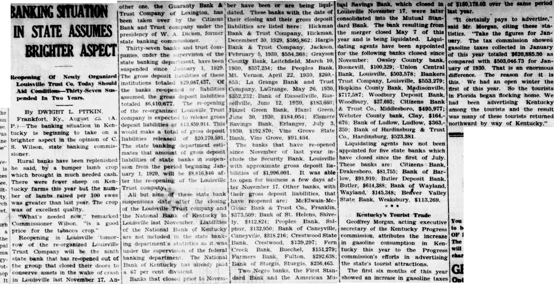 of the re-organized Louisville Trust company is expected to release gross deposit liabilities of $13,859,914. This would make a total of gross deposit liabilities released of $20,270,591. The state banking department estimates that amount of gross deposit liabilities of state banks in suspension from the period beginning January 1, 1929, will be $8,816,846 after the re-opening of the Louisville Trust company, All but nine of these state bank suspensions date after the closing of the Louisville Trust company and the National Bank of Kentucky in Louisville last November. Liabilities of the National Bank of Kentucky are not included in the state banking department's statistics as it was under the supervision of the federal banking department. The National Bank of Kentucky has already paid a 67 per cent dividend Banks that closed prior to Novem- other one. the Guaranty Bank ber have been or are being liquidated. These banks with the date of Trust Company of Lexington, has been taken over by the Citizens their closing and their gross deposit Bank and Trust company under the liabilities are listed here: Hickman presidency of W. A. Dicken, former Bank & Trust Company, Hickman, state banking commissioner. Decemberf 30, 1929, $595,862: Hargis Thirty-seven banks and trust com- Bank & Trust Company, Jackson, panies, under the supervision of the February 5, 1930, $554,368; Grayson state banking department, have been County Bank, Leitchfield, March 10, suspended since January 1, 1929 1930, $357,254; the Peoples Bank, The gross deposit liabilities of these Mt. Vernon, April 22, 1930, $260,institutions totaled $29,087,437. Of 855; La Grange Bank and Trust the banks re-opened or liabilities Company, LaGrange, May 26, 1930. assumed, the gross deposit liabilities $352,232; Bank of Russellville, Rustotaled $6,410,677. The re-opening sellville, June 12. 1930. $183,660; Hazel Green Bank, Hazel Green, June 30. 1930, $184,054: Elsmere Savings Bank, Erlanger, July 3, 1930. $192,870: Vine Grove State Bank, Vine Grove, $91,464. The banks that have re-opened since November of last year include the Security Bank. Louisville with approximate gross deposit liabilities of $1,996,001. It was able to open for business a few days after November 17. Other banks, with their gross deposit liabilities, that have reopened are: McElwain-McGuiar Bank & Trust Co., Franklin. $373,509: Bank of St. Helens, Shively, $412,824: Peoples Bank, Sulphur, $132,950; Bank of Caneyville, Caneyville, $318,216; Crestwood State Bank. Crestwood, $139,297: Fern Creek Bank, Buechel, $151,279; Farmers Bank, Fulton, $292,638; Bank of Sturgis, Sturgis, $256,463. Two Negro banks, the First Standard Bank and the American Mu- tual Savings Bank. which closed in Louisville November 17. were later consolidated into the Mutual Standard Bank. The bank resulting from the merger closed May 7 of this year and is being liquidated. Liquidating agents have been appointed for the following banks closed since November: Owsley County bank, Boonevill, $100,329; Union Central Bank, Louisville, $503,578; Bankers Trust Company, Louisville, $553,279; Hopkins County Bank, Madisonville, $717,587; Woodbury Deposit Bank, Woodbury, $37,693; Citizens Bank & Trust Co., Middlesboro, $495,977; Webster County bank, Clay, $164,676: Bank of Ludlow, Ludlow, $363,359: Bank of Hardinsburg & Trust Co., Hardinsburg, $523,381 Liquidating agents hav not been appointed for five state banks which have closed since the first of July. These banks are: Citizens Bank, Drakesboro, $81,755; Bank of Barlow, $91,910: Butler Deposit Bank. Butler, $614,388; Bank of Wayland, Wayland, $145,348; Beaver Valley State Bank. Weaksbury, $113,269. Kentucky's Tourist Trade Geoffrey Morgan, acting executive secretary of the Kentucky Progress commission, attributes the increase in gasoline consumption in Kentucky this year to the Progress commission's efforts in advertising the state's tourist attractions. The first six months of this year showed an increase in gasoline taxes of $180,178.03 over the same period last year. "It certainly pays to advertise," said Mr. Morgan, citing these statistics. "Take the figures for Janusry. The tax commission showed gasoline taxes collected in January of this year totaled $620,885.50 as compared with $503,046.73 for January of 1930. That is an enormous difference. The reason for it is this. We had an open winter the first of this year. So the tourists in Florida began flocking home. We had been advertising Kentucky among the tourists and the result was many of these tourists returned northward by way of Kentucky."
