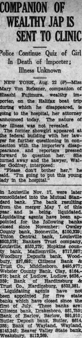 COMPANION OF WEALTHY JAP IS SENT TO CLINIC Police Continue Quiz of Girl In Death of Importer; Illness Unknown NEW YORK, Aug. 22 (P)-Miss Mary Von Refssner, companion of Hisashi Fujimura, wealthy importer, on the Halifax boat trip during which he disappeared, is going to the hospital, her attorney announced today. The nature of her Illness was not revealed. The former showgirl appeared at the federal building with her lawyer for further questioning in connection with the importer's disappearance and reporters pressed forward to question her She turned away and the lawyer, Walter Godfrey, interposed: "Please don't bother her," he said. "I'm going to put this young lady in the hospital.' in Louisville Nov. 17, were later consolidated into the Mutual Standard bank. The bank resulting from the merger May of this year and is being liquidated. Liquidating agents have been appointed for the following banks closed since November: Owsley County bank, Booneville, $100,329; Union Central bank, Louisville $503,578; Bankers Trust company, Louisville, $553,279; Hopkins county bank, Madisonville, $717,587; Woodbury Deposits bank, Woodbury, $37,693; Citizens Bank & Trust Co., Middlesboro, $495,977; Webster County Bank, Clay, $164,676; bank of Ludlow, Ludlow, $636,359; Bank of Hardinsburg & Trust Co., Hardinsburg, $523,381. Liquidating agents have not been appointed for five state banks which have closed since the first of July. These banks are: Citizens bank, Drakesboro, $81,755; Bank of Barlow, Barlow, $91,910; Butler Deposit bank, Butler, $614, 388; Bank of Wayland, Wayland, $145,348; Beaver Valley State bank, Weaksbury, $112,269.
