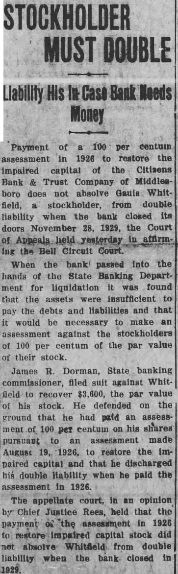 STOCKHOLDER MUST DOUBLE Liability His In Case Bank Needs Money Payment of a 100 per centum assessment in 1926 to restore the impaired capital of the Citizens Bank & Trust Company of Middlesboro does not absolve Gauis Whitfield, a stockholder, from double liability when the bank closed its doors November 28, 1929, the Court of Appeals held yesterday in affirm. ing the Bell Circuit Court. When the bank passed into the hands of the State Banking Department for liquidation it was found that the assets were insufficient to pay the debts and liabilities and that it would be necessary to make an assessment against the stockholders of 100 per centum of the par value of their stock. James R Dorman, State banking commissioner, filed suit against Whitfield to recover $3,600, the par value of his stock. He defended on the ground that he had paid an assessment of 100 per centum on his shares pursuant to an assessment made August 19, 1926, to restore the Impaired capital and that he discharged his double Hability when he paid the assessment in 1926. The appellate court, in an opinion by Chief Justice Rees, held that the payment OF "the assessment in 1926 to restore impaired capital stock did not absolve Whitfield from double liability when the bank closed in 1929.