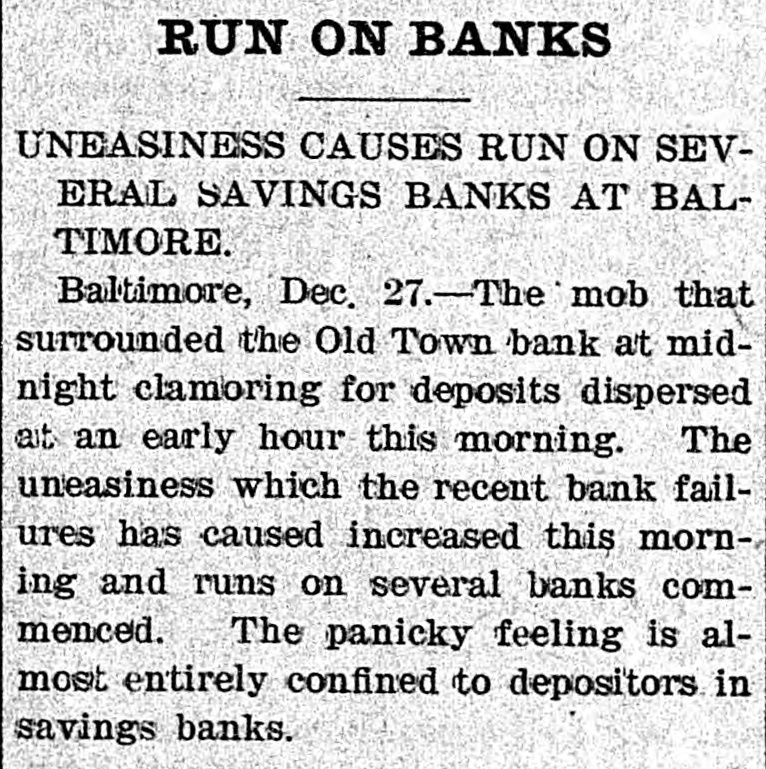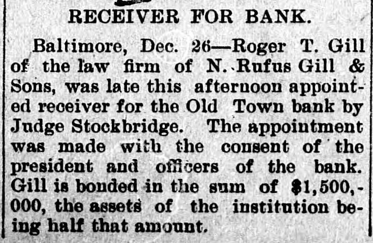 Reported to Have Incurred Heavy Losses by the Recent Failure of Two Business Concerns. RECEIVER'S BOND $1,500,000 ASSETS OF THE BANK SAID TO BE AMPLE TO PAY IN FULL. Admission by President Shipley that Current Obligations Cannot Be Met-Failure of Iron Company. BALTIMORE, Dec. 26.-Roger T. Gill, of the law firm of N. Rufus Gill & Sons, was late this afternoon appointer receiver for the Old Town Bank by Judge Stockbridge. The appointment was made with the consent of the president and officers of the bank. Mr. Gill bonded in the sum of $1,500,000, the assets of the institution being valued at half that amount. George Schilling, a stockholder and depositor, and Robert L. Gill, a depositor, were the complainants. In their statement to the court they said: "While the bank, until a recent period, has, done a successful and profitable business, it has recently incurred heavy losses by the bad faith of its cashier, Theodore F. Wilcox, in that, without authority, he wrongfully, without the knowledge of its president or board of directors, permitted Isaac Robinson and the United Milk Producers' Assoclation to draw from the bank large sums of money, and incurred / losses thereby which the bank is unable to bear. Rumors affecting the financial condition of the bank are in circulation, in consequence of which large sums of money have been withdrawn by depositors, and it is a question of but a short time when the bank will be compelled to close its doors. The bank is unable to pay its liabilities in the usual course of business, and unless a receiver is appointed it will result in a struggle to keep the doors of the bank open, and depositors will suffer loss." The answer, filed by President E. G. Shipley, is as follows: "The bank admits that, by reason of the facts stated in the bill of complaint, it is no longer able to meet its current obligations, and, believing that it cught not to further undertake to continue to do business, but that its assets should be held for the mutual benefit of all persons interested, it consents to the appointment of a receiver or receivers, as prayed." Both the firms mentioned in the bill of complaint are in receivers' hands. The bank was chartered by special act of the Legislature in 1858. Its authorized capital was $150,000. The president is E. G. Hipsley. The condition of the bank at close of business Sept. 5 was as follows: -Resources. -