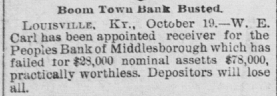 Boom Town Bank Busted. LOUISVILLE, Kr., October 19.-W. E. Carl has been appointed receiver for the Peoples Bank of Middlesborough which has failed for $28,000 nominal assetts $78,000, practically worthless. Depositors will lose all.