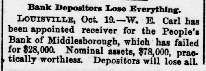 Bank Depositors Lose Everything. LOUISVILLE, Oct. 19.-W. E. Carl has been appointed receiver for the People's Bank of Middlesborough, which has failed for $28,000. Nominal assets, $78,000, practically worthless. Depositors will lose all.