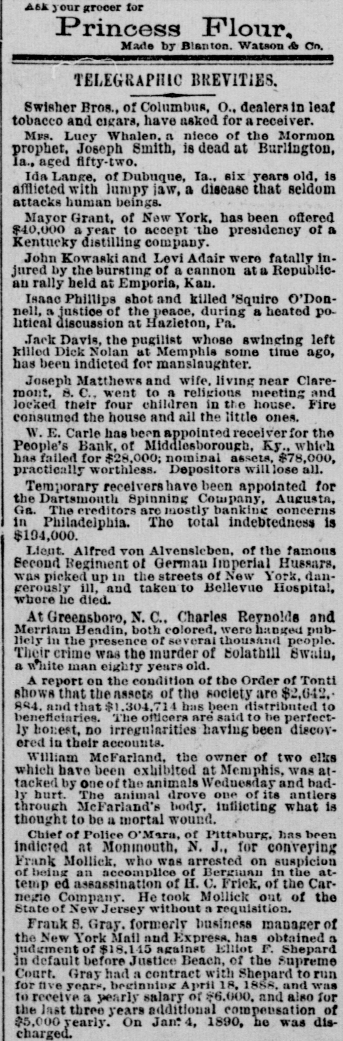 ASK your grocer for Princess Flour, Made by Blanton. Watson & Co. TELEGRAPHIC BREVITIES. Swisher Bros., of Columbus, O., dealers in leaf tobacco and cigars, have asked for a receiver. Mrs. Lucy Whalen, a niece of the Mormon prophet. Joseph Smith, is dead at Burlington, la., aged fifty-two. Ida Lange, of Dubuque, Ia., six years old, is afflicted with Jumpy jaw, a disease that seldom attacks human beings. Mayor Grant, of New York, has been offered $40,000 a year to accept the presidency of a Kentucky distilling company. John Kowaski and Levi Adair were fatally injured by the bursting of a cannon at Republican rally held at Emporia, Kan. Isaac Phillips shot and killed 'Squire O'Donnell, a justice of the peace, during a heated political discussion at Hazieton, Pa. Jack Davis, the pugilist whose swinging left killed Dick Nolan at Memphis some time ago, has been indicted for manslaughter. Joseph Matthews and wife, living near Claremont. 8. €., went to a religious meeting and locked their four children in the house. Fire consumed the house and all the little ones. W. E. Carle has been appointed receiver for the People's Bank, of Middlesborough, Ky., which has failed for $28,000; nominal assets, $78,000, practically worthless. Depositors will lose all. Temporary receivers have been appointed for the Dartsmouth Spinning Company, Augusta, Ga. The creditors are mostly banking concerns in Philadelphia. The total indebtedness is $194,000. Lieut. Alfred von Alvensleben, of the famous Second Regiment of German Imperial Hussars. was picked up in the streets of New York, dangerously ill, and taken to Bellevue Hospital, where he died. At Greensboro, N.C., Charles Reynolds and Merriam Headin, both colored, were hanged publiely in the presence of several thousand people. Their crime was the murder of Solathill Swain, a White man eighty years old. A report on the condition of the Order of Tonti shows that the assets of the society are $2,642. 884. and that $1.304,714 has been distributed to beneficiaries. The officers are said to be perfectly honest, no irregularities having been discovered in their accounts. William McFarland, the owner of two elks which have been exhibited at Memphis, was attacked by one of the animals Wednesday and badly hurt. The animal drove one of its antlers through McFarland's body. inflicting what is thought to be a mortal wound. Chief of Police O'Mara, of Pittaburg, has been indicted at Moninouth, N. J., for conveying Frank Mollick, who was arrested on suspicion of being an accomplice of Bergman in the attemp ed assassination of H. C. Frick, of the Carnegle Company. He took Mollick out of the State of New Jersey without a requisition. Frauk S. Gray. formerly business manager of the New York Mail and Express. has obtained a judgment of $18,145 against Elliot F. Shepard in default before Justice Beach, of the Supreme Court. Gray had a contract with Shepard to run for five years, beginning April 18, 1888, and was to receive a yearly salary of $6,000, and also for the last three years additional compensation of $5,000 yearly. On Jan: 4, 1890, he was discharged.