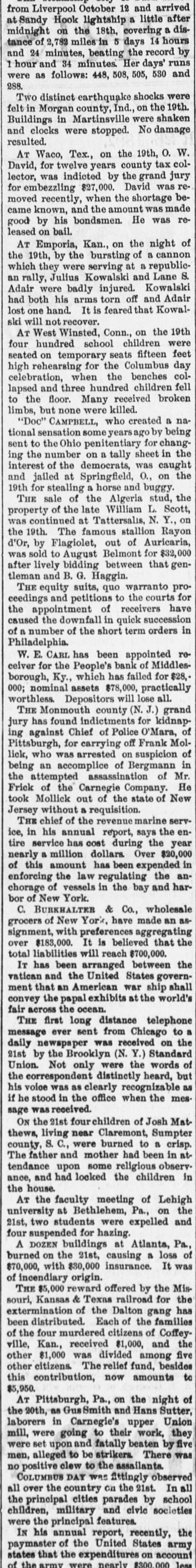 from Liverpool October 12 and arrived at Sandy Hook lightship a little after midnight on the 18th, covering a distance of 2,782 miles in 5 days 14 hours and 24 minutes, beating the record by 1 hour and 34 minutes. Her days' runs were as follows: 448, 508, 505, 530 and 288. Two distinct earthquake shocks were felt in Morgan county, Ind., on the 19th. Buildings in Martinsville were shaken and clocks were stopped. No damage resulted. AT Waco, Tex., on the 19th, O. W. David, for twelve years county tax collector, was indicted by the grand jury for embezzling $27,000. David was removed recently, when the shortage became known, and the amount was made good by his bondsmen. He was released on bail. AT Emporia, Kan., on the night of the 19th, by the bursting of a cannon which they were serving at a republican rally, Julius Kowalski and Lane S. Adair were badly injured. Kowalski had both his arms torn off and Adair lost one hand. It is feared that Kowalski will not recover. AT West Winsted, Conn., on the 19th four hundred school children were seated on temporary seats fifteen feet high rehearsing for the Columbus day celebration, when the benches collapsed and three hundred children fell to the floor. Many received broken limbs, but none were killed. "Doc" CAMPBELL, who created a national sensation some years ago by being sent to the Ohio penitentiary for changing the number on a tally sheet in the interest of the democrats, was caught and jailed at Springfield, O., on the 19th for stealing a horse and buggy. THE sale of the Algeria stud, the property of the late William L. Scott, was continued at Tattersalis, N. Y., on the 19th. The famous stallion Rayon d'Or, by Flagiolet, out of Auricaria, was sold to August Belmont for $32,000 after lively bidding between that gentleman and B. G. Haggin. THE equity suits, quo warranto proceedings and petitions to the courts for the appointment of receivers have caused the downfall in quick succession of a number of the short term orders in Philadelphia. W. E. CARL has been appointed roceiver for the People's bank of Middlesborough, Ky., which has failed for $28,000; nominal assets $78,000, practically worthless. Depositors will lose all. THE Monmouth county (N. J.) grand jury has found indictments for kidnaping against Chief of Police O'Mara, of Pittsburgh, for carrying off Frank Mollick, who was arrested on suspicion of being an accomplice of Bergmann in the attempted assassination of Mr. Frick of the Carnegie Company. He took Mollick out of the state of New Jersey without a requisition. THE chief of the revenue marine service, in his annual report, says the entire service has cost during the year nearly a million dollars Over $20,000 of this amount has been expended in enforcing the law regulating the anchorage of vessels in the bay and harbor of New York. C. BURKHALTER & Co., wholesale grocers of New York, have made an assignment, with preferences aggregating over $183,000. It is believed that the total liabilities will reach $700,000. IT has been arranged between the vatican and the United States government that an American war ship shall convey the papal exhibits at the world's fair across the ocean. THE first long distance telephone message ever sent from Chicago to a daily newspaper was received on the 21st by the Brooklyn (N. Y.) Standard Union. Not only were the words of the correspondent distinctly heard, but his voice was as clearly recognizable as if he stood in the office when the mes. sage was received. ON the 21st four children of Josh Matthews, living near Claremont, Sumpter county, S. C., were burned to a crisp. The father and mother had been in attendance upon some religious observance, and had locked the children in the house. AT the faculty meeting of Lehigh university at Bethlehem, Pa., on the 21st, two students were expelled and four suspended for hazing. A DOZEN buildings at Atlanta, Pa., burned on the 21st, causing a loss of $70,000, with $30,000 insurance. It was of incendiary origin. THE $5,000 reward offered by the Missouri, Kansas & Texas railroad for the extermination of the Dalton gang has been distributed. Each of the families of the four murdered citizens of Coffeyville, Kan., received $1,000, and the other $1,000 was divided among five other citizens. The relief fund, besides this contribution, now amounts to $5,950. AT Pittsburgh, Pa., on the night of the 20th, as GusSmith and Hans Sutter, laborers in Carnegie's upper Union mill, were going to their work, they were set upon and fatally beaten by five men, alleged to be strikers. There was no positive clew to the assailants. COLUMBUS DAY was Attingly observed all over the country on the 21st. In all the principal cities parades by school children, military and civic societies were the principal features. IN his annual report, recently, the paymaster of the United States army states that the expenditures on account of the armv were nearly $300 000 less