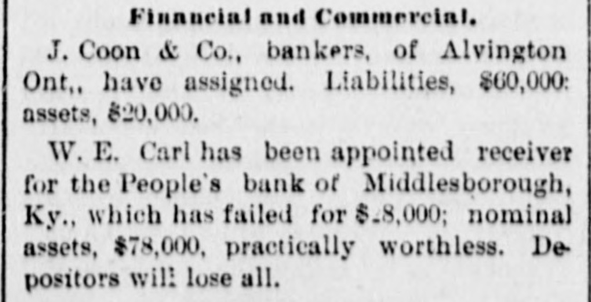 Financial and Commercial. J. Coon & Co., bankers, of Alvington Ont,, have assigned. Liabilities, $60,000: assets, $20,000. W.E. Carl has been appointed receiver for the People's bank of Middlesborough, Ky., which has failed for $28,000; nominal assets, $78,000, practically worthless. Depositors will lose all.
