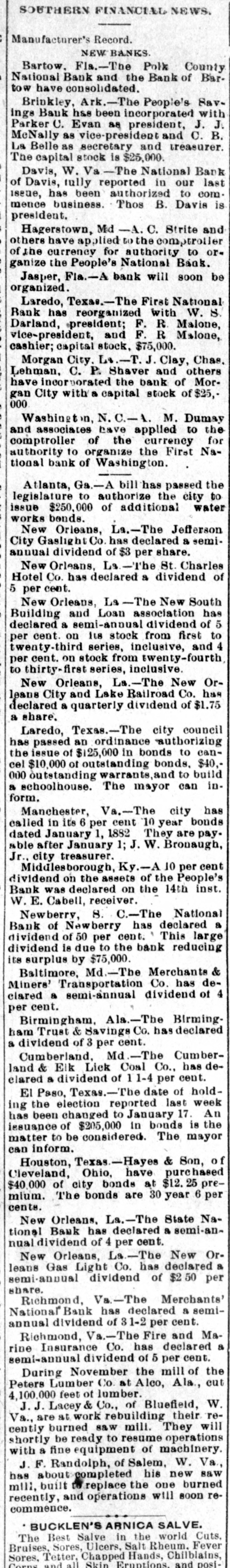SOUTHERN FINANCIAL NEWS. Manufacturer's Record. ### NEW BANKS. Bartow, Fla. The Polk County National Bank and the Bank of Bartow have consolidated. Brinkley, Ark. The People's Savings Bank has been incorporated with Parker C. Evan as president, J. J. McNally as vice-president and C. B. La Belle as secretary and treasurer. The capital stock is $25,000. Davis, W. Va. The National Bank of Davis, tully reported in our last iseue, has been authorized to commence business. Thos B. Davis is president. Hagerstown, Md. A. C. Strite and others have applied to the comptroller of the currency for authority to organize the People's National Bank. Jasper, Fla. A bank will soon be organized. Laredo, Texas. The First National Rank has reorganized with W. S. Darland, president; F. R. Malone, vice-president, and F. R. Malone, cashier; capital stock, $75,000. Morgan City. La. T. J. Clay, Chas, Lehman, C. P. Shaver and others have incorporated the bank of Morgan City with a capital stock of $25,000. Washington, N. C. A. M. Dumay and associates have applied to the comptroller of the currency for authority to organize the First National bank of Washington. Atlanta, Ga. A bill has passed the legislature to authorize the city to issue $250,000 of additional water works bonds. New Orleans, La. The Jefferson City Gaslight Co. has declared a semi-annual dividend of $3 per share. New Orleans, La. The St. Charles Hotel Co. has declared a dividend of 5 per cent. New Orleans, La. The New South Building and Loan association has declared a semi-annual dividend of 5 per cent. on its stock from first to twenty-third series, inclusive, and 4 per cent. on stock from twenty-fourth, to thirty-first series, inclusive. New Orleans, La. The New Orleans City and Lake Railroad Co. has declared a quarterly dividend of $1.75 a share. Laredo, Texas. The city council has passed an ordinance authorizing the issue of $125,000 in bonds to cancel $10,000 of outstanding bonds, $40,000 outstanding warrants, and to build a schoolhouse. The mayor can inform. Manchester, Va. The city has called in its 6 per cent 10 year bonds dated January 1, 1882 They are payable after January 1; J. W. Bronaugh, Jr., city treasurer. Middlesborough, Ky. A 10 per cent dividend on the assets of the People's Bank was declared on the 14th inst. W. E. Cabell, receiver. Newberry, S. C. The National Bank of Newberry has declared a dividend of 50 per cent. This large dividend is due to the bank reducing its surplus by $75,000. Baltimore, Md. The Merchants & Miners' Transportation Co. has declared a semi-annual dividend of 4 per cent. Birmingham, Ala. The Birmingham Trust & Savings Co. has declared a dividend of 3 per cent. Cumberland, Md. The Cumberland & Elk Lick Coal Co., has declared a dividend of 1 1-4 per cent. El Paso, Texas. The date of holding the election reported last week has been changed to January 17. An iesuance of $205,000 in bonds is the matter to be considered. The mayor can inform. Houston, Texas. Hayes & Son, of Cleveland, Ohio, have purchased $40,000 of city bonds at $12.25 premium. The bonds are 30 year 6 per cents. New Orleans, La. The State National Bank has declared a semi-annual dividend of 4 per cent. New Orleans, La. The New Orleans Gas Light Co. has declared a semi-annual dividend of $2.50 per share. Richmond, Va. The Merchants' National Bank has declared a semi-annual dividend of 3 1-2 per cent. Richmond, Va. The Fire and Marine Insurance Co. has declared a semi-annual dividend of 5 per cent. During November the mill of the Peters Lumber Co. at Alco, Ala., cut 4,100,000 feet of lumber. J. J. Lacey & Co., of Bluefield, W. Va., are at work rebuilding their recently burned saw mili. They will shortly be ready to resume operations with a fine equipment of machinery. J. F. Randolph, of Salem, W. Va., has about completed his new saw mill, built to replace the one burned recently, and operations will soon recommence. ### BUCKLEN'S ARNICA SALVE. The Best Salve in the world Cuts, Bruises, Sores, Ulcers, Salt Rheum, Fever Sores, Tetter, Chapped Hands, Chilblains, Corns and all Skin Eruptions, and posi-