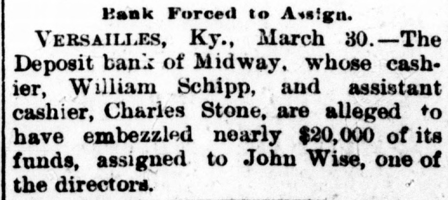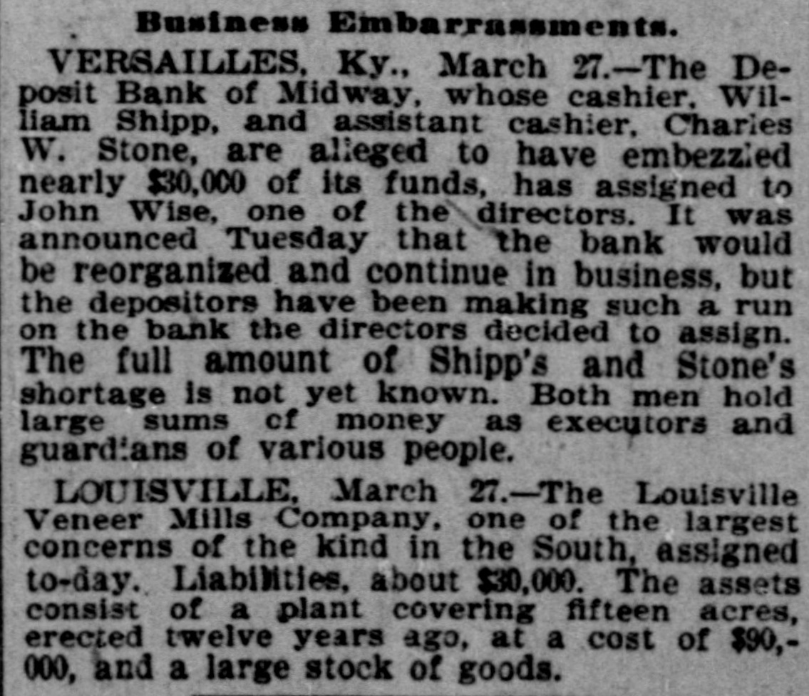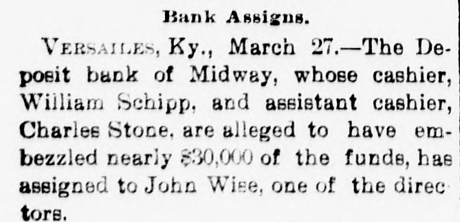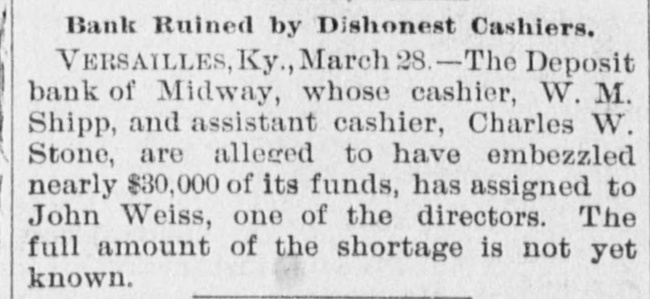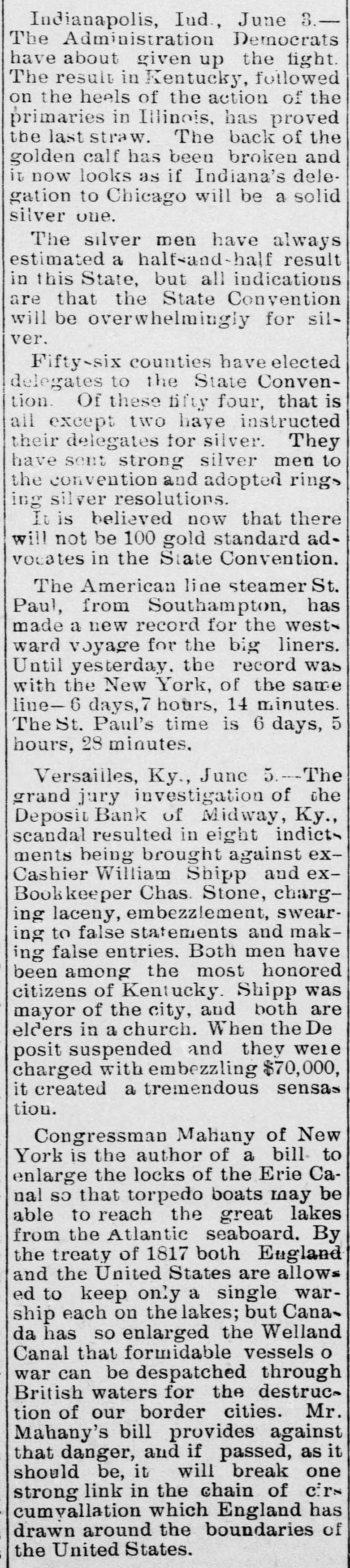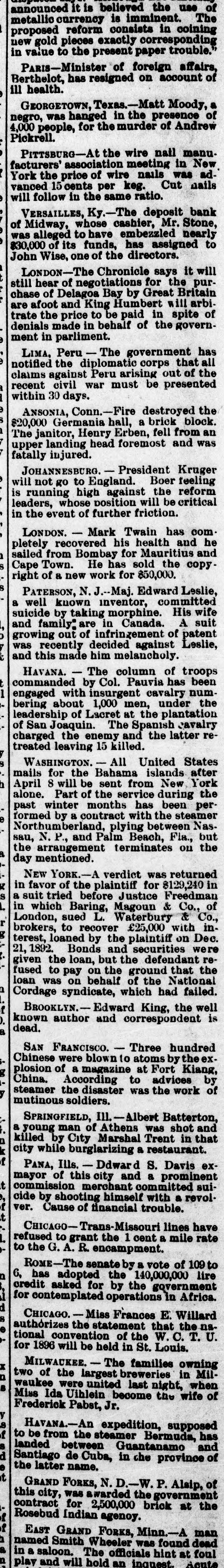 announced it is believed the use of metallic currency is imminent. The proposed reform consists in coining new gold pieces exactly corresponding in value to the present paper trouble." PARIS-Minister of foreign affairs, Berthelot, has resigned on account of ill health. GEORGETOWN, Texas.-Matt Moody, a negro, was hanged in the presence of 4,000 people, for the murder of Andrew Pickrell. PITTSBURG-At the wire nail manufacturers' association meeting in New York the price of wire nails was advanced 15 cents per keg. Cut nails will follow in the same ratio. VERSAILLES, Ky.-The deposit bank of Midway, whose cashier, Mr. Stone, was alleged to have embezzled nearly $30,000 of its funds, has assigned to John Wise, one of the directors. LONDON-The Chronicle says it will still hear of negotiations for the purchase of Delagoa Bay by Great Britain are afoot and King Humbert will arbitrate the price to be paid in spite of denials made in behalf of the government in parliment. LIMA. Peru - The government has notified the diplomatic corps that all claims against Peru arising out of the recent civil war must be presented within 30 days. ANSONIA, Conn.-Fire destroyed the $20,000 Germania hall, a brick block. The janitor, Henry Erben, fell from an upper landing head foremost and was fatally injured. JOHANNESBURG. - President Kruger will not go to England. Boer feeling is running high against the reform leaders, whose position will be critical in the event of further friction. LONDON. - Mark Twain has com pletely recovered his health and he sailed from Bombay for Mauritius and Cape Town. He has sold the copyright of a new work for 850,000. PATERSON, N. J.--Maj. Edward Leslie, a well known inventor, committed suicide by taking morphine. His wife and family: are in Canada. A suit growing out of infringement of patent was recently decided against Leslie, and this made him melancholy. HAVANA. - The column of troops commanded by Col. Pauvia has been engaged with insurgent cavalry numbering about 1,000 men, under the leadership of Lacret at the plantation of San Joaquin. The Spanish cavalry charged the enemy and the latter retreated leaving 15 killed. WASHINGTON. - All United States mails for the Bahama islands after April 8 will be sent from New York alone. Part of the service during the past winter months has been performed by a contract with the steamer Northumberland, plying between Nassau, N. P., and Palm Beach, Fla., but the arrangement terminates on the day mentioned. NEW YORK.-A verdict was returned in favor of the plaintiff for $129,240 in a suit tried before Justice Freedman in which Baring, Magoun & Co., of London, sued L. Waterbury & Co., brokers, to recover £25,000 with interest, loaned by the plaintiff on Dec. 21, 1892. Bonds and securities were given the loan, but the defendant refused to pay on the ground that the loan was on behalf of the National Cordage syndicate, which had failed. BROOKLYN. Edward King, the well known author and correspondent is dead. SAN FRANCISCO. - Three hundred Chinese were blown to atoms by the explosion of a magazine at Fort Kiang, China. According to advices by steamer the disaster was the work of mutinous soldiers. SPRINGFIELD, Ill.-Albert Batterton, a young man of Athens was shot and killed by City Marshal Trent in that city while burglarizing a restaurant. PANA, Ills. - Ddward S. Davis exmayor of this city and a prominent commission merchant committed suicide by shooting himself with a revolver. Cause of financial trouble. CHICAGO-Trans-Missouri lines have refused to grant the 1 cent a mile rate to the G. A. R. encampment. ROME-The senate by a vote of 109 to 6, has adopted the 140,000,000 lire credit asked for by the government for contemplated operations in Africa. CHICAGO. - Miss Frances E. Willard authorizes the statement that the national convention of the W. C. T. U. for 1896 will be held in St. Louis. MILWAUKEE. - The families owning two of the largest breweries in Milwaukee were united last night, when Miss Ida Uihlein become the wife of Frederick Pabst, Jr. HAVANA.-An expedition, supposed to be from the steamer Bermuda, has landed between Guantanamo and Santiago de Cuba, in che province of the latter name. GRAND FORKS, N. D.-W. P. Alsip, of this city, was awarded the government contract for 2,500,000 brick at the Rosebud Indian agenoy. EAST GRAND FORKS, Minn.-A man named Smith Wheeler was found dead in a saloon. The officials hint at foul play and will hold an inquest. Acute