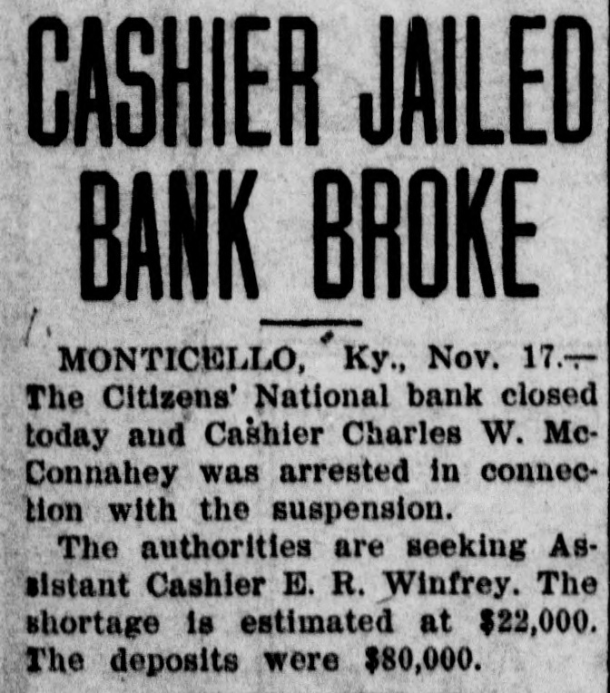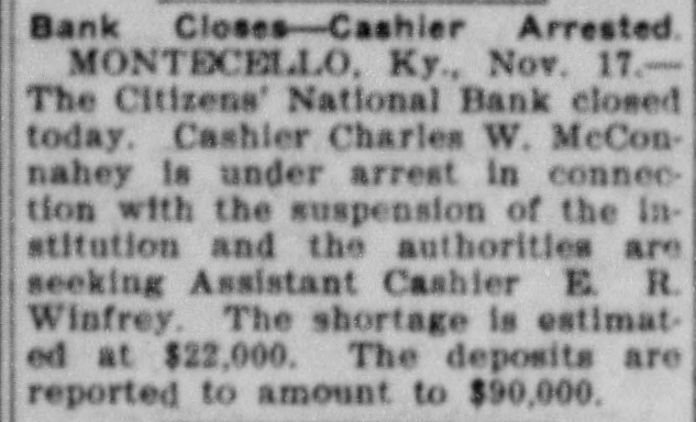Bank Closes-Cashier Arrested. MONTECELLO, Ky., Nov. 17.The Citizens' National Bank closed today. Cashier Charles W. McConnahey is under arrest in connection with the suspension of the Institution and the authorities are seeking Assistant Cashier E. R. Winfrey. The shortage is estimated at $22,000. The deposits are reported to amount to $90,000.