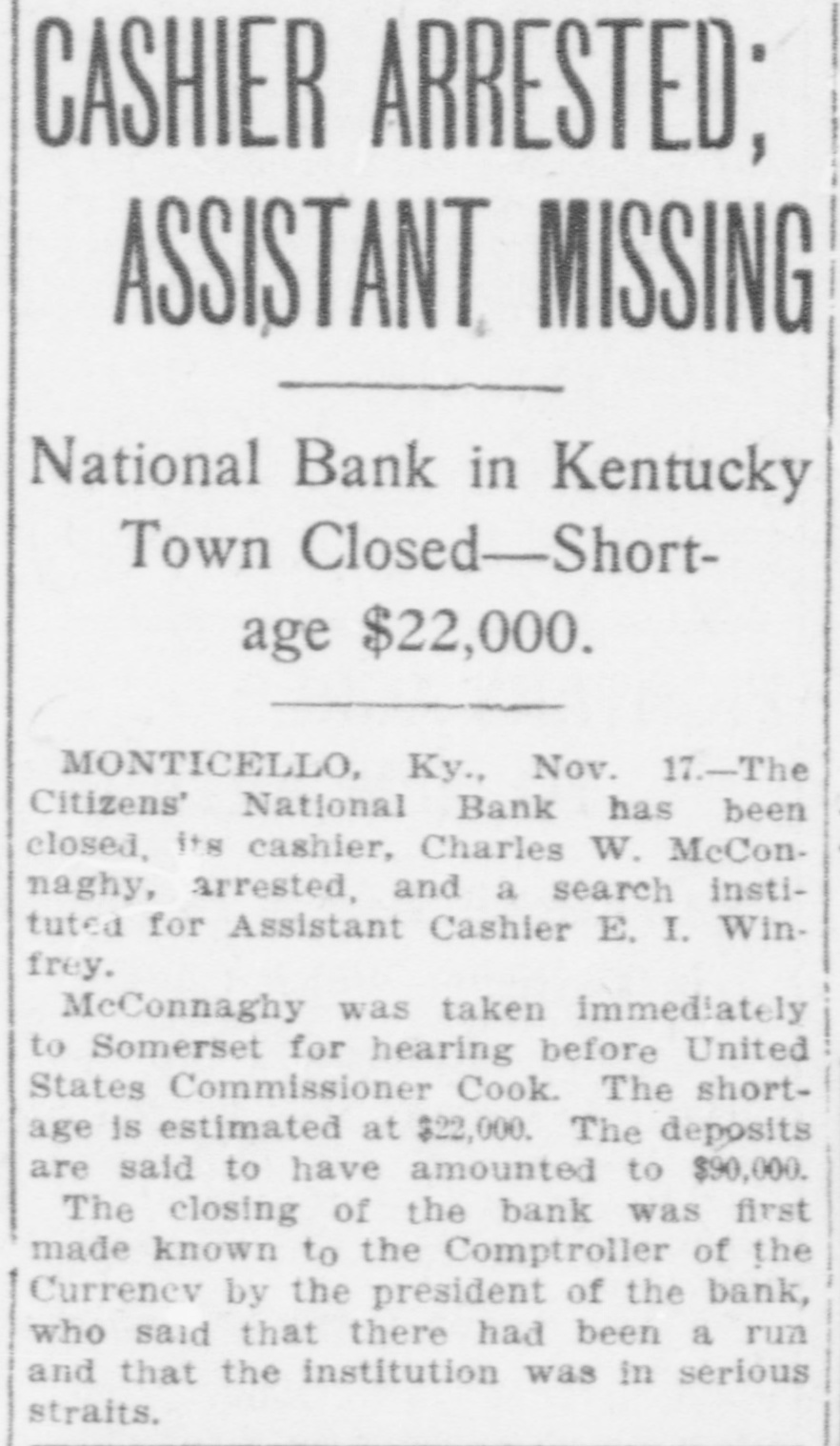 CASHIER ARRESTED; ASSISTANT MISSING National Bank in Kentucky Town Closed-Shortage $22,000. MONTICELLO, Ky., Nov. 17.-The Citizens' National Bank has been closed, its cashier, Charles W. McConnaghy, arrested, and a search instituted for Assistant Cashier E. I. Winfrey. McConnaghy was taken immediately to Somerset for hearing before United States Commissioner Cook. The shortage is estimated at $22,000. The deposits are said to have amounted to $90,000. The closing of the bank was first made known to the Comptroller of the Currenev by the president of the bank, who said that there had been a run and that the institution was in serious straits.