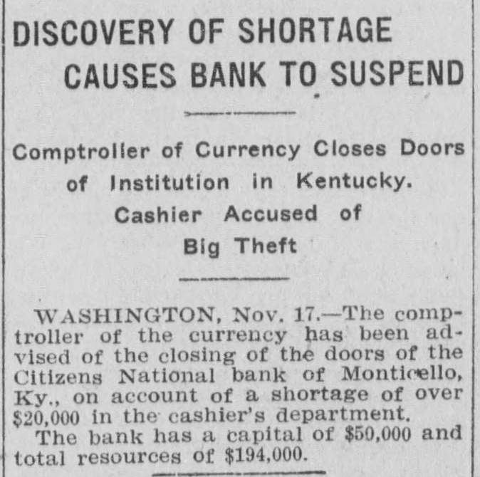 DISCOVERY OF SHORTAGE CAUSES BANK TO SUSPEND Comptroller of Currency Closes Doors of Institution in Kentucky. Cashier Accused of Big Theft WASHINGTON, Nov. 17.-The comptroller of the currency has been advised of the closing of the doors of the Citizens National bank of Monticello, Ky., on account of a shortage of over $20,000 in the cashier's department. The bank has a capital of $50,000 and total resources of $194,000.
