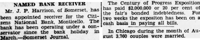 NAMED BANK RECEIVER Mr. J. P. Harrison, of Somerset, has been appointed receiver for the Citizens National Bank, Monticello. The bank has been operating under a conservator since the bank holiday in
