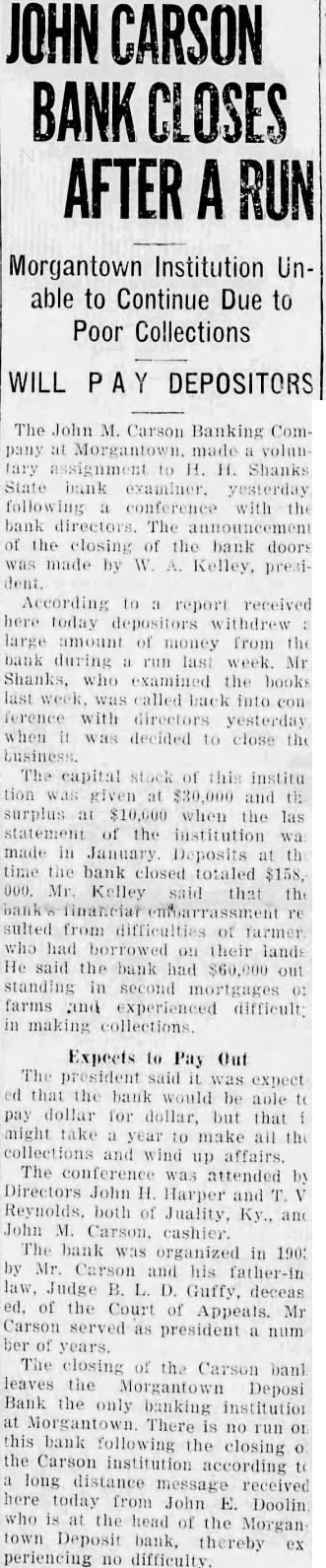 CARSON BANK AFTER Morgantown Institution Unable to Continue Due to Poor Collections WILL DEPOSITORS The John M. Carson Banking Com pany Morgantown, made volun assignment to H. H. Shanks State bank examiner. yesterday following conference with the bank directors. The announcement of the closing of the bank doors made by Kelley, presiAccording to report received here today withdrew large amount of money from the bank during run last week Shanks, examined books week into ference directors yesterday when decided to close the business. The capital stock this institu tion was given and surplus $10,000 when the las statement of the institution made in January Deposits th time the bank closed totaled $158. Kelley said that the sulted from difficulties of farmer had borrowed their lands He said the bank had out standing in second farms and experienced difficult making collections. Expects to Pay Out The said expect that the bank would be pay dollar for dollar, but that might take year to make all the wind up affairs. The conference was attended Directors John Harper and Reynolds, both of Juality, Ky., and John M. Carson. cashier. The bank was organized in 190: by Mr. Carson and his father-in law. Judge Guffy, deceas ed. of the Court of Appeals. Mr Carson served as president num years. The closing of the Carson bank leaves the Morgantown Deposi Bank the only banking institution There no run or bank the closing the Carson institution according long distance message received here today from E. John Doolin who the head of the Morgan town Deposit thereby periencing no difficulty
