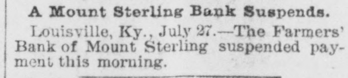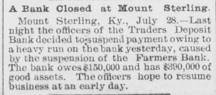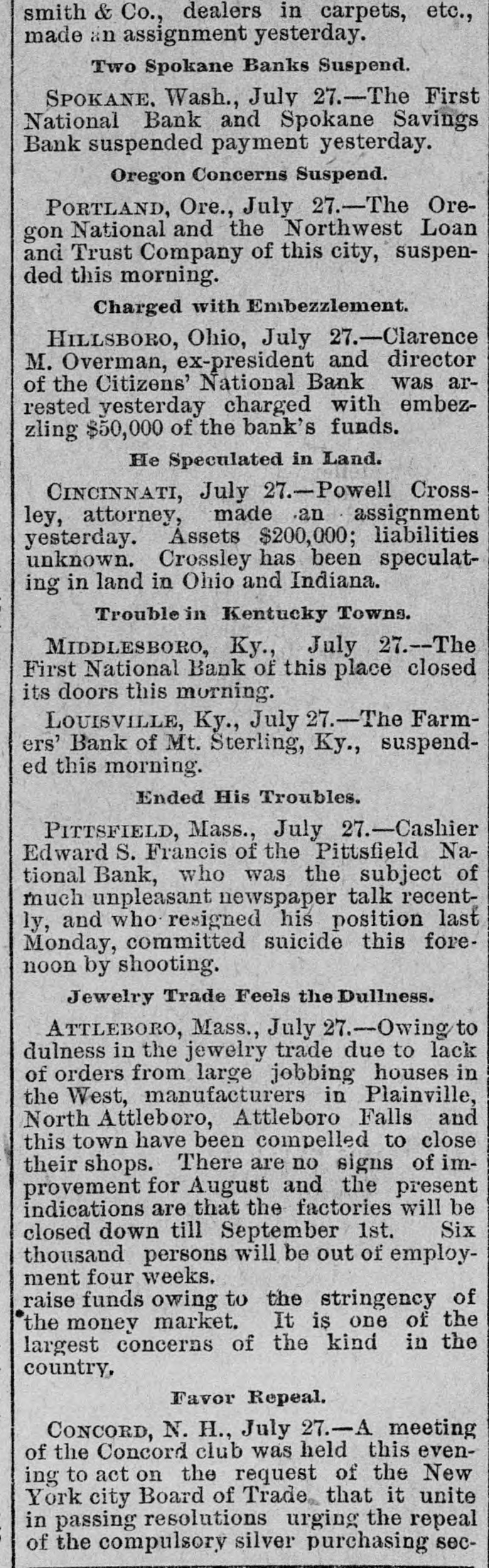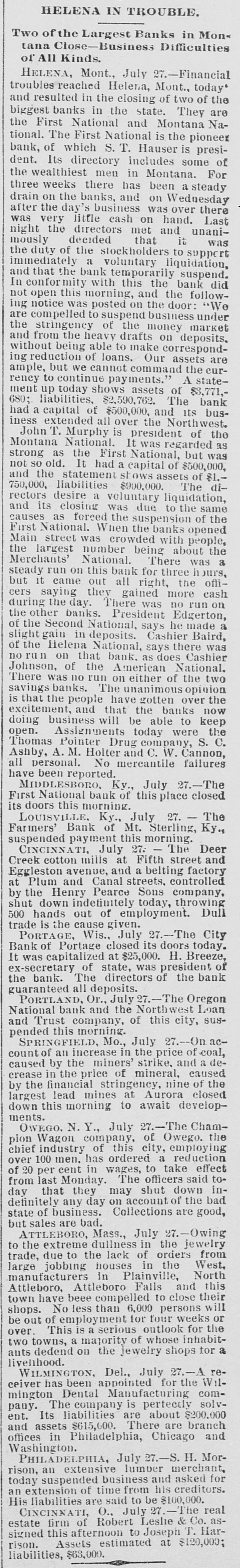 HELENA IN TROUBLE. wo of the Largest Banks in Mon< tana Close-Business Difficulties of All Kinds. HELENA, Mont., July 27.-Financial coubles reached Helena, Mont., today' nd resulted in the closing of two of the iggest banks in the state. They are he First National and Montana Naonal. The First National is the pioneer ank, of which S. T. Hauser is presient. Its directory includes some of he wealthiest men in Montana. For iree weeks there has been a steady rain on the banks, and on Wednesday fter the day's business was over there as very little cash on hand. Last ight the directors met and unanihously decided that it was he duty of the stockholders to support nmediately a voluntary liquidation, nd that the bank temporarily suspend. n conformity with this the bank did ot open this morning, and the followig notice was posted on the door: "We re compelled to suspend business under ie stringency of the money market nd from the heavy drafts on deposits. ithout being able to make correspondig reduction of loans. Our assets are mple, but we cannot command the curency to continue payments." A stateent up today shows assets of $3,771,80; liabilities, $2,590,762. The bank ad a capital of $500,000, and its busess extended all over the Northwest. John T. Murphy is president of the Iontana National. It was regarded as trong as the First National, but was ot SO old. It had a capital of $500,000, -'18 10 assess SMO Is statement the pu 50,000, liabilities $900,000. The diectors desire a voluntary liquidation, nd its closing was due to the same auses as forced the suspension of the irst National. When the banks opened lain street was crowded with people, e largest number being about the lerchants' National. There was a teady run on this bank for three hours, ut it came out all right, the offiers saying they gained more cash uring the day. There was no run on e other banks. President Edgerton, i the Second National, says he made a ight gain in deposits. Cashier Baird, : the Helena National, says there was o run on that bank. as does Cashier ohnson, of the American National. here was no run on either of the two avings banks. The unanimous opinion that the people have gotten over the xcitement, and that the banks now oing business will be able to keep ben. Assignments today were the homas Pointer Drug company, S. C. shby, A. M. Holter and C. W. Cannon, II personal. No mercantile failures ave been reported. MIDDLESBORO. Ky., July 27.-The irst National bank of this place closed S doors this morning. LOUISVILLE, Ky., July 27. - The armers' Bank of Mt. Sterling, Ky., spended payment this morning. CINCINNATI, July 27. - The Deer reek cotton mills at Fifth street and ggleston avenue, and a belting factory ; Plum and Canal streets, controlled y the Henry Pearce Sons company, nut down indefinitely today, throwing 0 hands out of employment. Dull ade is the cause given. PORTAGE, Wis., July 27.-The City ank of Portage closed its doors today. was capitalized at $25,000. H. Breeze, -secretary of state, was president of e bank. The directors of the bank