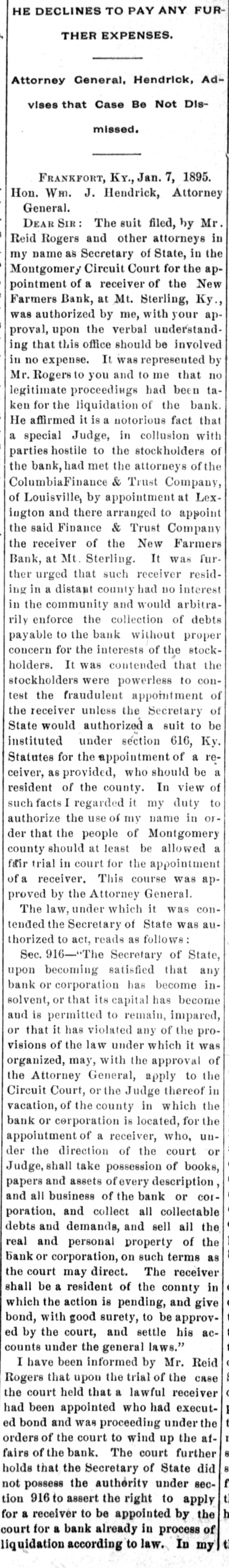 HE DECLINES TO PAY ANY THER EXPENSES. Attorney General, Hendrick, vises that Case Be Not Dismissed. FRANKFORT, KY., Jan. 7, 1895. Hon. Wm. J. Hendrick, Attorne General. DEAR SIR: The suit filed, by Reid Rogers and other attorneys my name as Secretary of State, in Montgomery Circuit Court for the pointment of a receiver of the Farmers Bank, at Mt. Sterling, Ky was authorized by me, with your proval, upon the verbal understand ing that this office should be involve in no expense. It was represented Mr. Rogers to you and to me that legitimate proceedings had been ken for the liquidation of the He affirmed it is a notorious fact tha a special Judge, in collusion parties hostile to the stockholders the bank, had met the attorneys of ColumbiaFinance & Trust Company of Louisville, by appointment at ington and there arranged to appoin the said Finance & Trust Compan the receiver of the New Farmer Bank, at Mt. Sterling. It was ther urged that such receiver ing in a distant county had no interes in the community and would arbitra rily enforce the collection of payable to the bank without concern for the interests of the holders. It was contended that stockholders were powerless to test the fraudulent appointment the receiver unless the Secretary State would authorized a suit to instituted under section 616, Statutes for the appointment of a ceiver, as provided, who should be resident of the county. In view such facts I regarded it my duty authorize the use of my name in or der that the people of Montgomer county should at least be allowed fair trial in court for the appointmen of a receiver. This course was proved by the Attorney General. The law, under which it was tended the Secretary of State was thorized to act, reads as follows: Sec. 916-"The Secretary of State