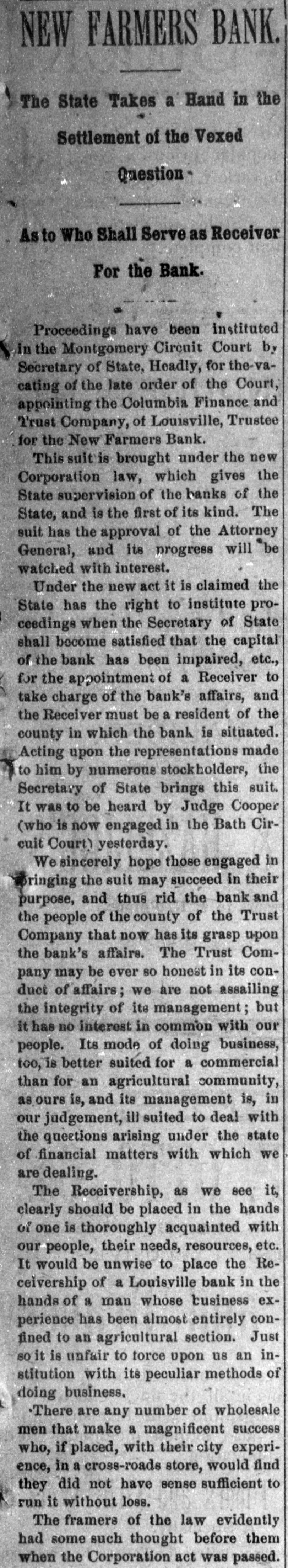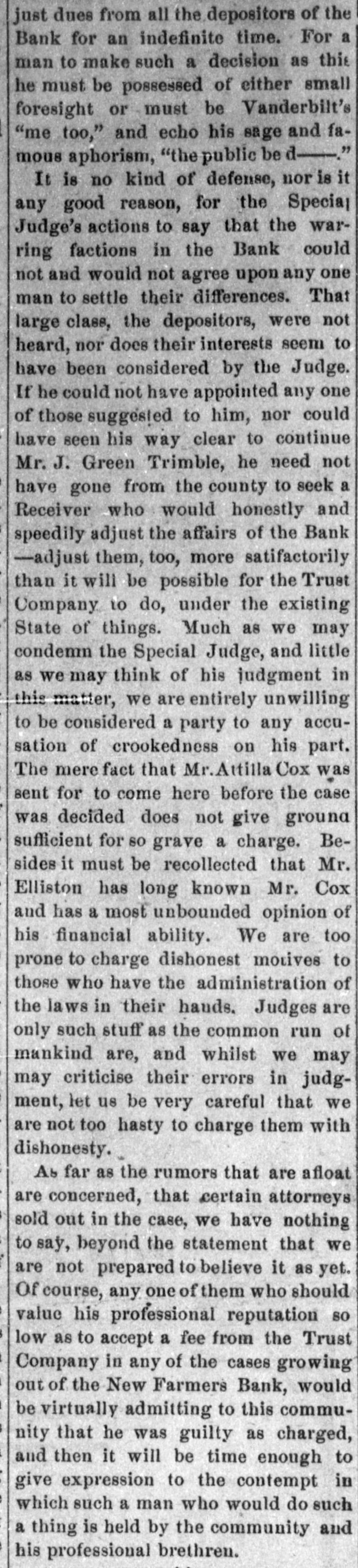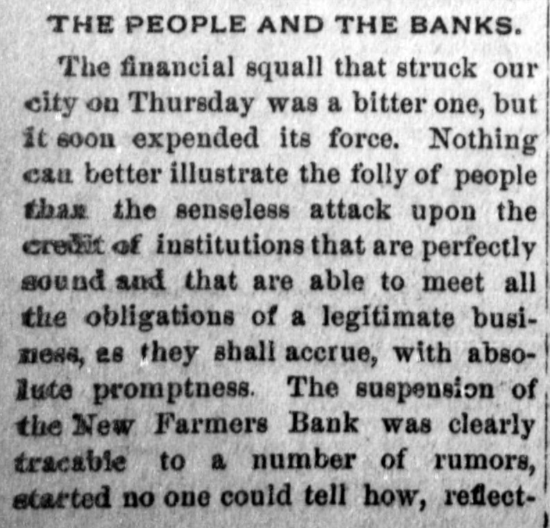 On mers Bank failed to open its doors for business. The news quickly spread over the city and created no little excitement. The steady drain on the ready money of the bank by depositors was more than it could stand and finally it had to succumb to the pressure of circumstances and suspend pay ment. For the last four months there has been a shrinking of the deposits, and since it seemed impossible to realize on its paper. There was nothing else left to be done but to close its doors. The liabilities of the bank reach $300,000, and it has in available assets over $600,000. There can be no question but that every depositor will be paid in full, and there is good ground for the belief that the stockholders will lose little or nothing. This bank has been the special favorite for the deposit of the fund of widows, guardians and estates, and has always enjoyed the confidence of the community. It was a heavy blow to the more helpless portion of the community when it was forced to the wall. The scenes were pitiable when women looked the situation in the face and felt their strong rock of business defense was taken from them. The closing of the doors of the New Farmers Bank was the signal for a run on the other banks. The drain on all of them was heavy, but the Traders Deposit seemed to be the special point of attack. All day long the tellers stood at the counters and paid out the money in a steady strèam till the hour for closing. Not one sign ef weakening was seen in the face of any official of the bank; but after closing hours the directory thought it better to suspend payment than to face the certainty of the continnation of the run of the day. No bank, however strong, could stand such a drain on its available cash. Therefore the officials reluctantly decided to give up the unequal fight and make an assignment. The deed of trust was made at 5 :40 o'clock to James M. Bigstaff. Thus in one day M. Sterling saw two of her staunch business enterprises driven to the wall. The condition of the bank is in every respect good. It has $390,000 of good paper and liabilities to the amount of only $150,000There is no reason in the world why this bank should not be on its feet again in a very short time.
