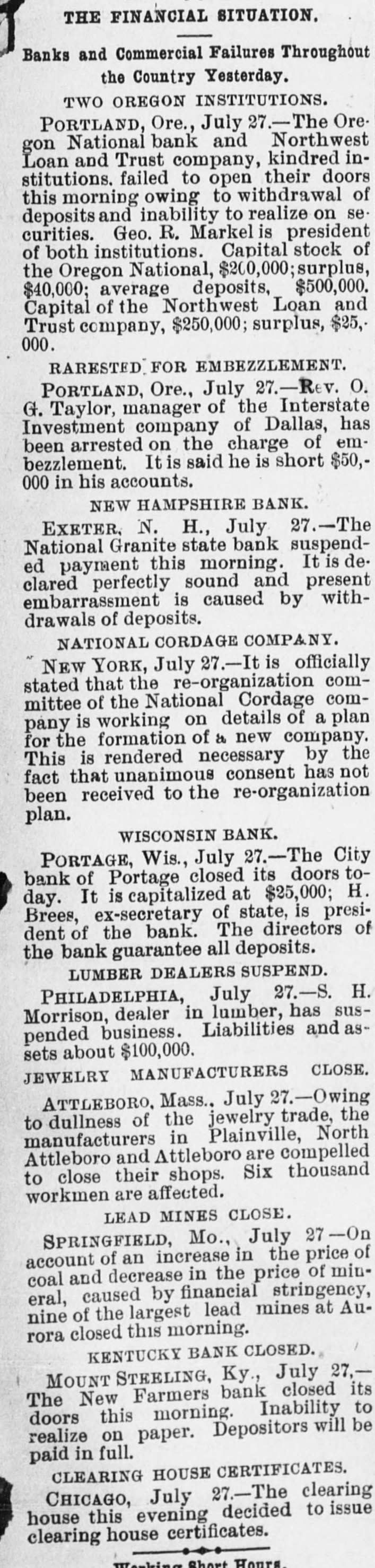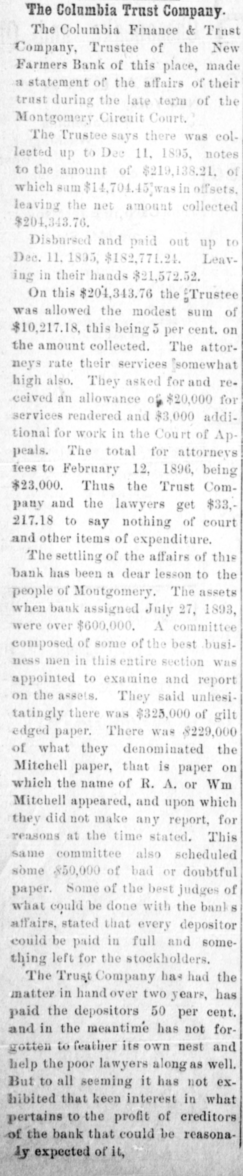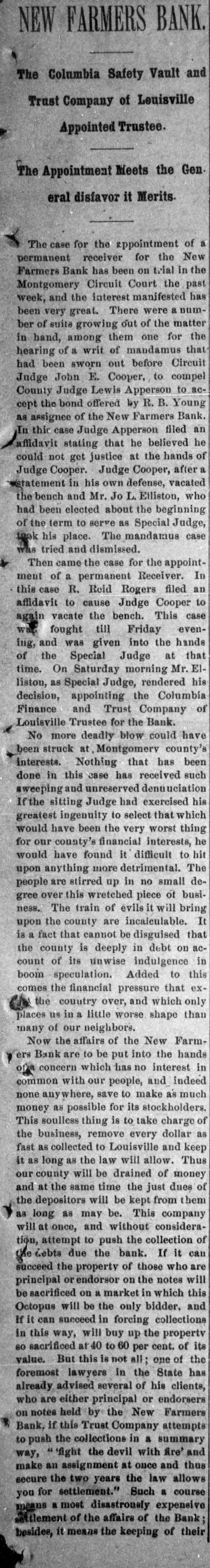 On mers Bank failed to open its doors for business. The news quickly spread over the city and created no little excitement. The steady drain on the ready money of the bank by depositors was more than it could stand and finally it had to succumb to the pressure of circumstances and suspend pay ment. For the last four months there has been a shrinking of the deposits, and since it seemed impossible to realize on its paper. There was nothing else left to be done but to close its doors. The liabilities of the bank reach $300,000, and it has in available assets over $600,000. There can be no question but that every depositor will be paid in full, and there is good ground for the belief that the stockholders will lose little or nothing. This bank has been the special favorite for the deposit of the fund of widows, guardians and estates, and has always enjoyed the confidence of the community. It was a heavy blow to the more helpless portion of the community when it was forced to the wall. The scenes were pitiable when women looked the situation in the face and felt their strong rock of business defense was taken from them. The closing of the doors of the New Farmers Bank was the signal for a run on the other banks. The drain on all of them was heavy, but the Traders Deposit seemed to be the special point of attack. All day long the tellers stood at the counters and paid out the money in a steady strèam till the hour for closing. Not one sign ef weakening was seen in the face of any official of the bank; but after closing hours the directory thought it better to suspend payment than to face the certainty of the continnation of the run of the day. No bank, however strong, could stand such a drain on its available cash. Therefore the officials reluctantly decided to give up the unequal fight and make an assignment. The deed of trust was made at 5 :40 o'clock to James M. Bigstaff. Thus in one day M. Sterling saw two of her staunch business enterprises driven to the wall. The condition of the bank is in every respect good. It has $390,000 of good paper and liabilities to the amount of only $150,000There is no reason in the world why this bank should not be on its feet again in a very short time.