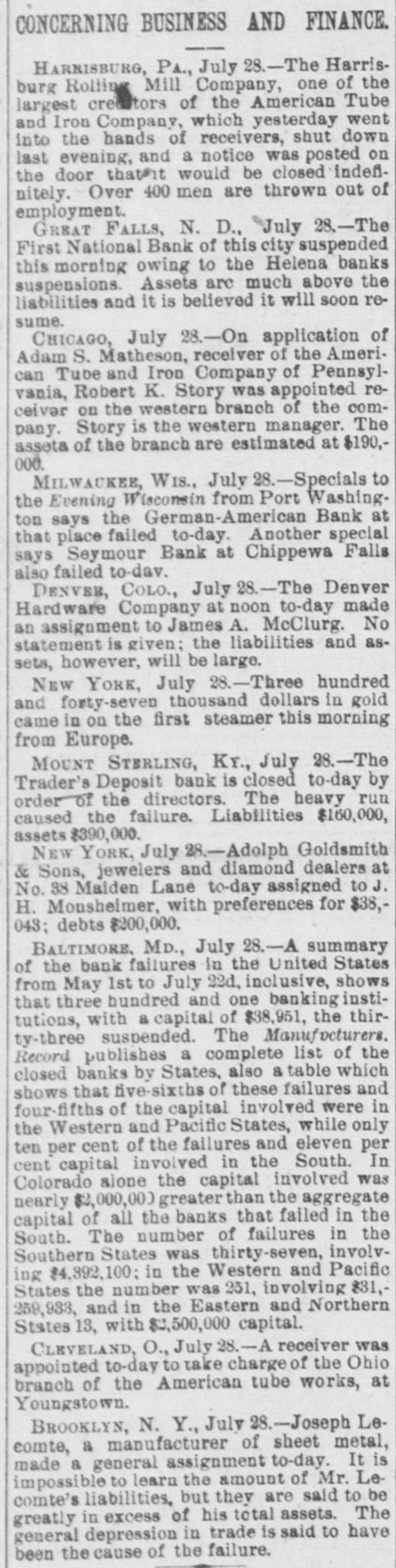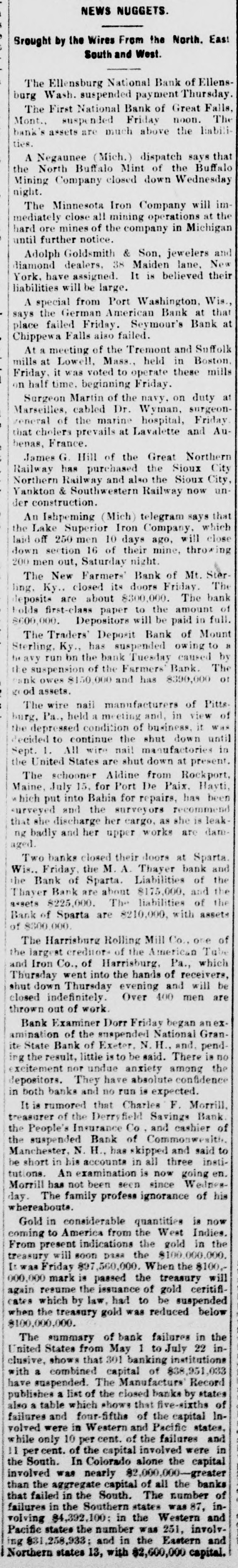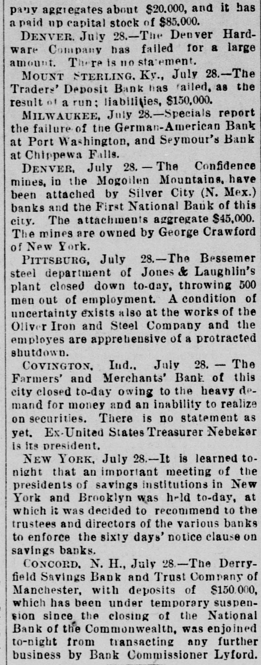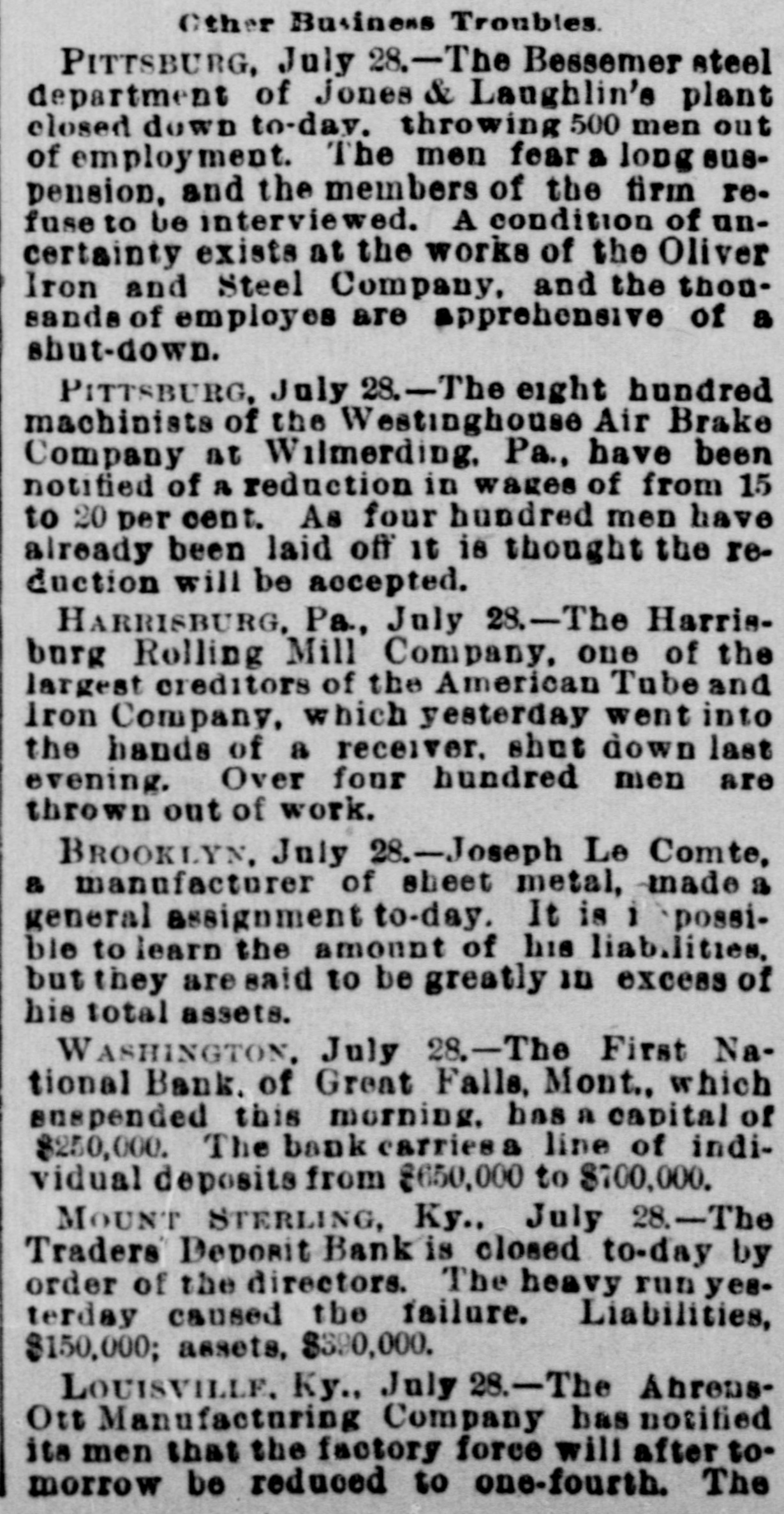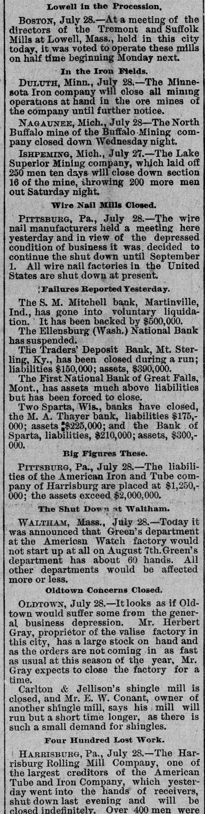 Lowell in the Procession, BOSTON, July 28.-At a meeting of the directors of the Tremont and Suffolk Mills at Lowell, Mass., held in this city today, it was voted to operate these mills on half time beginning Monday next. In the Iron Fields. DULUTH, Minn., July 28.-The Minnesota Iron company will close all mining operations at hand in the ore mines of the company until further notice. NAGAUNEE, Mich., July 28-The North Buffalo mine of the Buffalo-Mining company closed down Wednesday night. ISHPEMING, Mich., July 27.-The Lake Superior Mining company, which laid off 250 men ten days will close down section 16 of the mine, throwing 200 more men out Saturday night. Wire Nail Mills Closed. PITTSBURG, Pa., July 28.-The wire nail manufacturers held a meeting here yesterday and in view of the depressed condition of business it was. decided to continue the shut down until September 1. All wire nail factories in the United States are shut down at present. Failures Reported Yesterday. The S. M. Mitchell bank, Martinville, Ind., has gone into voluntary liquidation. It has been backed by $500,000. The Ellensburg (Wash.) National Bank has suspended. The Traders' Deposit Bank, Mt. Sterling, Ky., has been closed during a run; liabilities $150,000; assets, $390,000. The First National Bank of Great Falls, Mont., has assets much above liabilities but has been forced to close. Two Sparta, Wis., banks have closed, the M. A. Thayer bank, liabilities $175,000; assets $225,000; and the Bank of Sparta, liabilities, $210,000; assets, $300,000. Big Figures These. PITTSBURG, Pa., July 28.-The liabilities of the American Iron and Tube company of Harrisburg are placed at $1,250,000; the assets exceed $2,000,000. The Shut Down at Waltham. WALTHAM, Mass., July 28.-Today it was announced that Green's department at the Americsn Watch factory would not start up at all on August 7th.Green's department has about 60 hands. All other departments would be affected more or less. Oldtown Concerns Closed. OLDTOWN, July 28.-Itlooks as if Oldtown would suffer some from the general business depression. Mr. Herbert Gray, proprietor of the valise factory in this city, has a large stock on hand and as the orders are not coming in as fast as usual at this season of the year, Mr. Gray expects to close the factory for a time. Carlton & Jellison's shingle mill is closed, and Mr. E. W. Conant, owner of another shingle mill, says his mill will run but a short time longer, as there is such a small demand for shingles. Four Hundred Lost Work. HARRISBURG, Pa., July 28.-The Harrisburg Rolling Mill Company, one of the largest creditors of the American Tube and Iron Company, which yesterday went into the hands of receivers, shut down last evening and will be closed indefinitely. Over 400 men were
